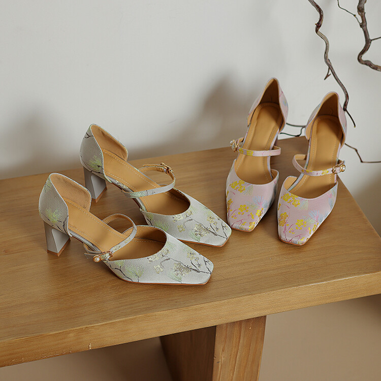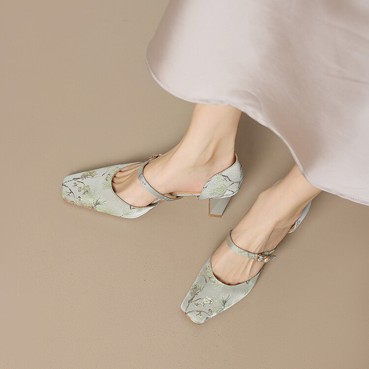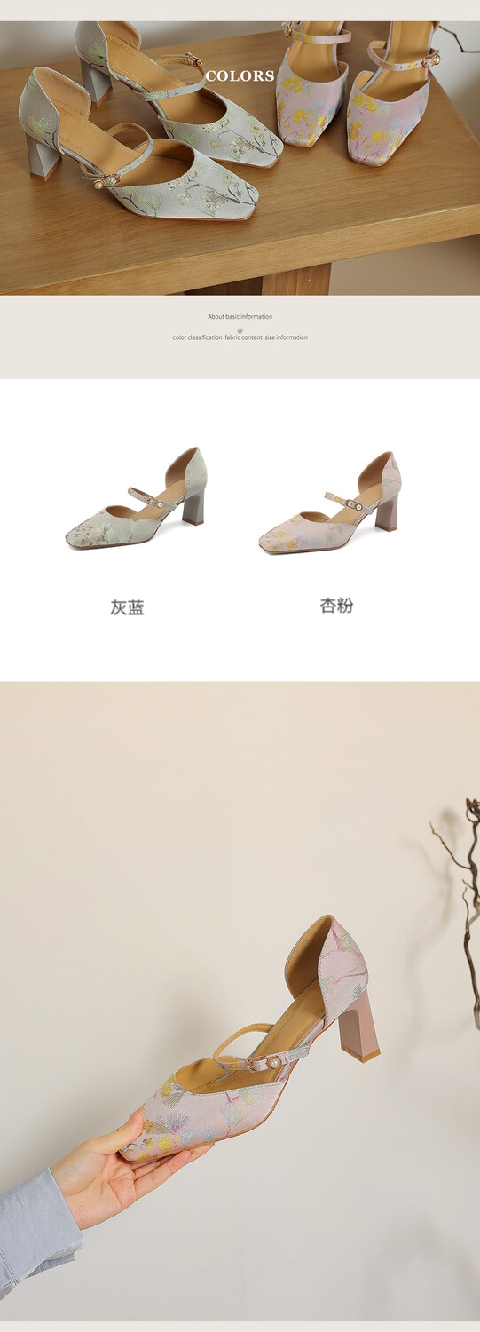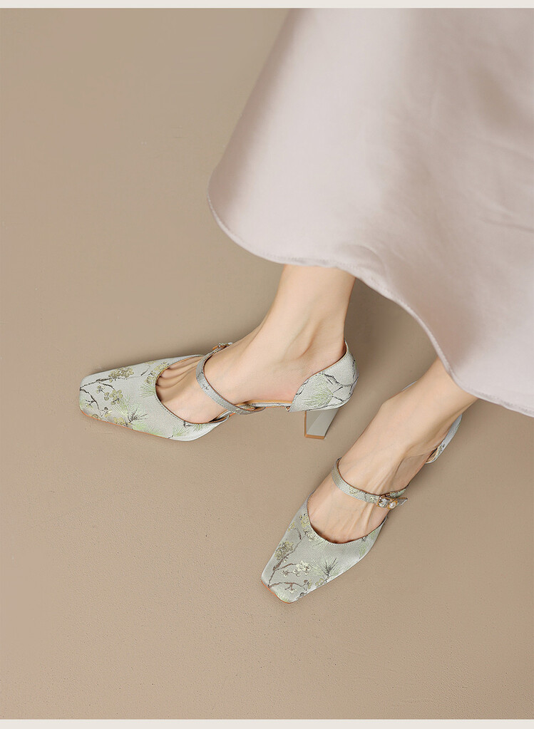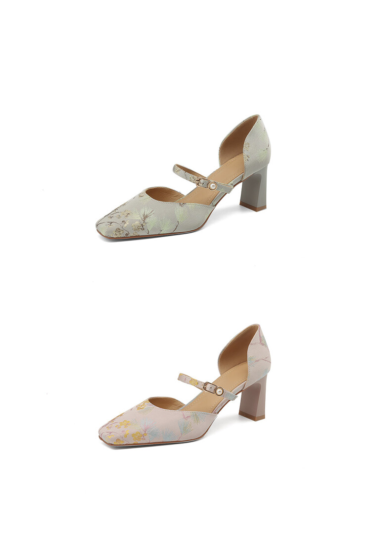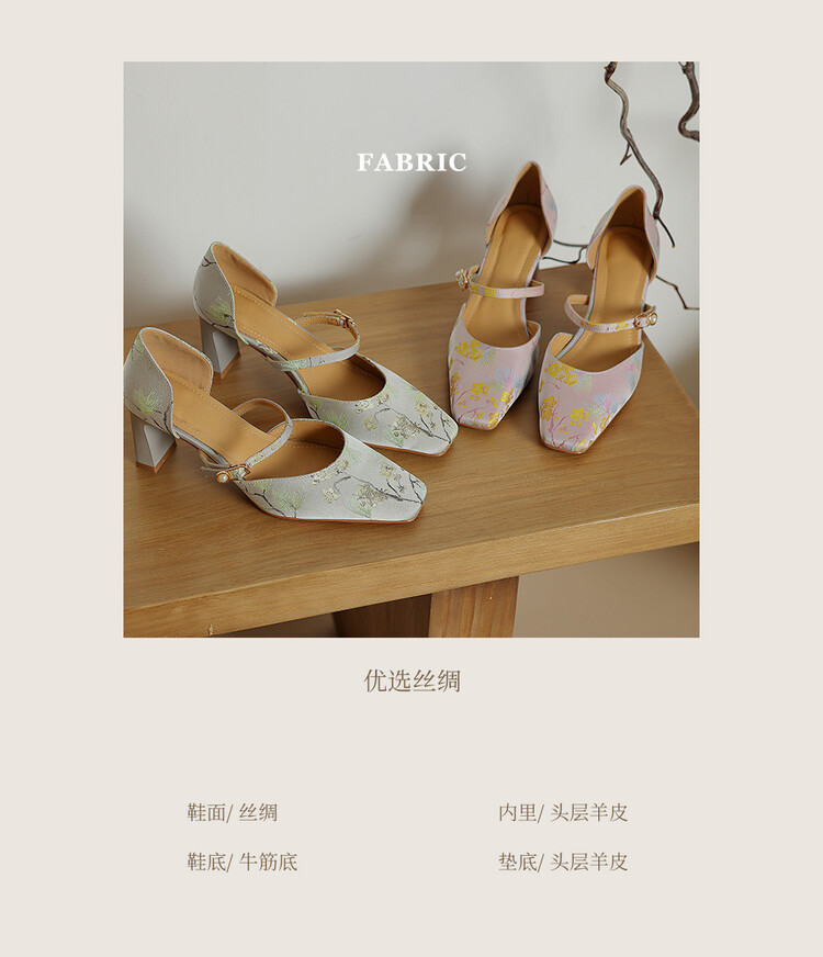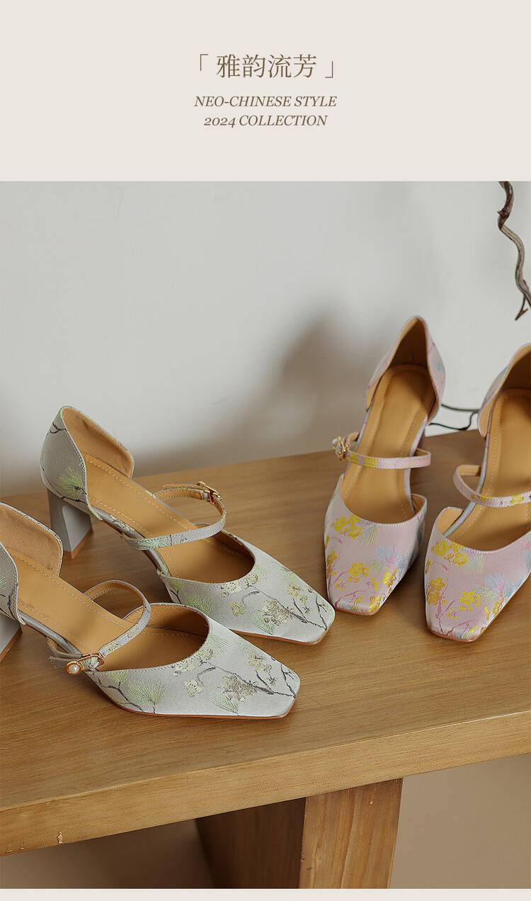 【预售5天】新中式缎面丝绸提花粗高跟方头真皮中空玛丽珍凉鞋女WC&M2318