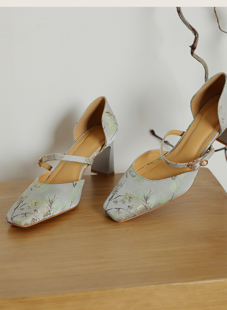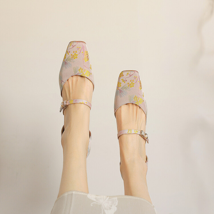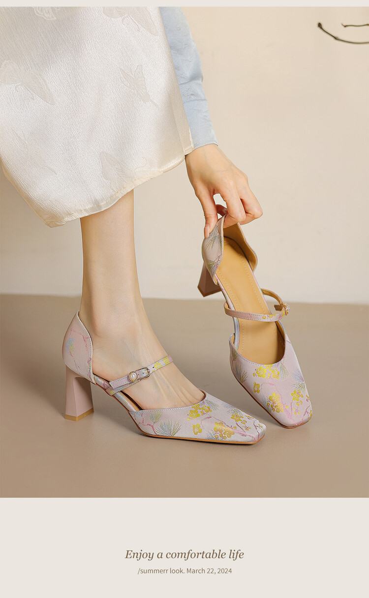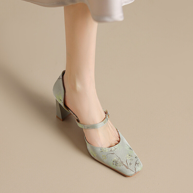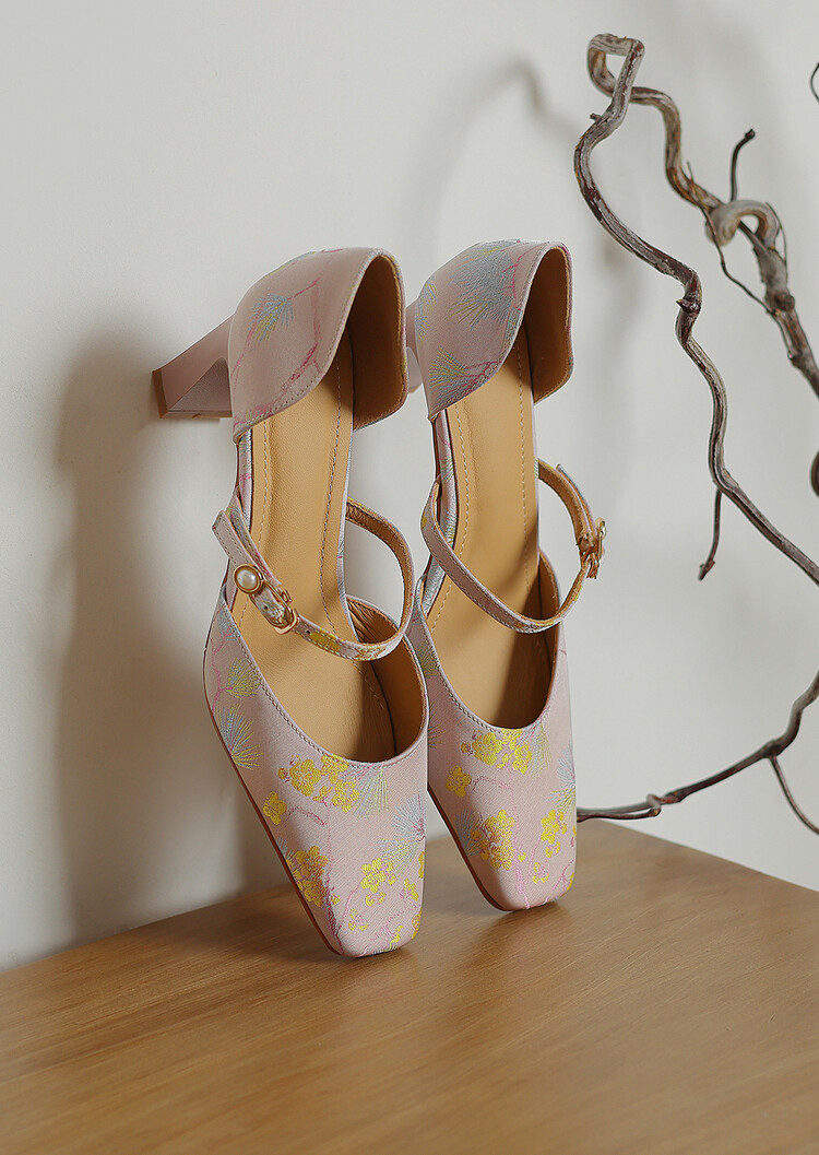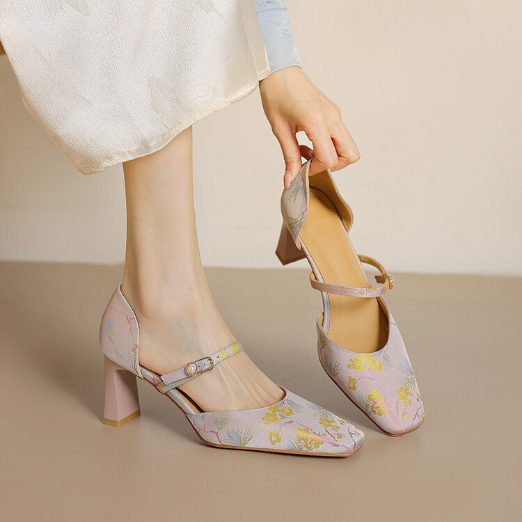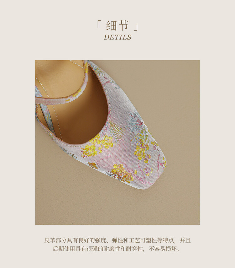 【预售5天】新中式缎面丝绸提花粗高跟方头真皮中空玛丽珍凉鞋女WC&M2318