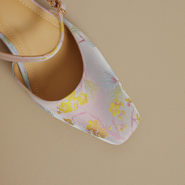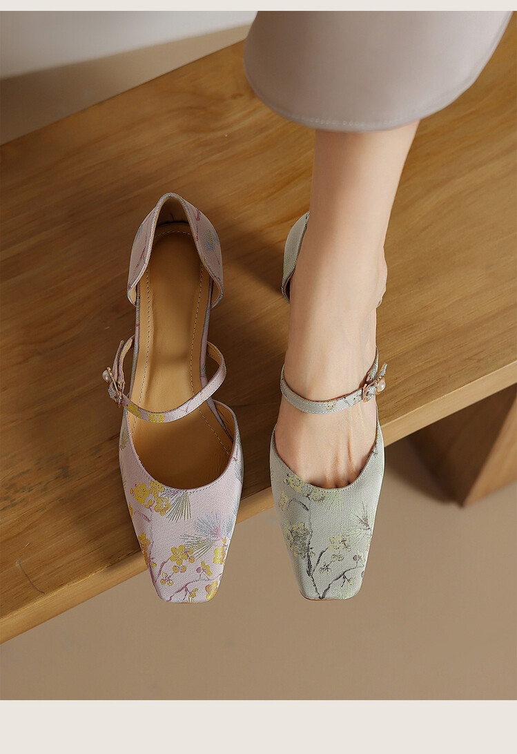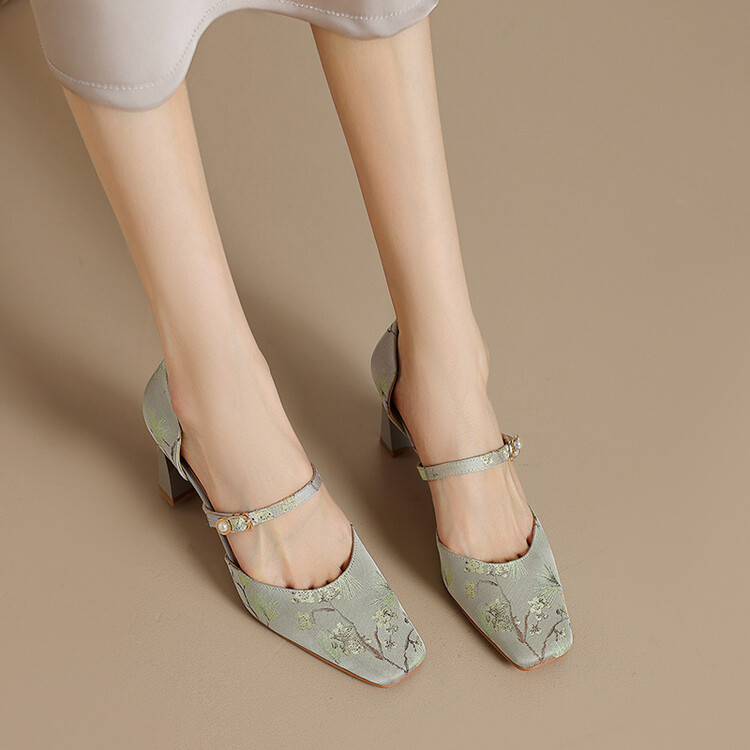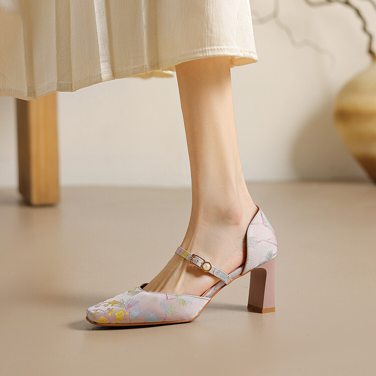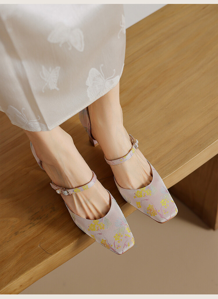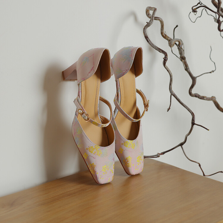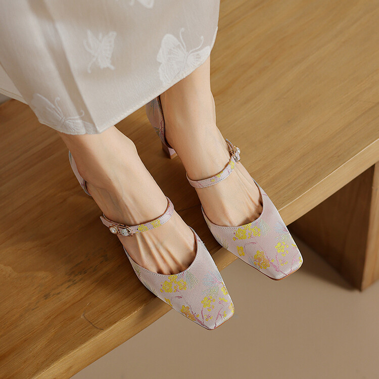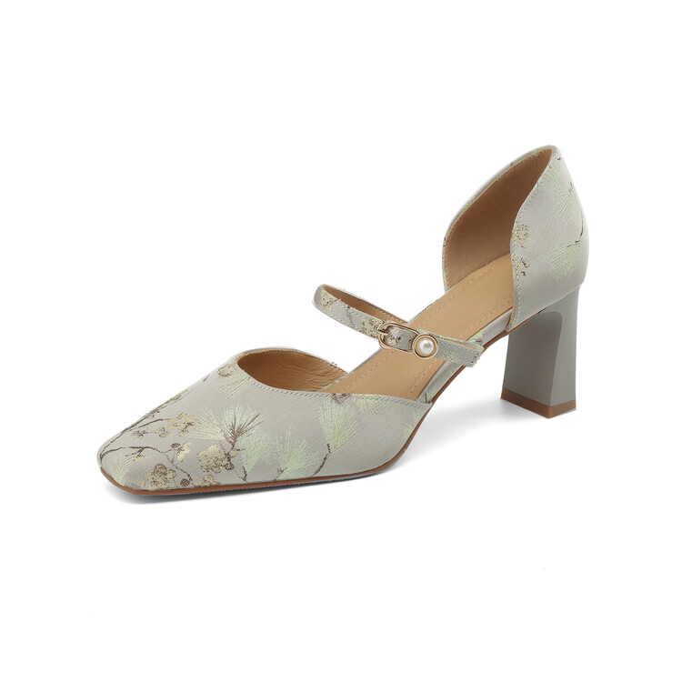 【预售5天】新中式缎面丝绸提花粗高跟方头真皮中空玛丽珍凉鞋女WC&M2318