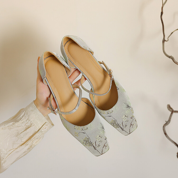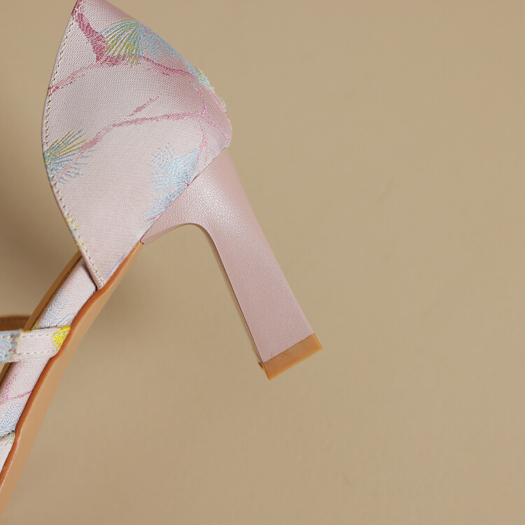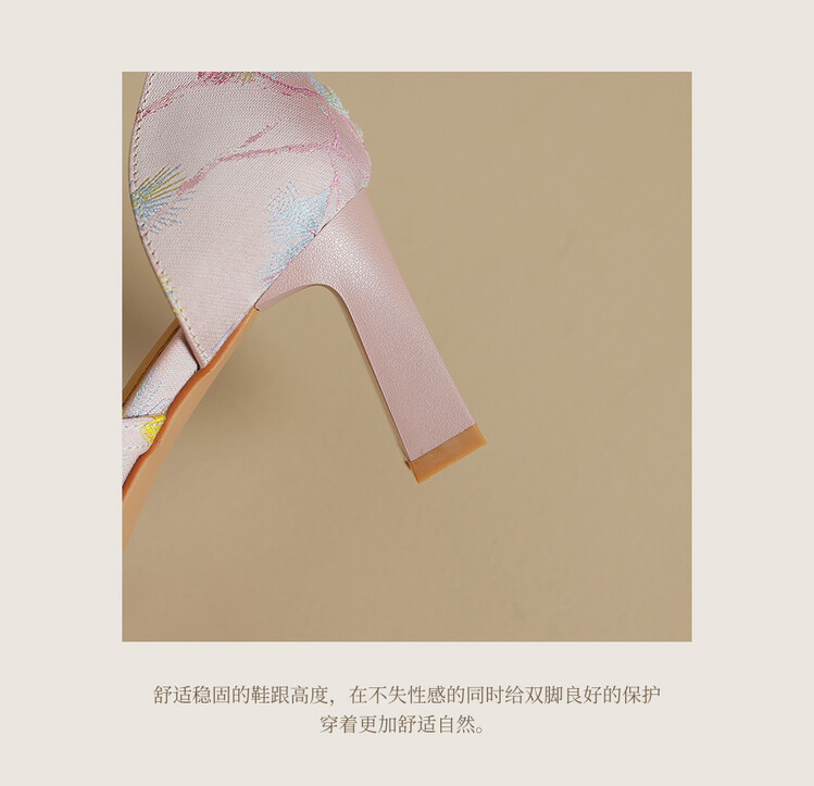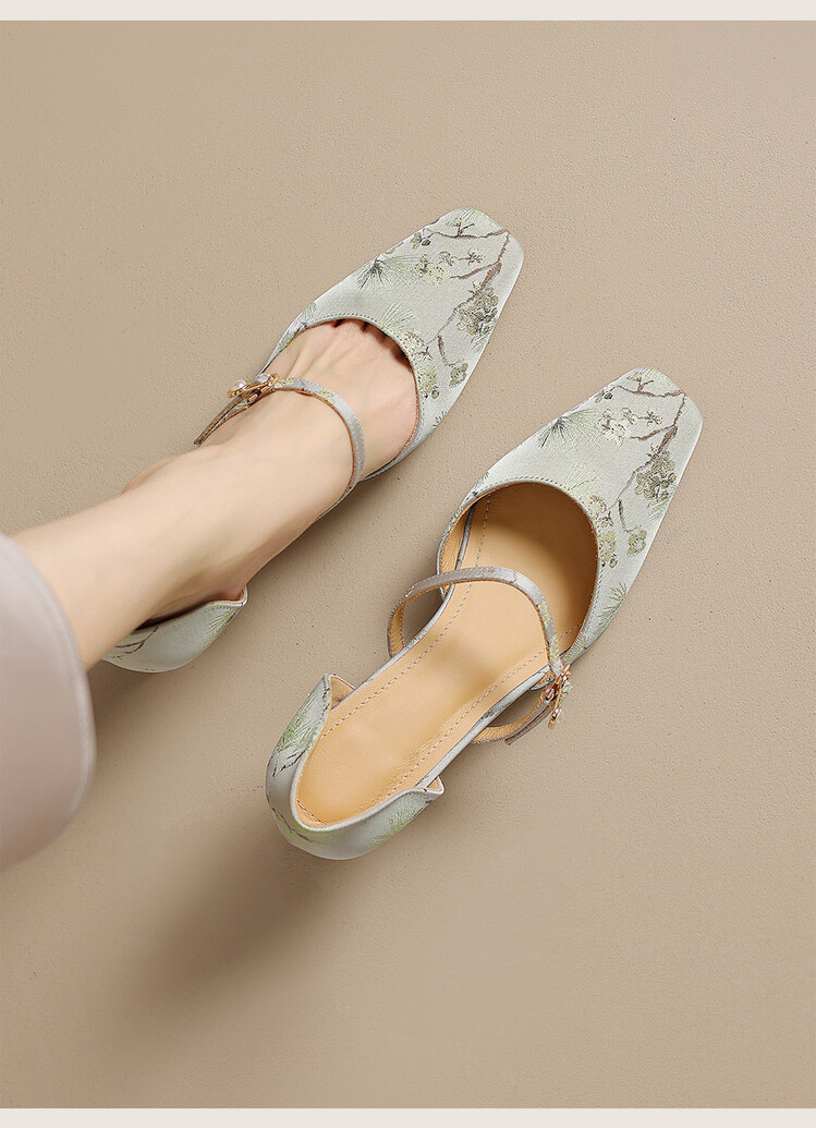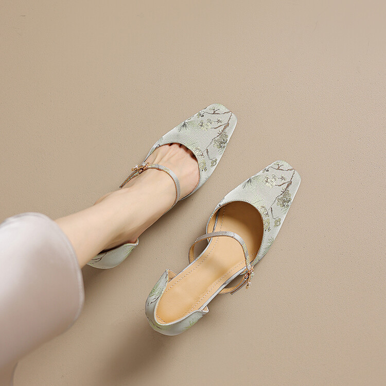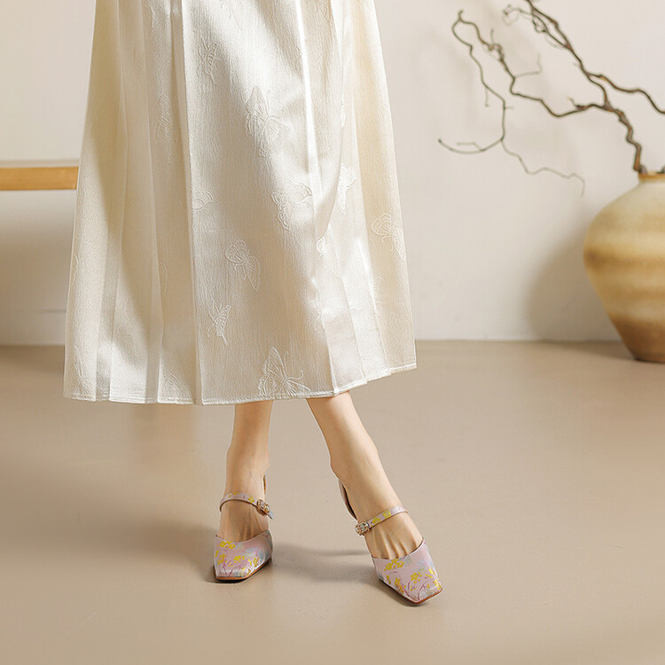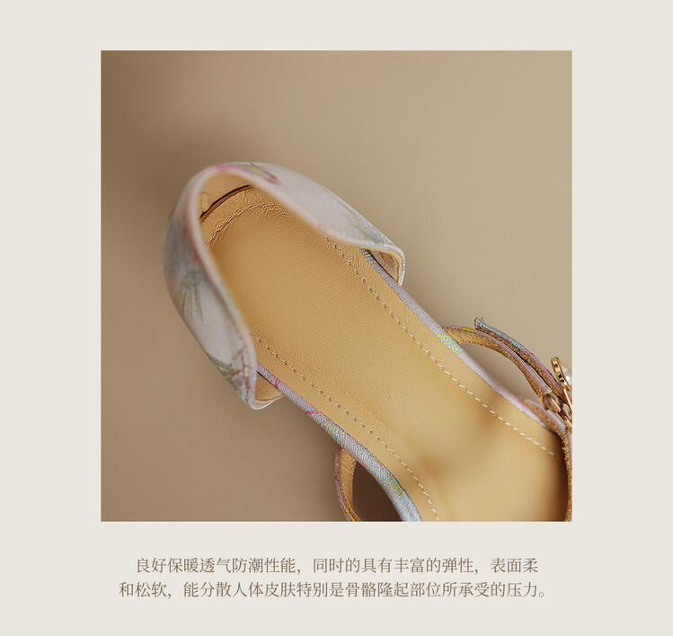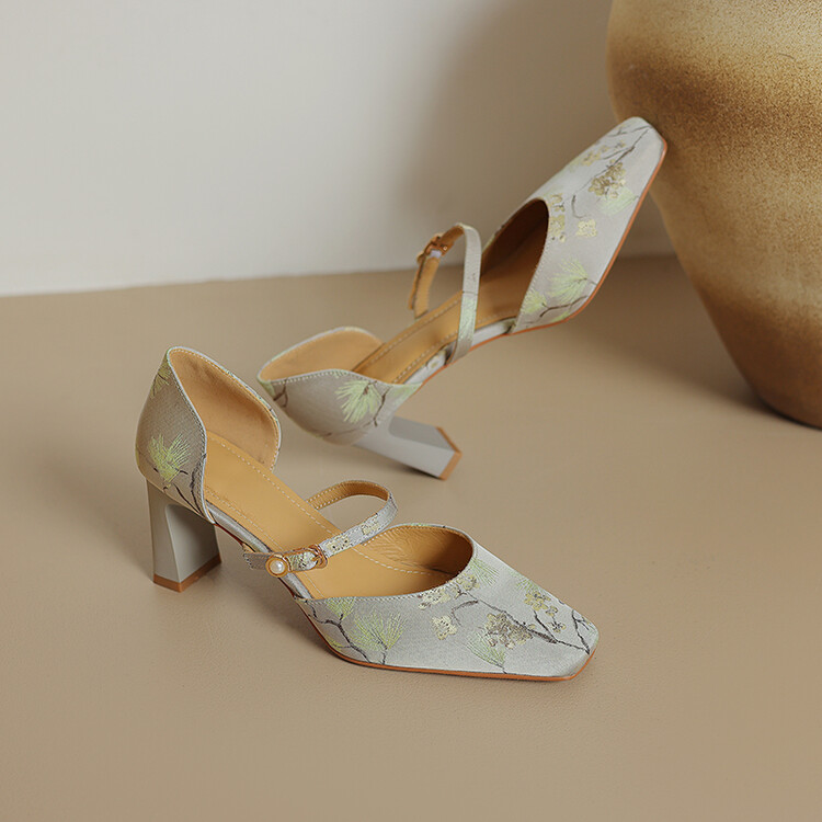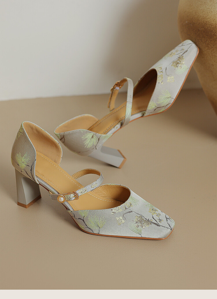【预售5天】新中式缎面丝绸提花粗高跟方头真皮中空玛丽珍凉鞋女WC&M2318