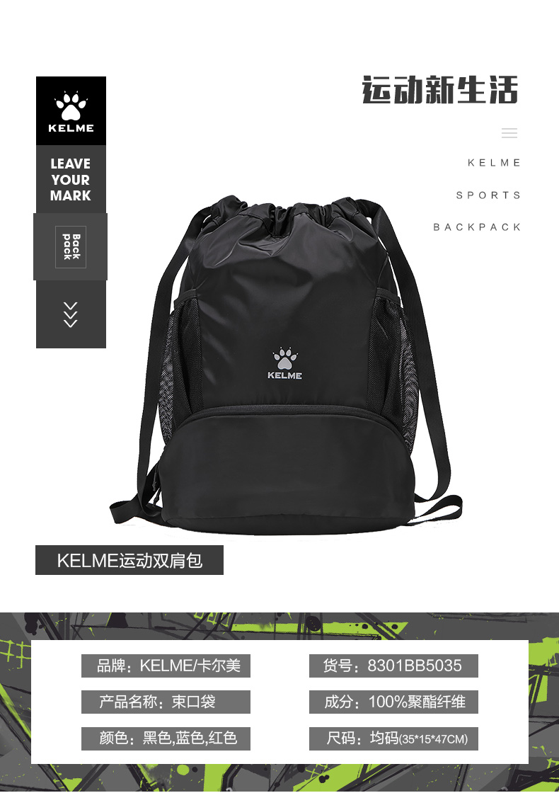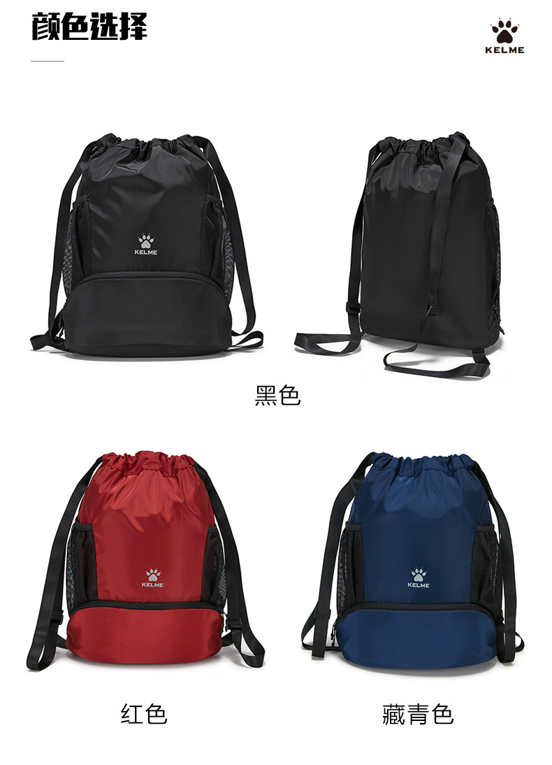 KELME卡尔美 新款束口袋抽绳双肩背包旅行背包收纳袋健身包运动包