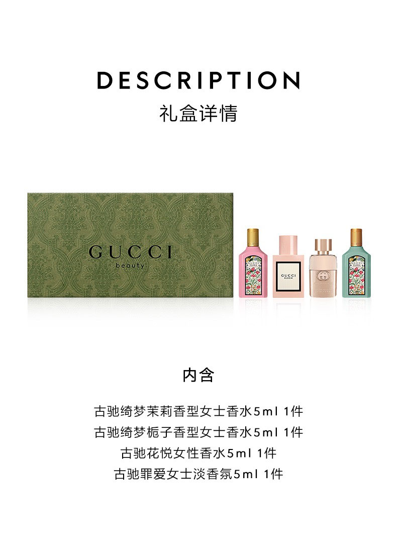 【直邮】七夕礼盒GUCCI/古驰全家福10+4小样套盒滚珠/古驰迷你香氛礼盒装四件套5ml*4瓶(绮梦茉莉罪爱女士花悦绮梦栀子)(无喷头)