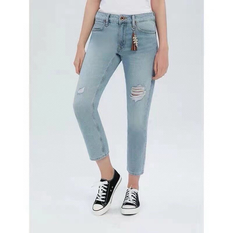 女士磨白破洞牛仔裤!骑士系列 女士浅蓝色水洗磨白破洞直筒小脚9分裤,女士百搭春夏男友风牛仔裤。