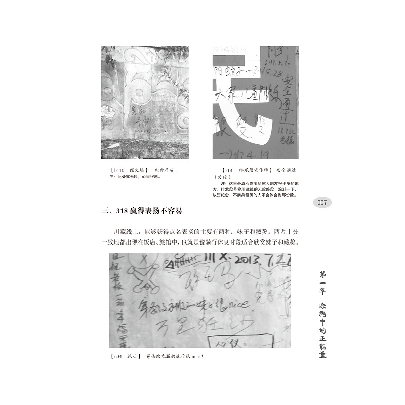 而本选题索要研究的对象,川藏线上的涂鸦尚属于涂鸦的原始形态——非专业人士的随意性较强的涂写乱画,且用写字签名或较少的色彩描绘,符合原生态涂鸦的特征。这样大规模的原生态涂鸦在中国已不多见,甚至可以说是绝无仅有,更显研究的必要性。
