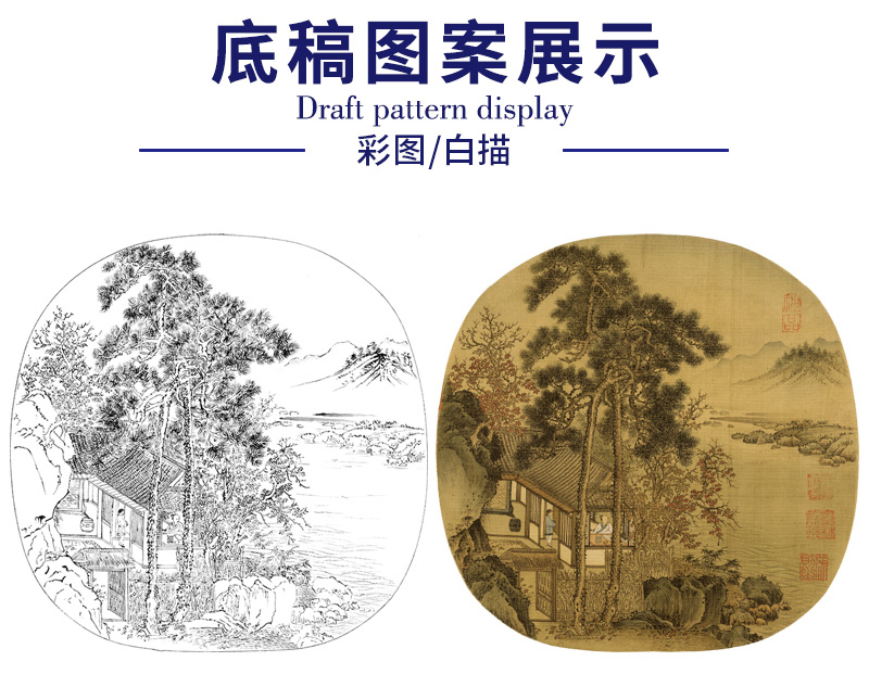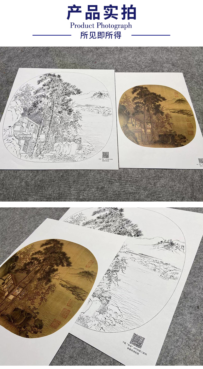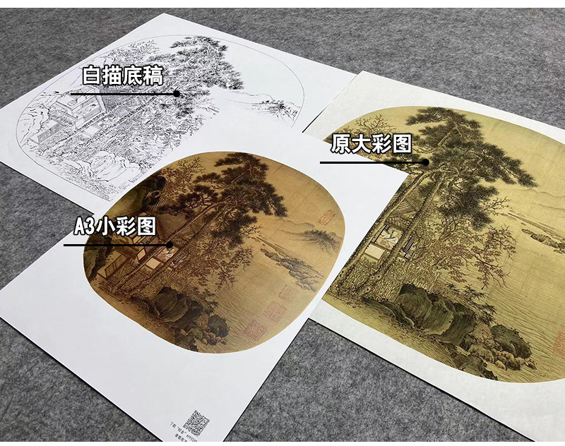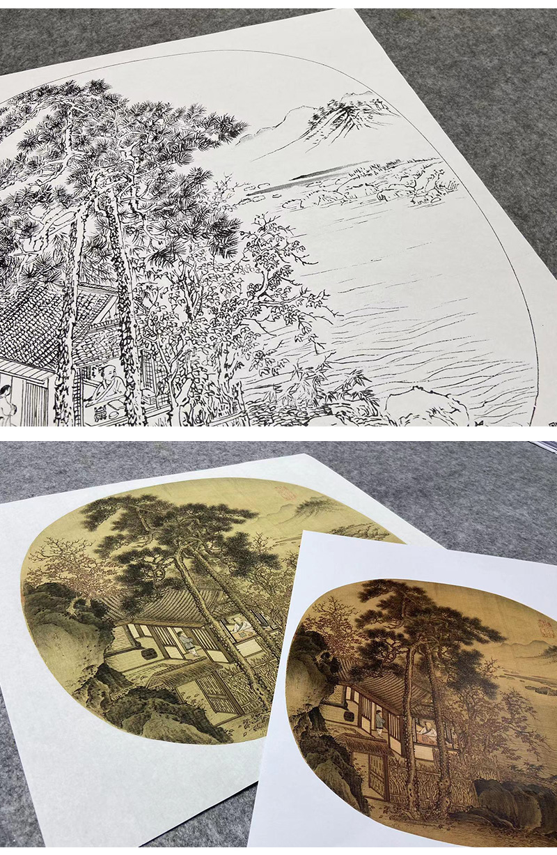 【大彩图】刘松年工笔画白描底稿宋画小品《秋窗读书图》临摹勾线人物山水线稿GS05