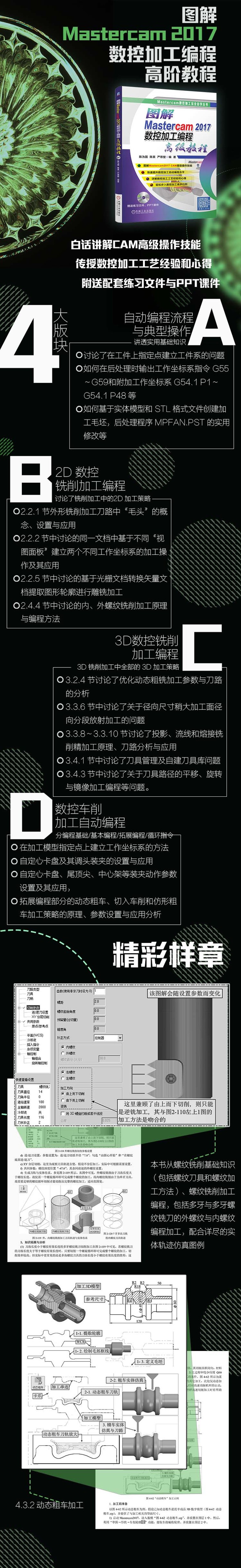 《图解Mastercam 2017数控加工编程高级教程》以 Mastercam 2017 版为基础,针对 Mastercam 数控加工自动编程流程与典型操作、2D数控铣削加工编程、3D 数控铣削加工编程以及数控车削加工自动编程展开了讨论,其知识点的覆盖较为全面、完整,其中很多 Mastercam 2017 版加工编程的知识点是同类图书中少有的内容。通过本书的学习,可以使读者全面掌握 Mastercam 2017 的数控加工自动编程技术,并能够完成较为复杂零件的数控加工编程工作。为便于读者学习,《图解Mastercam 2017数控加工编程高级教程》提供练习文件光盘,同时提供配书 PPT 课件(联系 QQ296447532 获取)。本书理论联系实际,较为全面地讨论了加工编程中加工策略、刀具选用与创建、各类参数设置和刀路分析等。书中配有大量的针对性较强的练习示例,可帮助读者高效、快捷地掌握Mastercam 2017 的自动编程功能。《图解Mastercam 2017数控加工编程高级教程》非常适合具备数控加工手工编程基础知识和 Mastercam基础知识的读者,以及希望提高自动编程能力的数控加工技术人员自学使用,也可作为高等学校及培训机构 CAD/CAM 课程的教学用书。