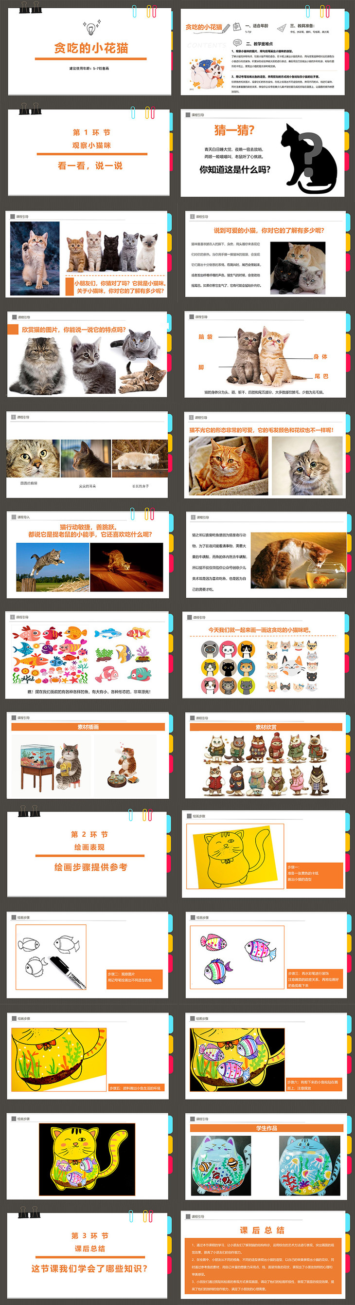 了解小猫的外形特点,欣赏小猫不同的姿态,在卡纸上画出小猫的形态,用马克笔选择相对应的颜色为小猫进行花纹装饰,积累涂色经验并能大胆的进行表述,最后用剪刀剪裁出小猫的外形轮廓,粘贴在圆形的卡纸上,展现出小猫的层次感和视觉感。