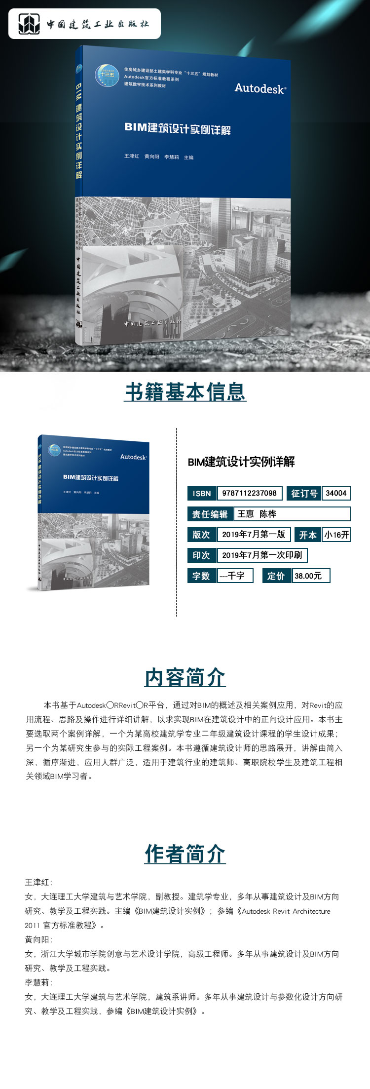 本书基于Autodesk○RRevit○R平台,通过对BIM的概述及相关案例应用,对Revit的应用流程、思路及操作进行详细讲解,以求实现BIM在建筑设计中的正向设计应用。本书主要选取两个案例详解,一个为某高校建筑学专业二年级建筑设计课程的学生设计成果;另一个为某研究生参与的实际工程案例。本书遵循建筑设计师的思路展开,讲解由简入深,循序渐进,应用人群广泛,适用于建筑行业的建筑师、高职院校学生及建筑工程相关领域BIM学习者。