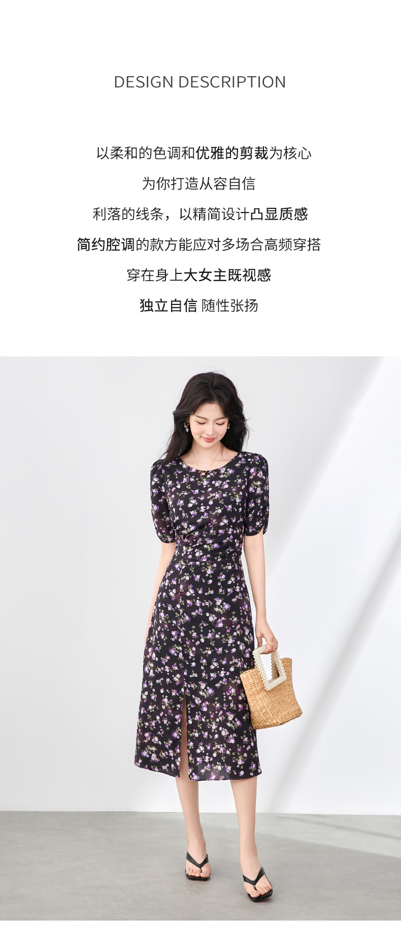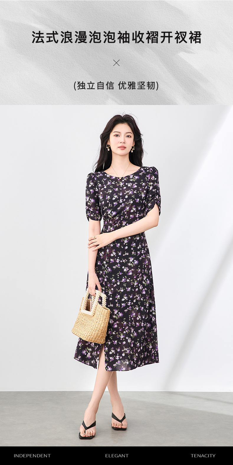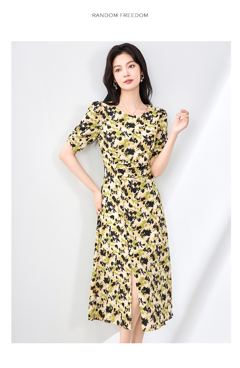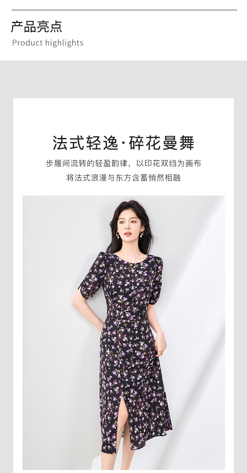 「高货wl」全新升级【铂金会员293/天猫399/差价106】(11937)洛诗琳法式气质印花连衣裙2025夏季收褶开叉收腰优雅裙子