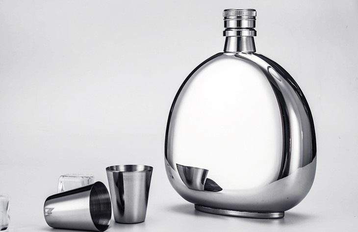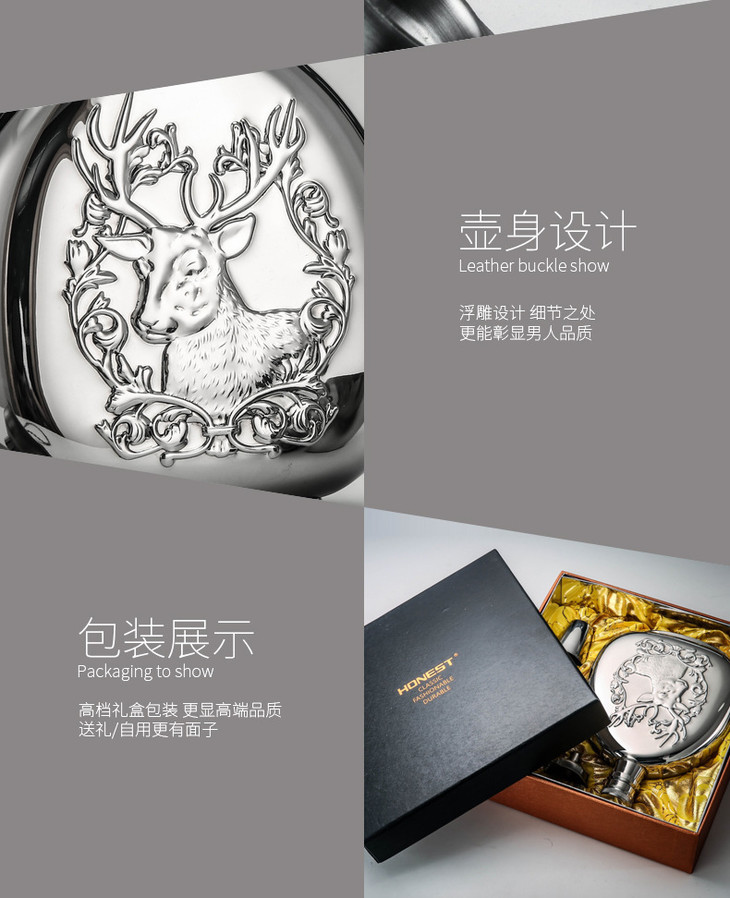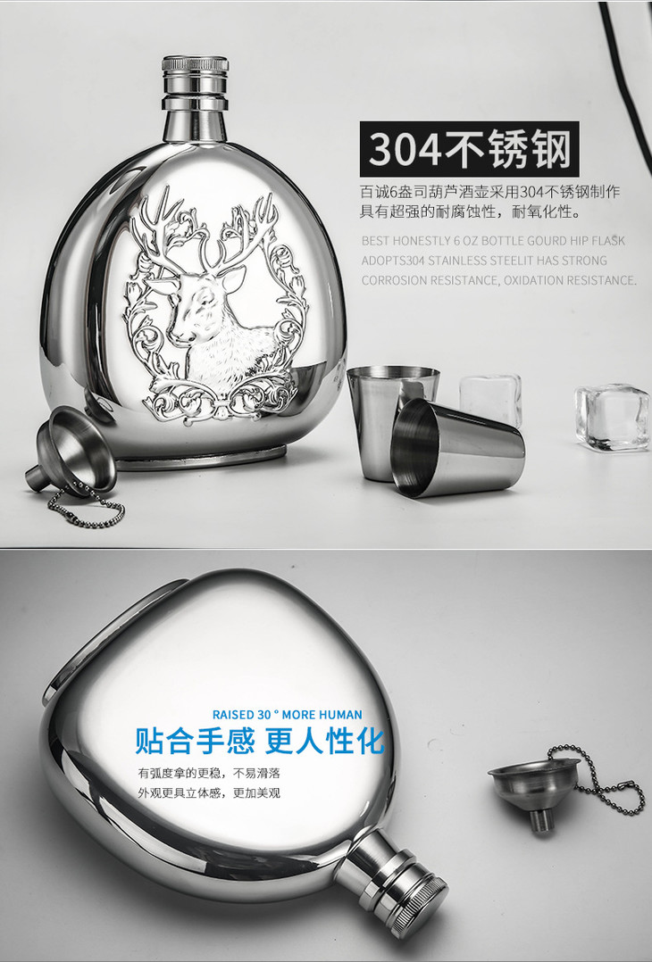 「百诚不锈钢酒壶」鹿头镜光压花酒壶 外贸酒具