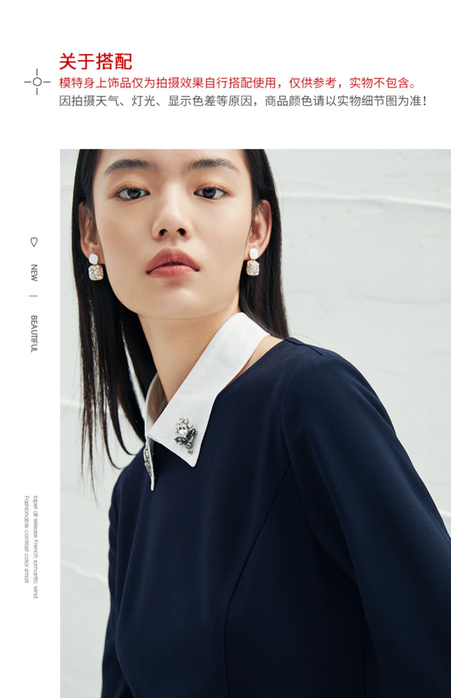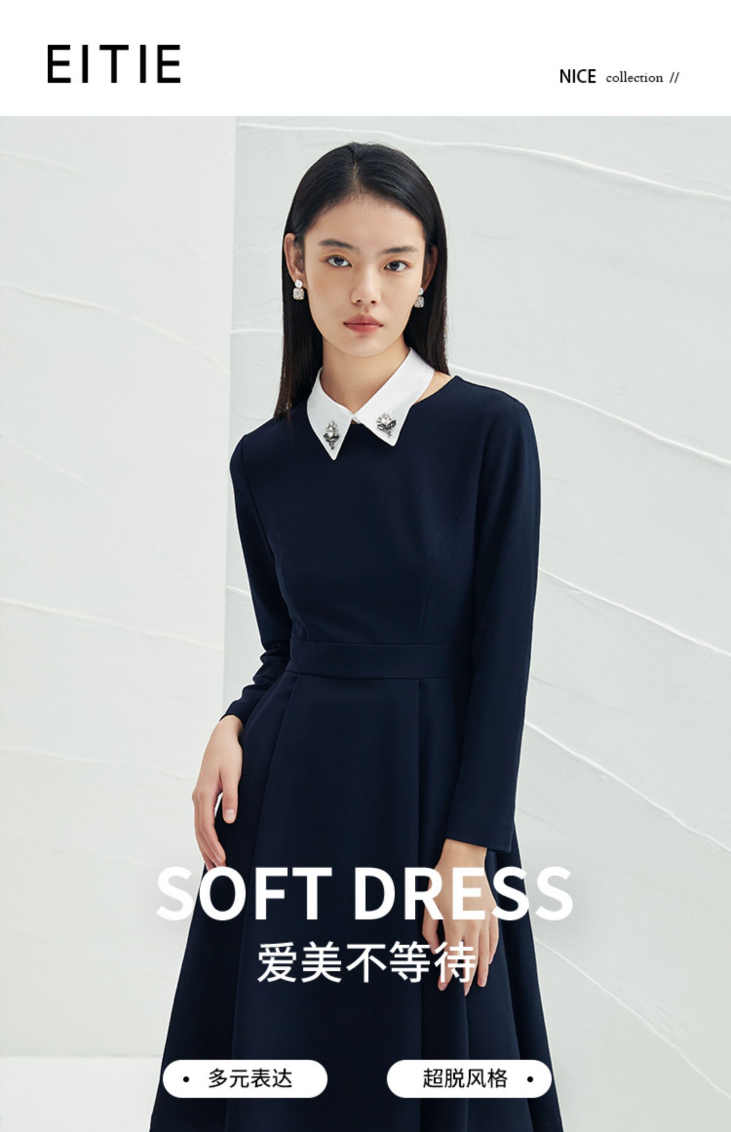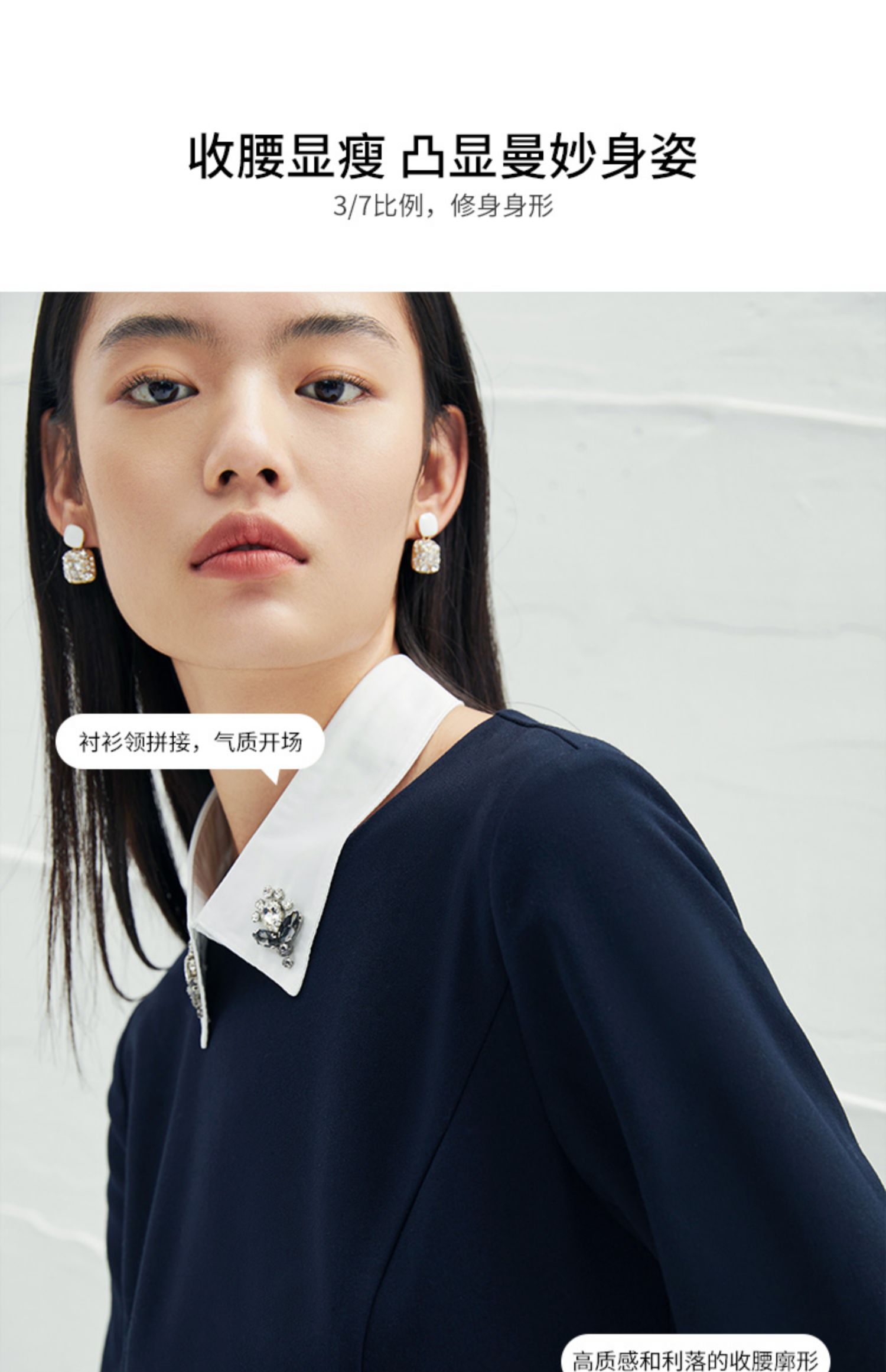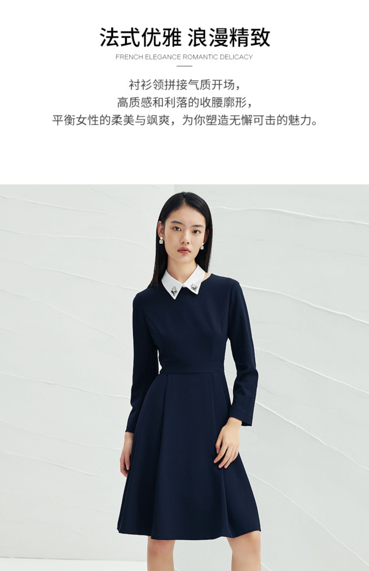 EITIE爱特爱春款新品翻领百衬衫领拼接百搭时尚通勤收腰显瘦连衣裙A2207909