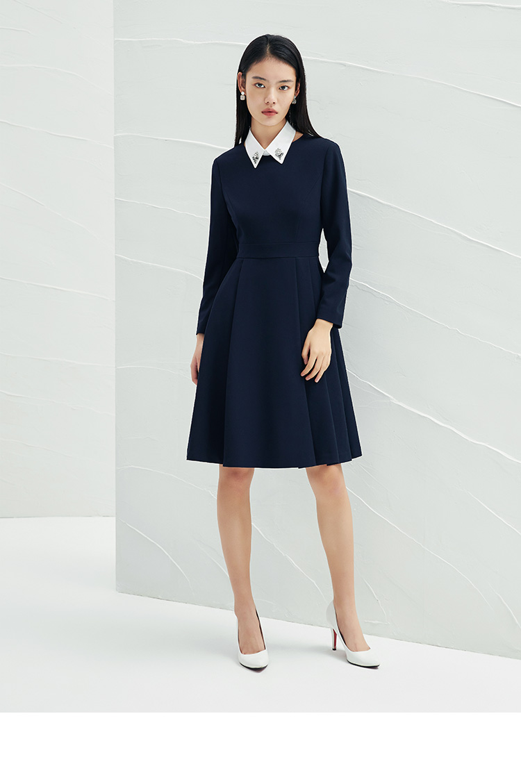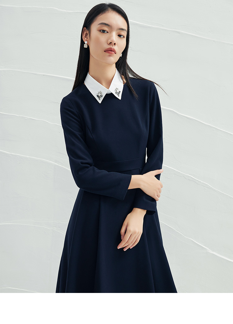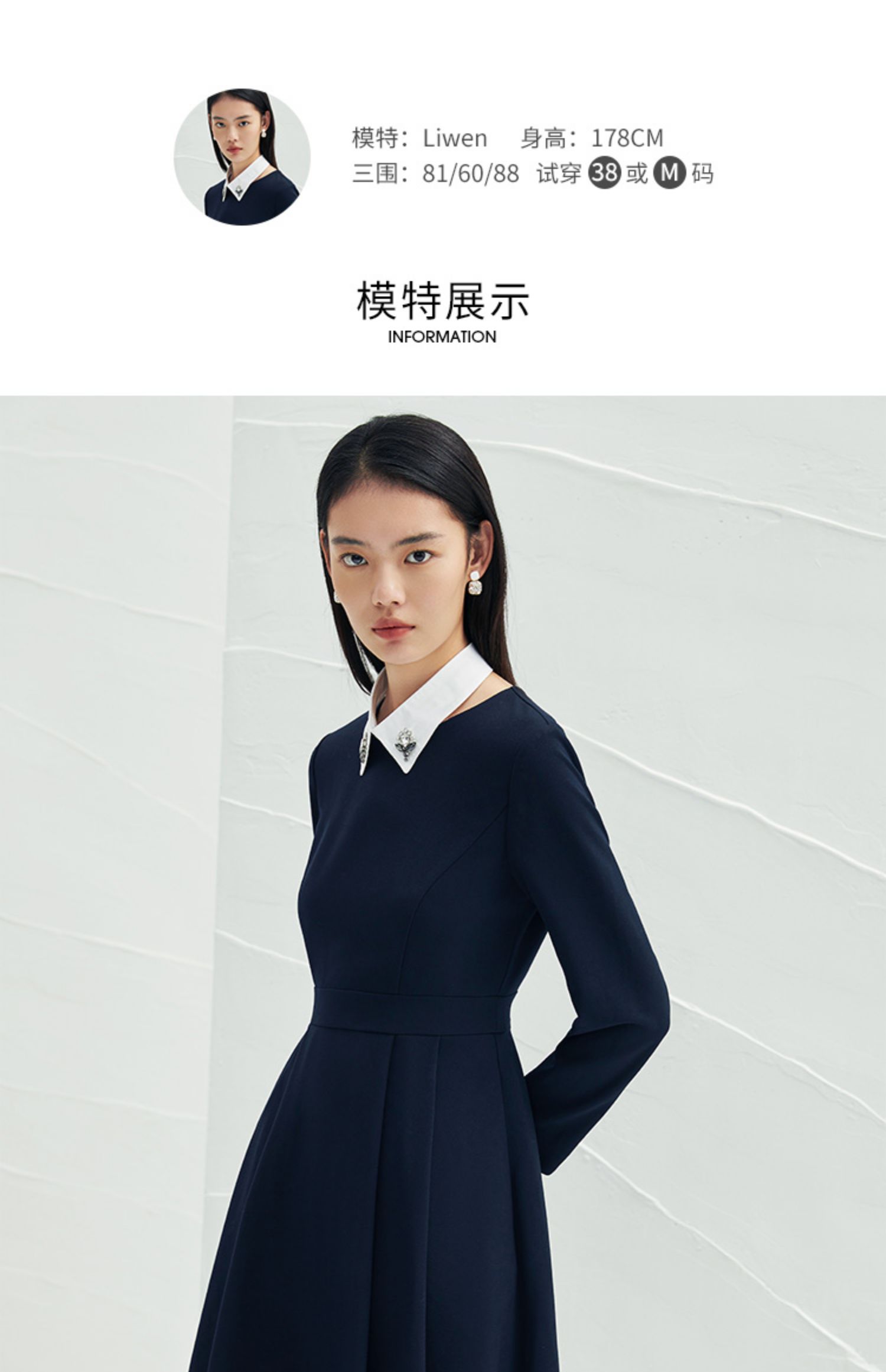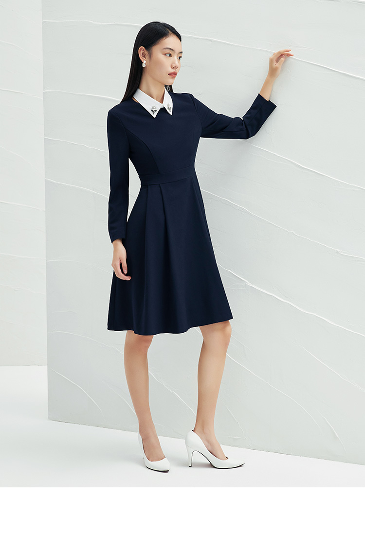 EITIE爱特爱春款新品翻领百衬衫领拼接百搭时尚通勤收腰显瘦连衣裙A2207909