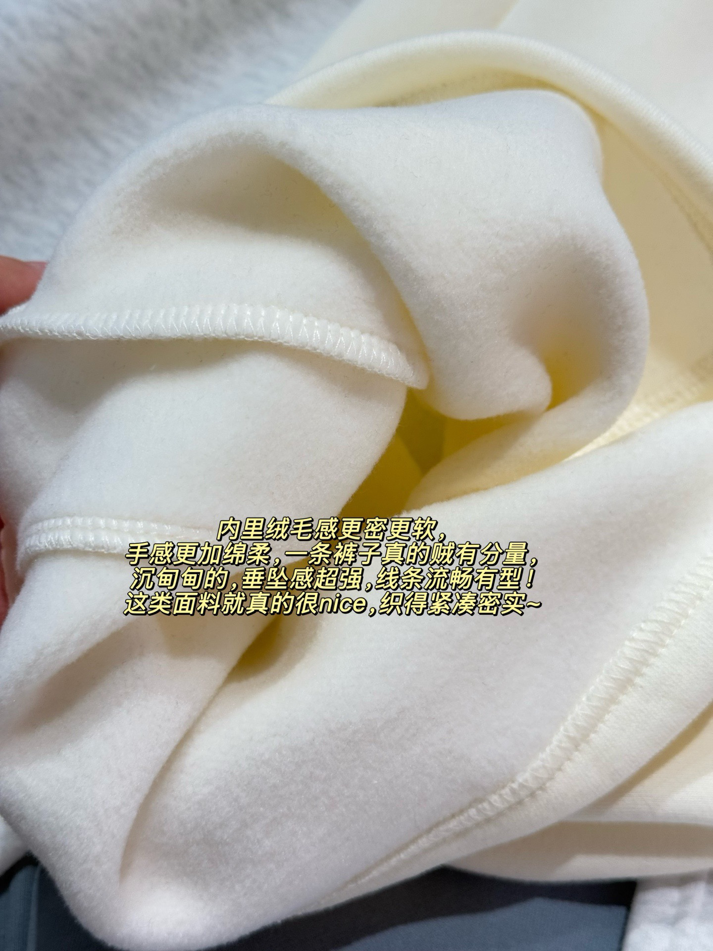 内里绒毛感更密更软,手感更加绵柔,一条裤子真的贼有分量,沉甸甸的,垂坠感超强,线条流畅有型!这类面料就真的很nice,织得紧凑密实~