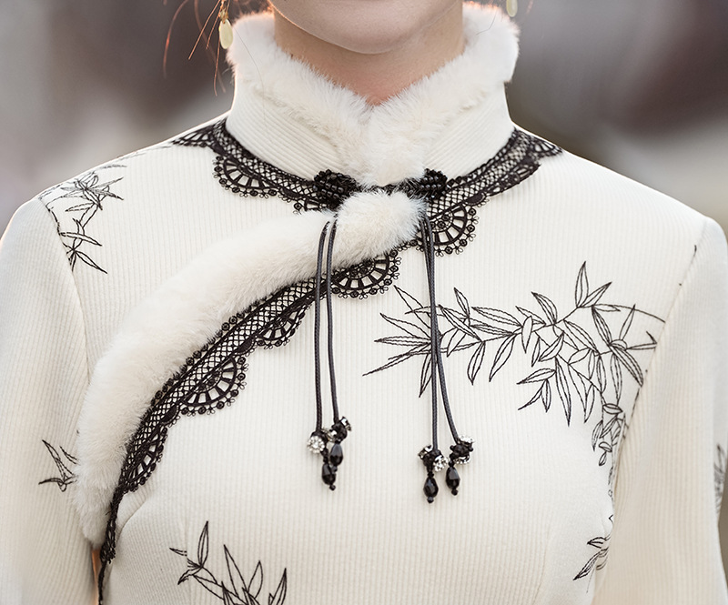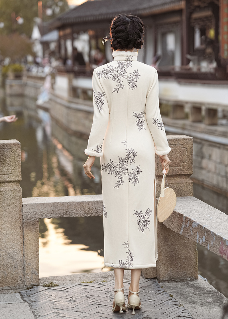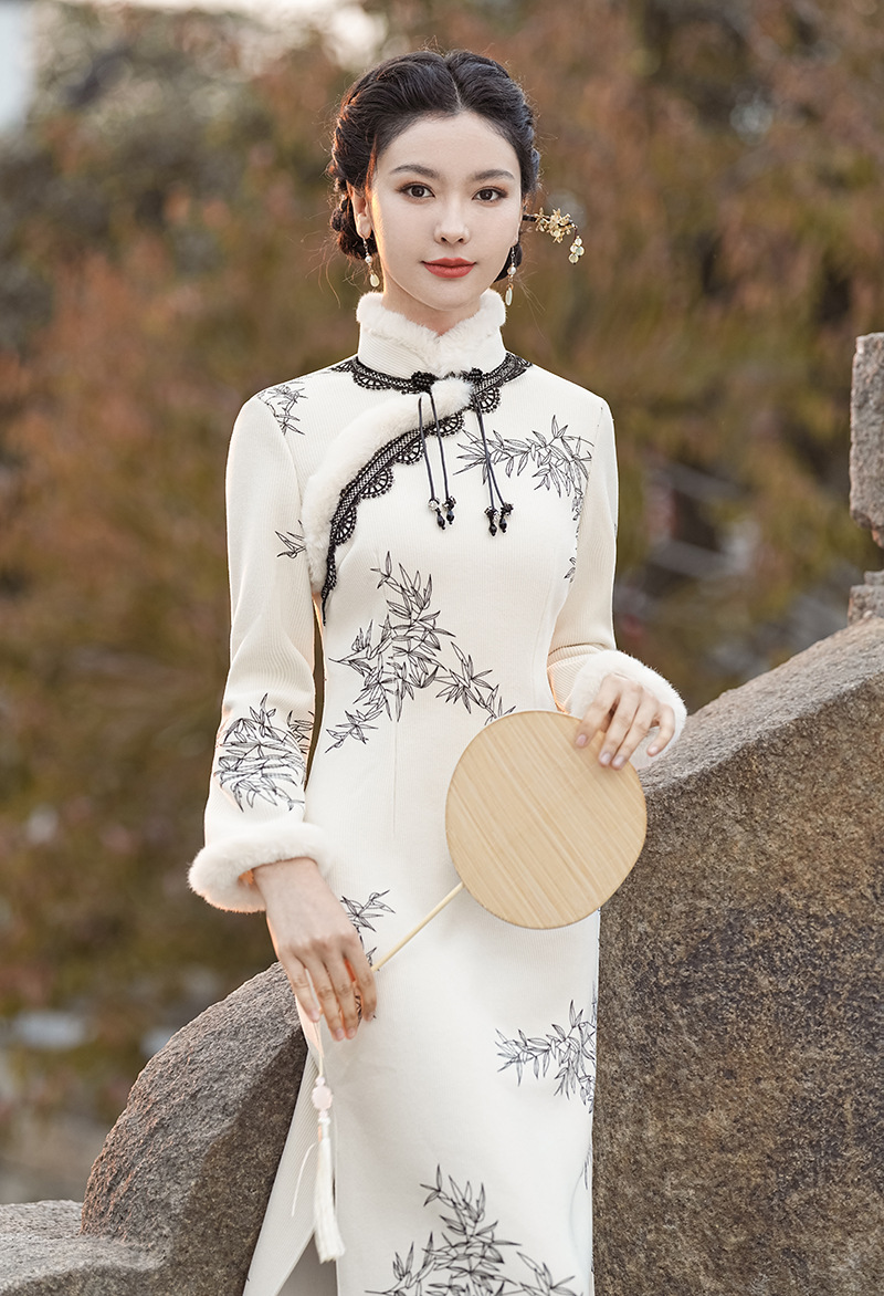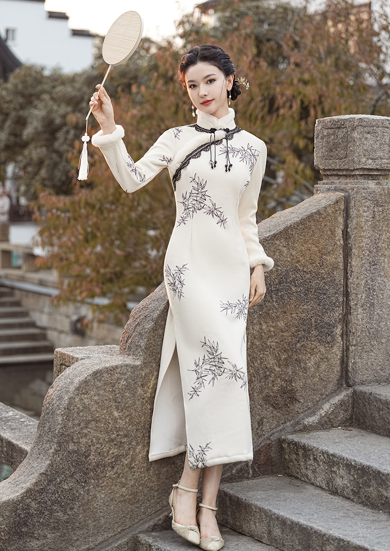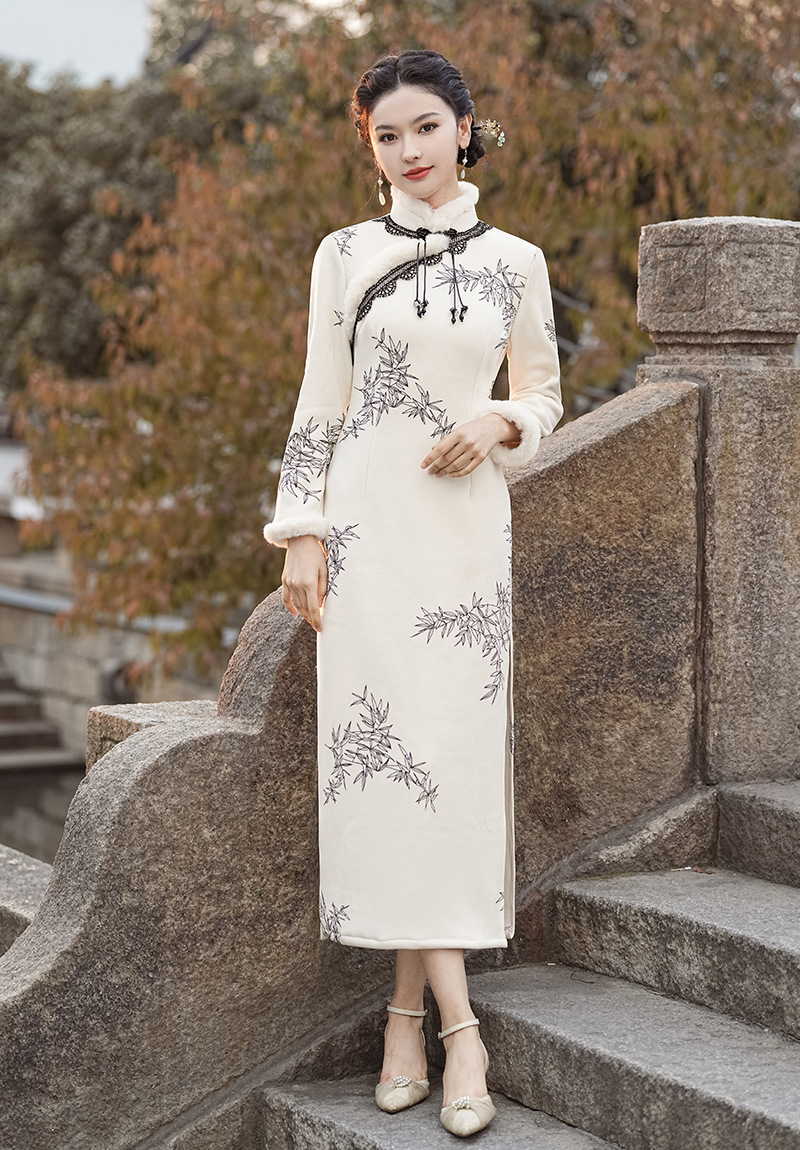 冬季新款,改良旗袍毛领复古白色新中式日常气质长款保暖旗袍XL-23372