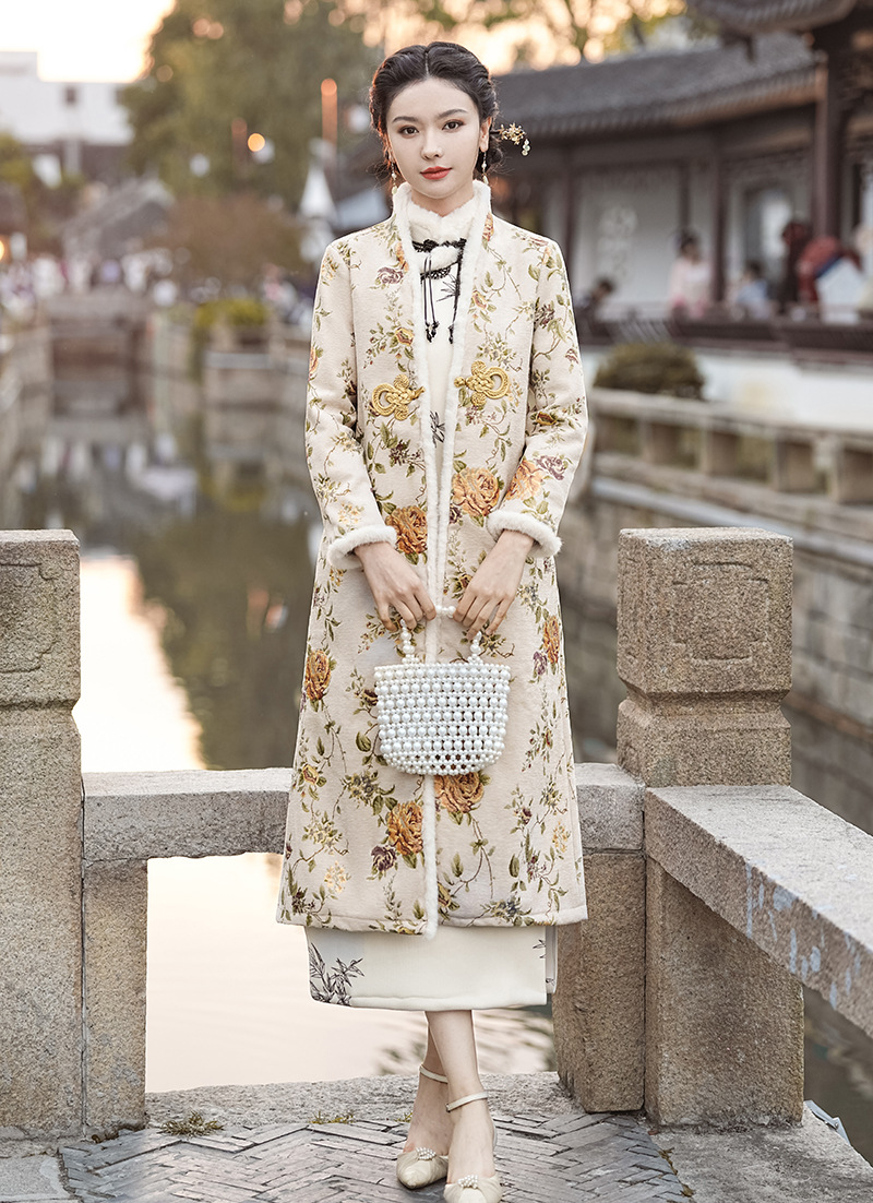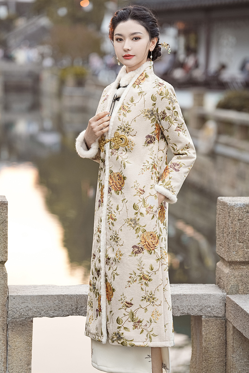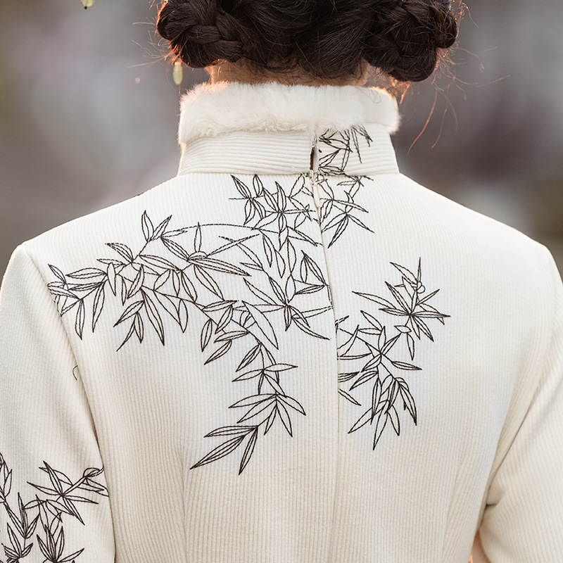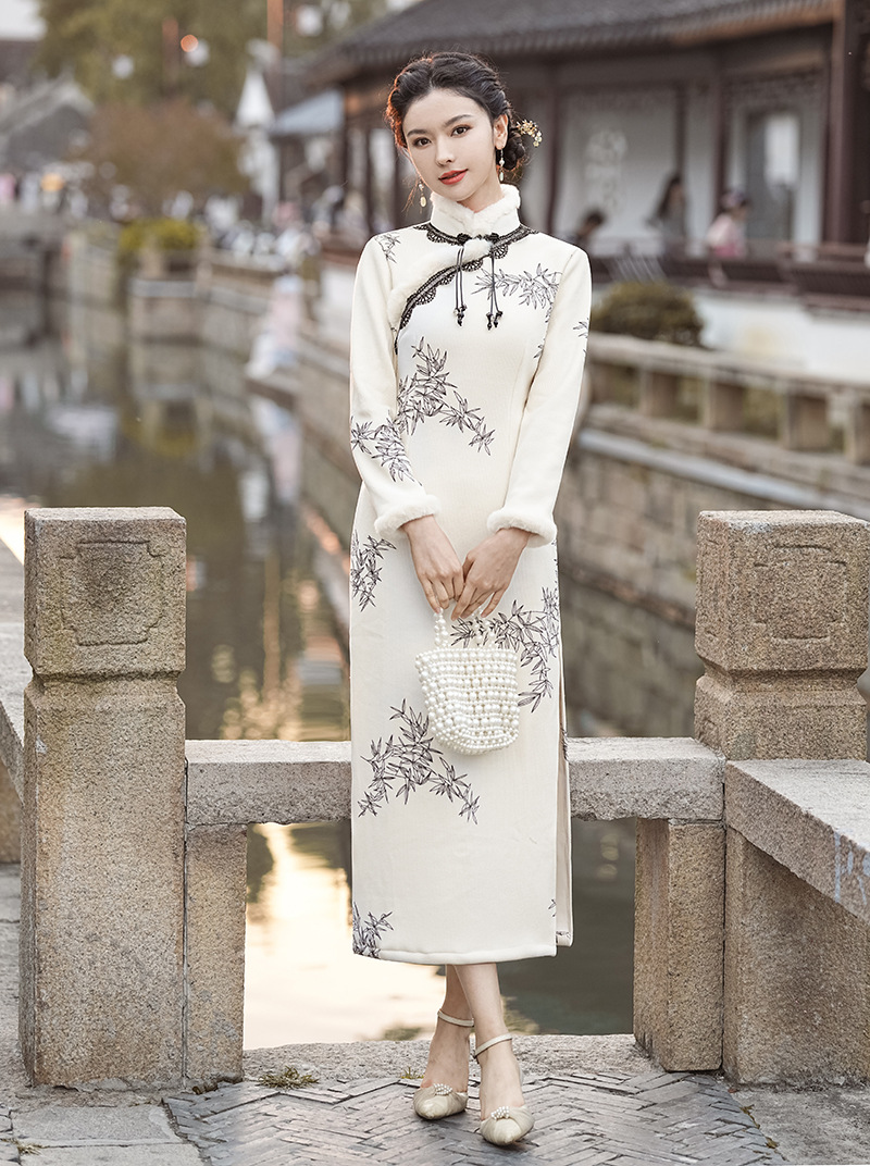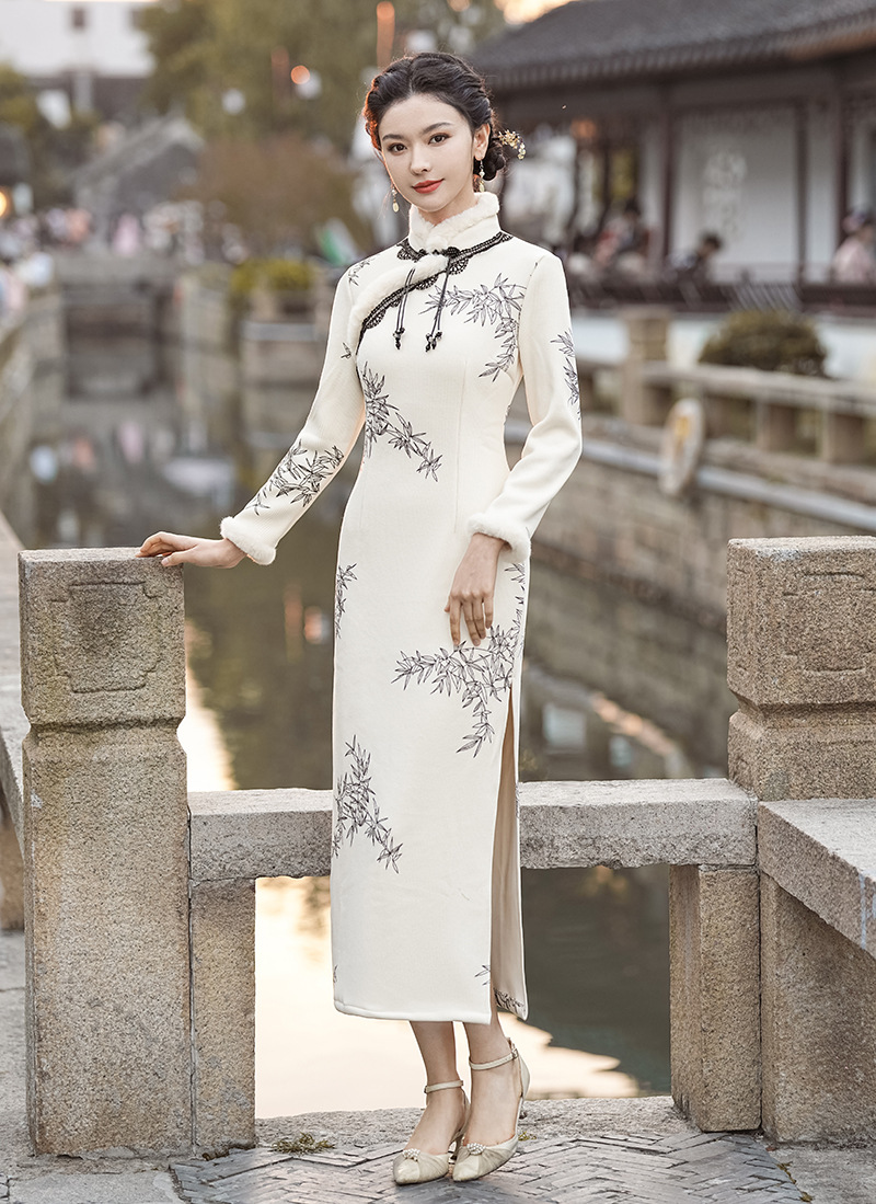 冬季新款,改良旗袍毛领复古白色新中式日常气质长款保暖旗袍XL-23372