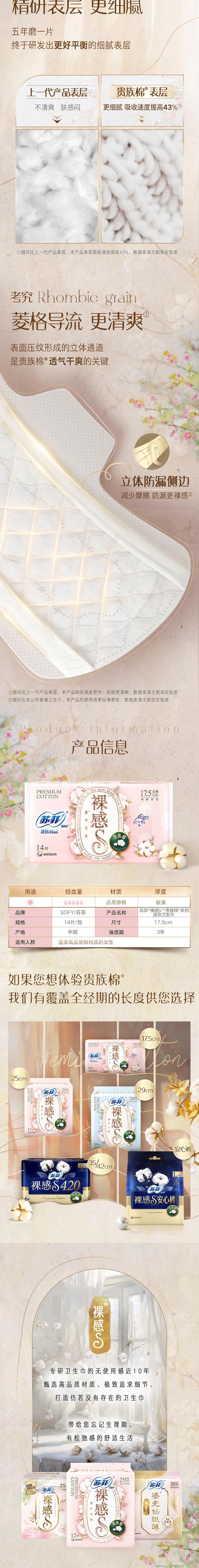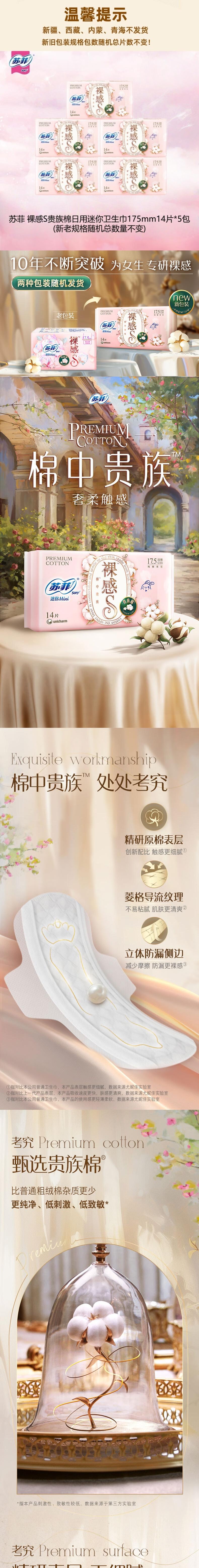 苏菲 裸感S贵族棉日用迷你卫生巾175mm14片*5包 JS14P-5BM