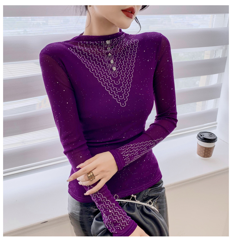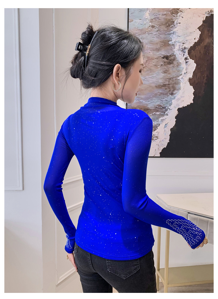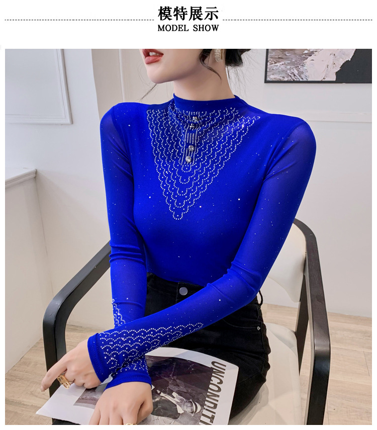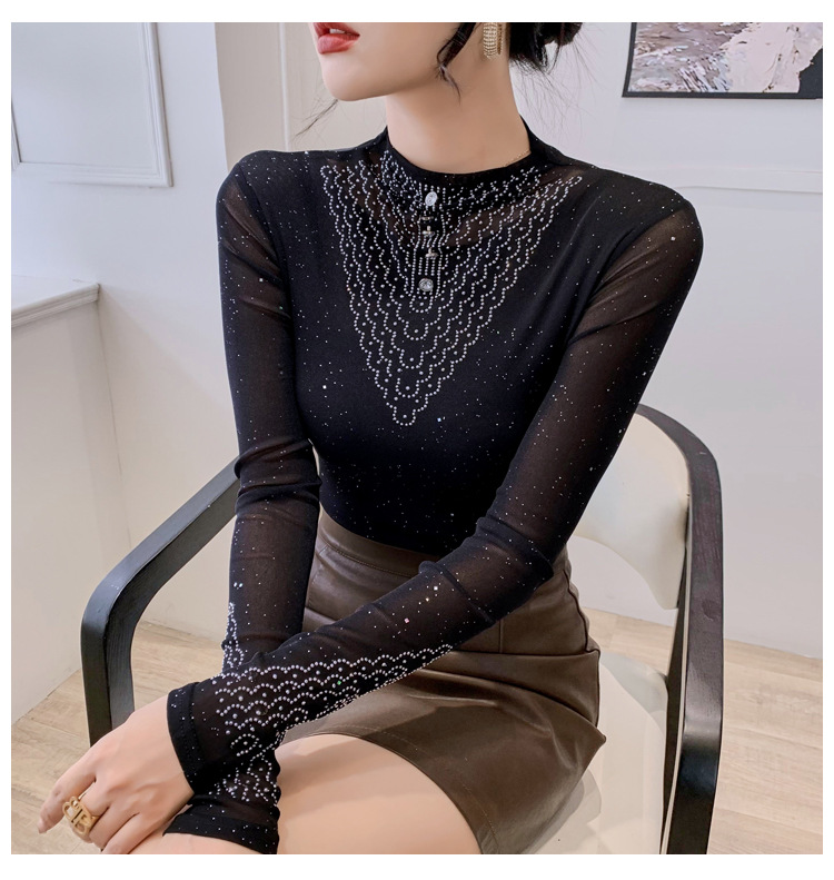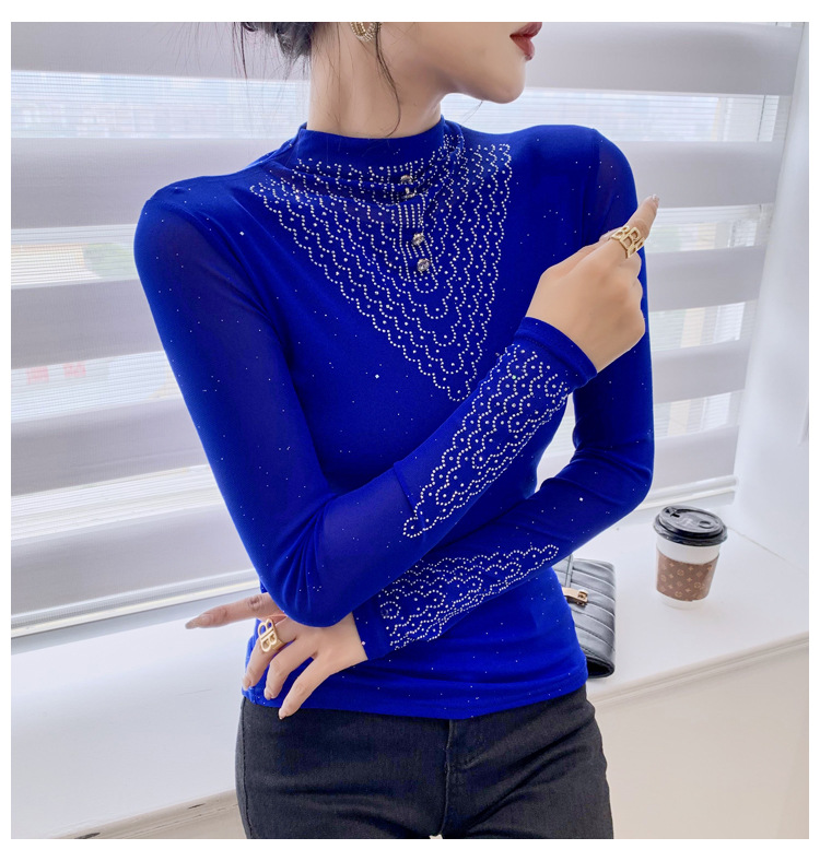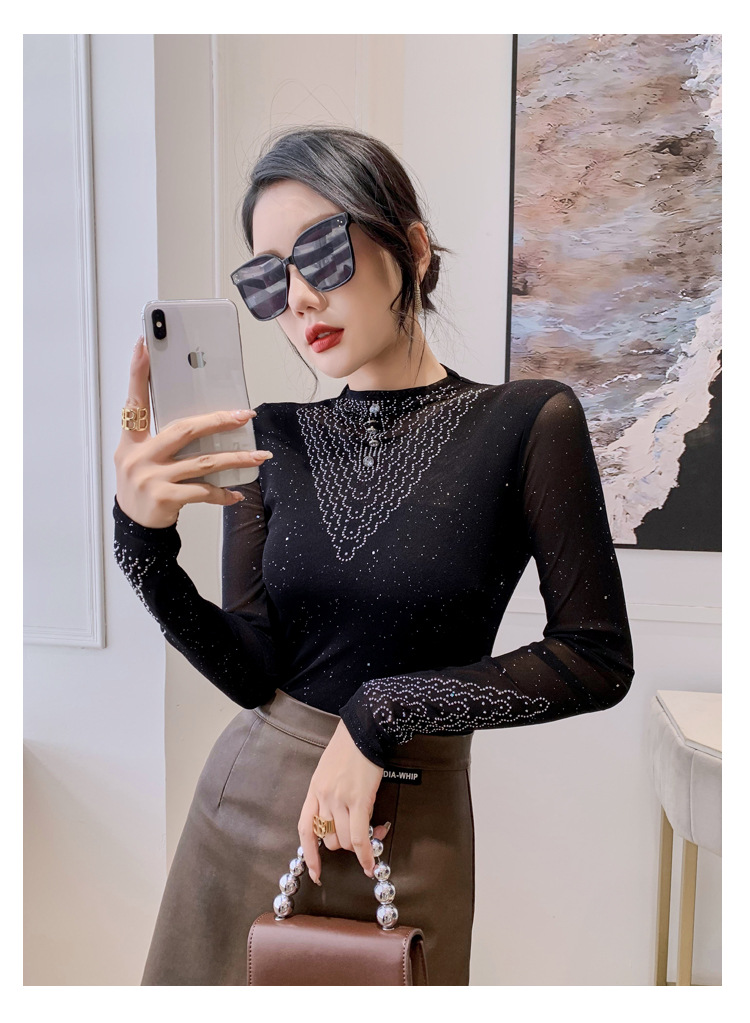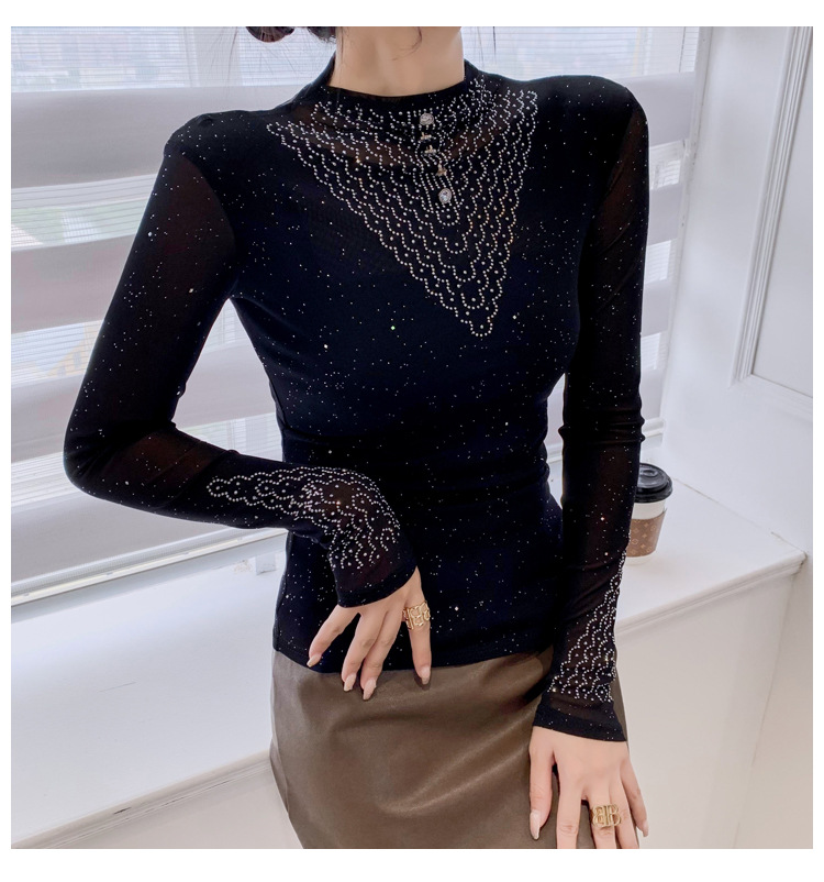 KQL 462H7125加绒加厚网纱上衣半高领洋气烫钻显瘦小衫