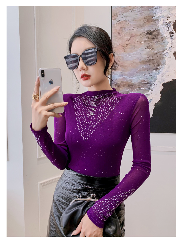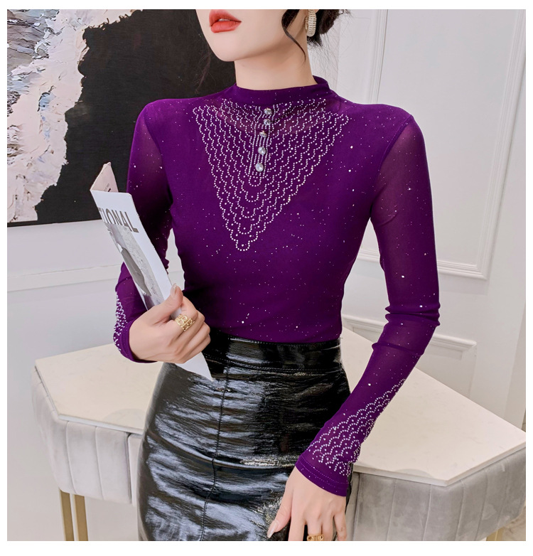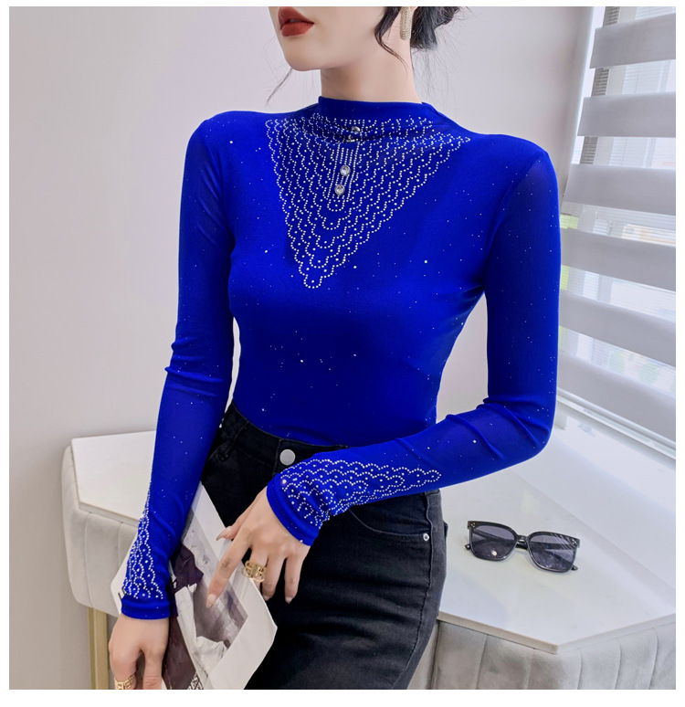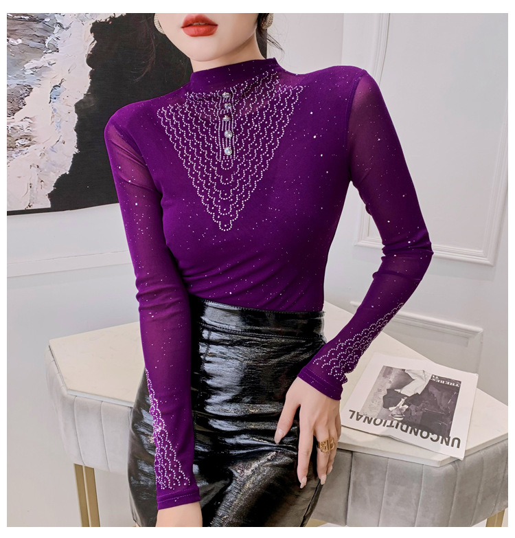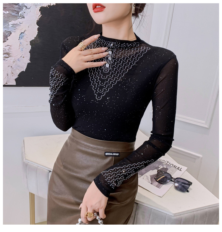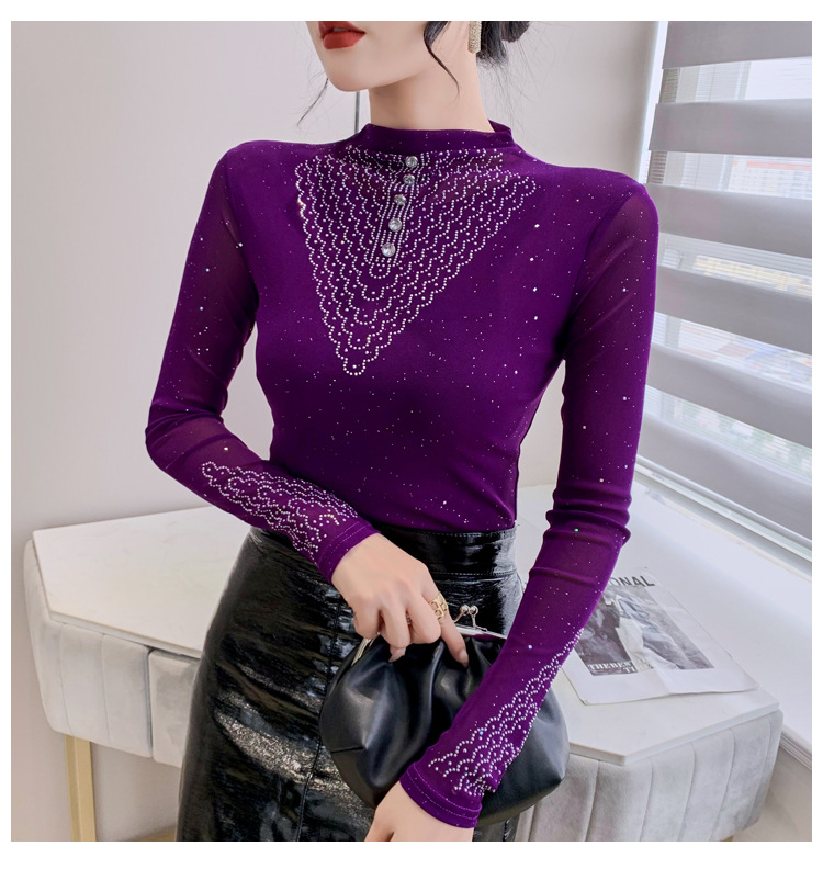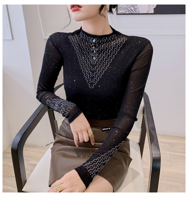 KQL 462H7125加绒加厚网纱上衣半高领洋气烫钻显瘦小衫