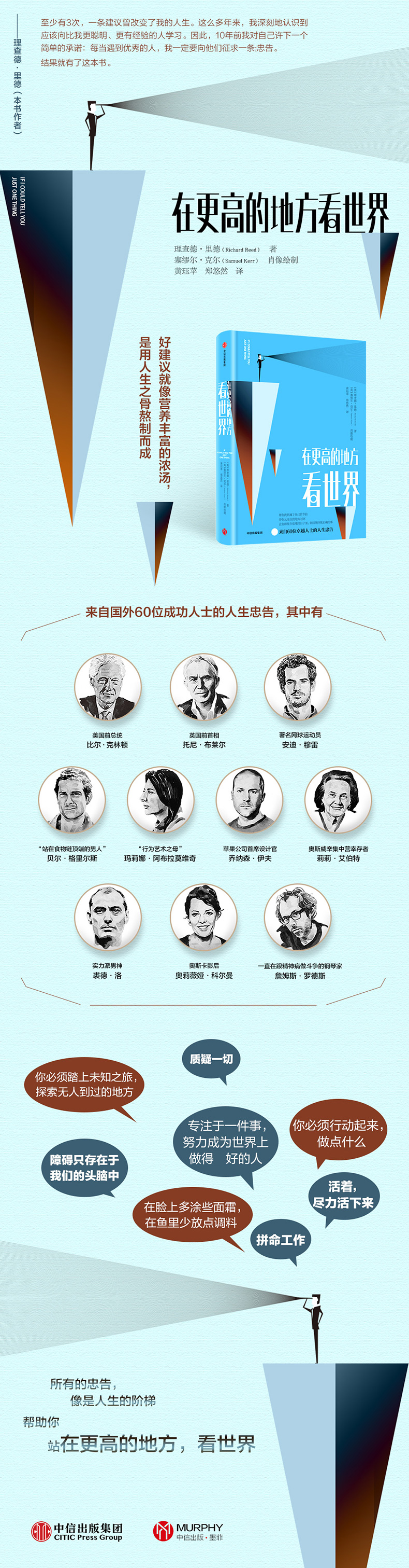7年前,《在更高的地方看世界》的作者理查德·里德在街角开了一个小小的思慕雪门店,随即发展成为英国大的思慕雪品牌,并终被可口可乐公司收购。理查德将这一巨大的成功归功于4条的建议,而这4条件建议如同宝囊一般,在他需要的时候对他鼎力相助。由于这一经历,每当他遇见一些成功的、受人敬仰的人时,都会请对方提供一条他们认为有价值的建议。如果这些成功的人,只告诉你一条他们认为棒的建议,那会是什么?而这本书,就是这些“无价之宝”的集合。在《在更高的地方看世界》这本书中,理查德游历世界,从各行各业的成功人士那里收集建议,这些建议来自比尔·克林顿、托尼·布莱尔、裘德·洛、安迪·穆雷、朱迪·丹奇、英德拉·努伊、西蒙·考威尔、理查德·布兰森、玛格丽特·阿特伍德、贝尔·格里尔斯……书中的60条建议,每一条都伴随着一个动人的故事,和一幅精美的画像,一定会让任何年龄、任何行业的读者都受益匪浅。