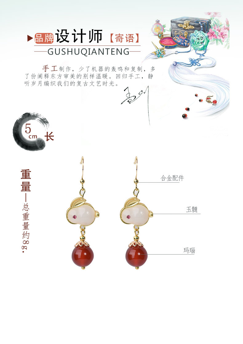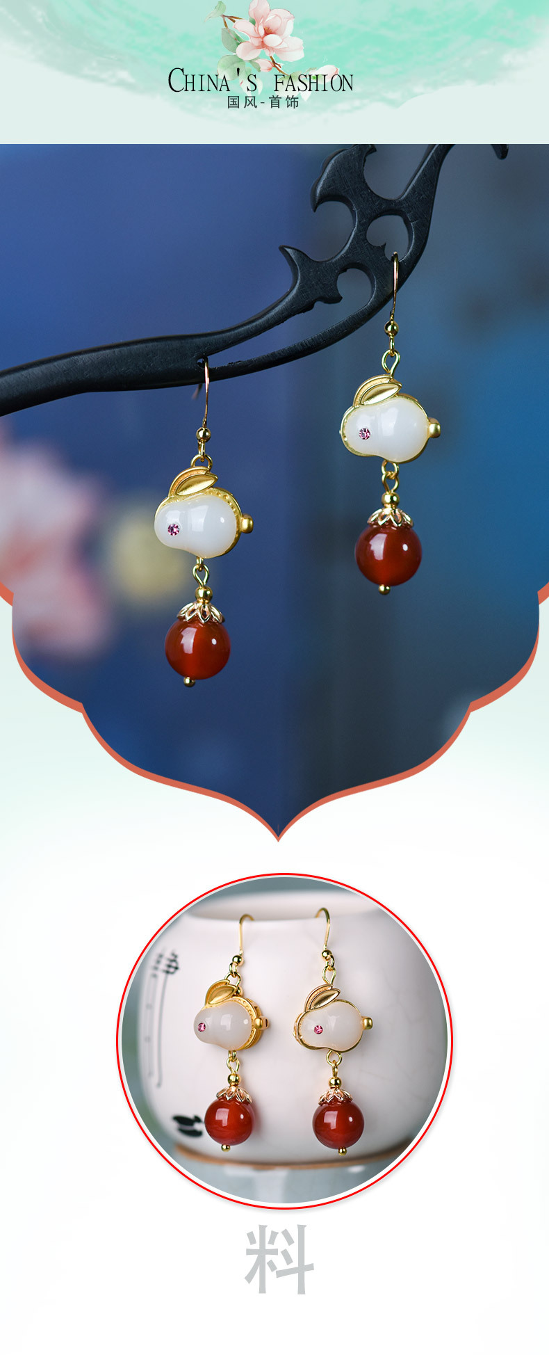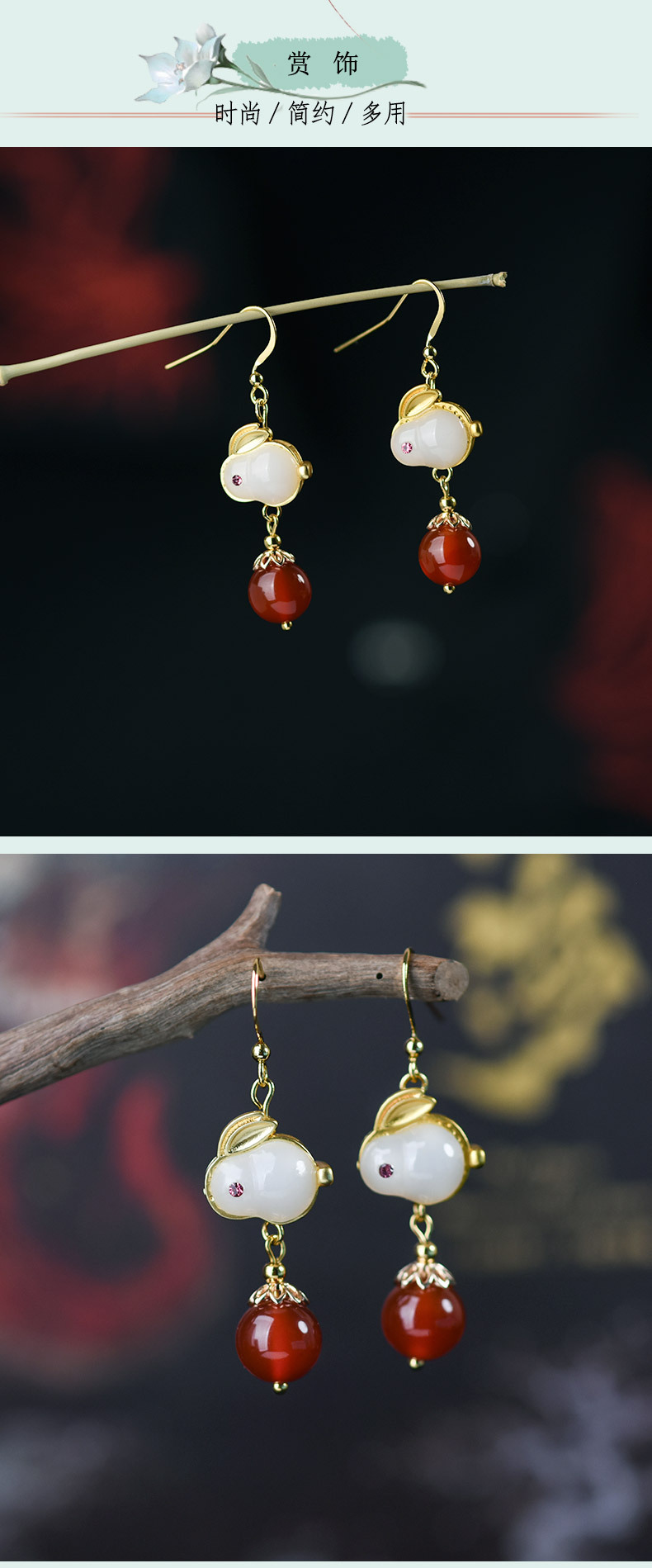 JGL-03220319可爱小兔子耳环仿玉复古国风耳坠兔年本命年耳饰无耳洞耳夹女学生