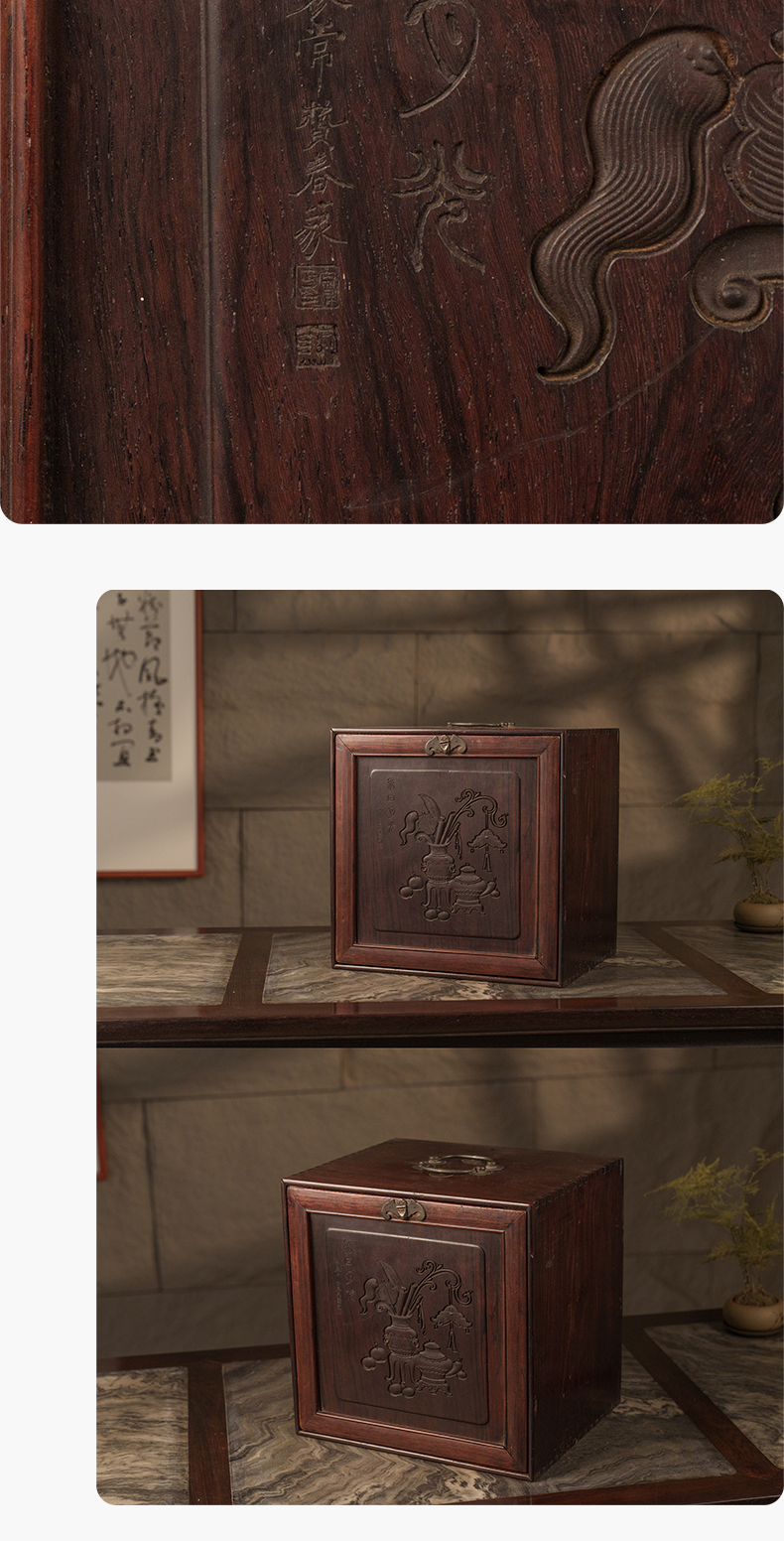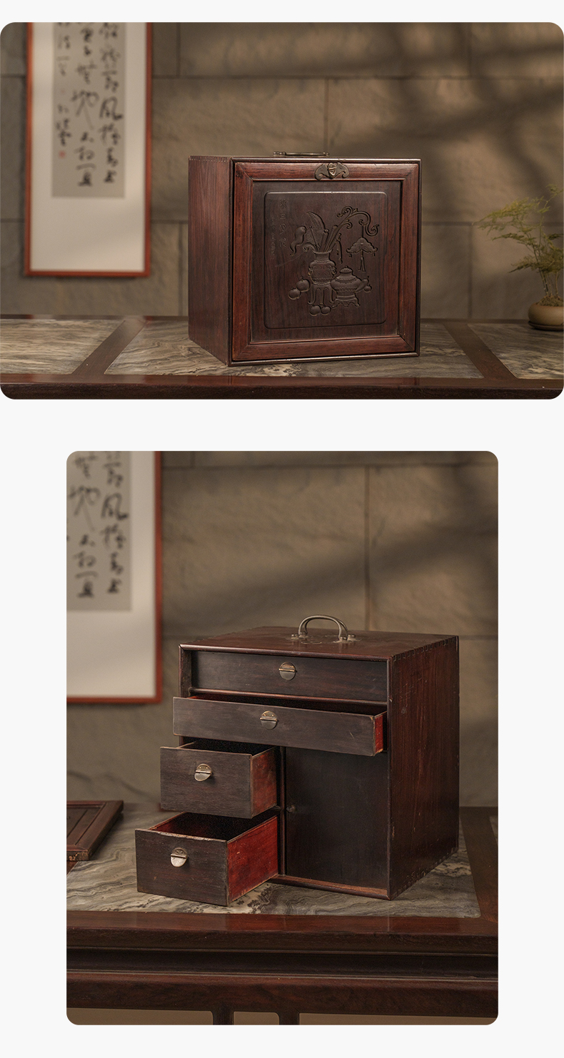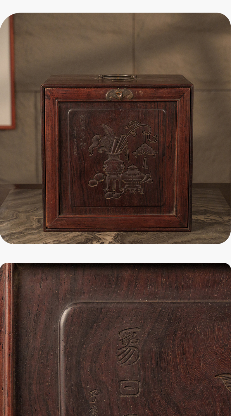 清 红木雕博古图文房箱
