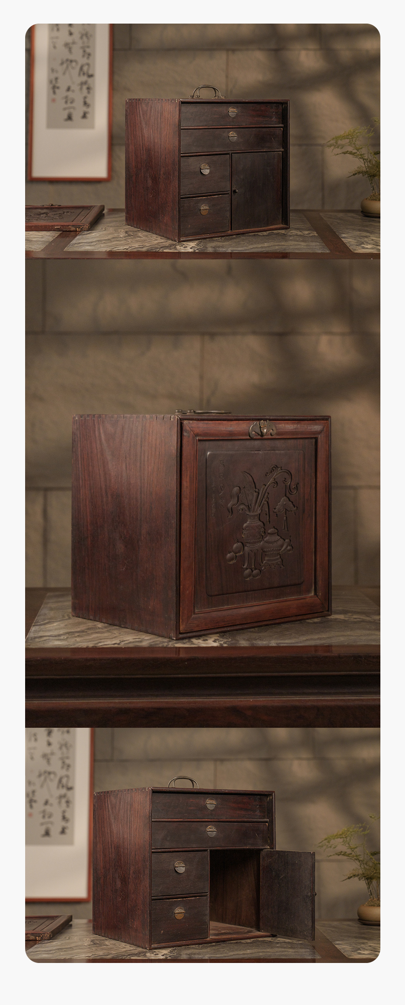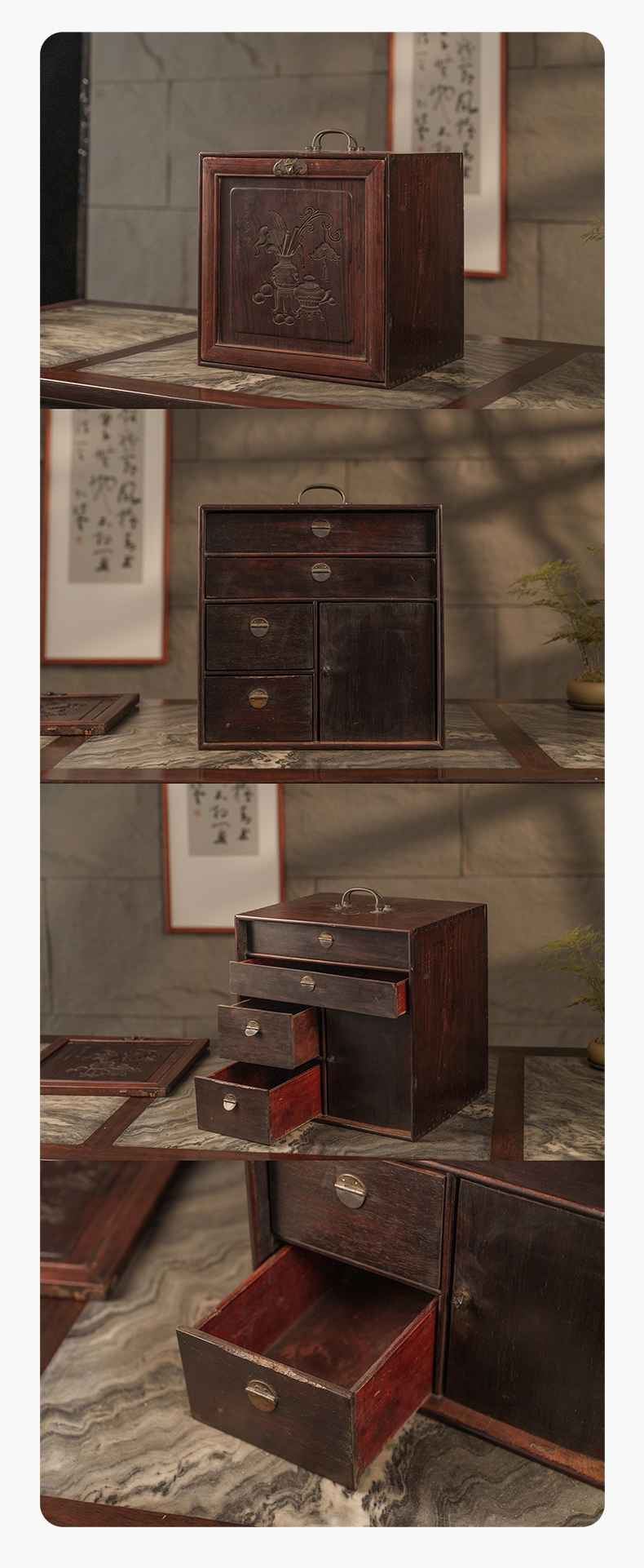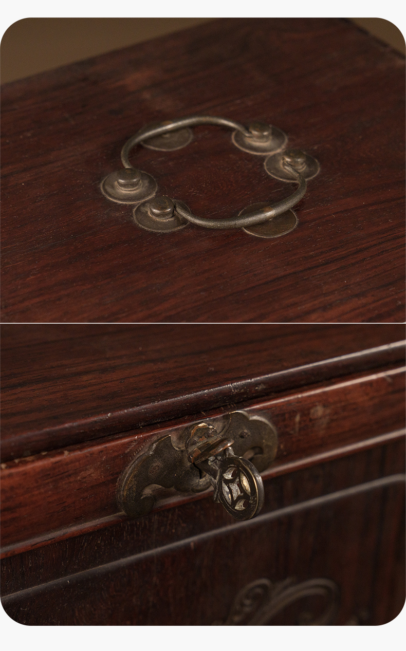 清 红木雕博古图文房箱