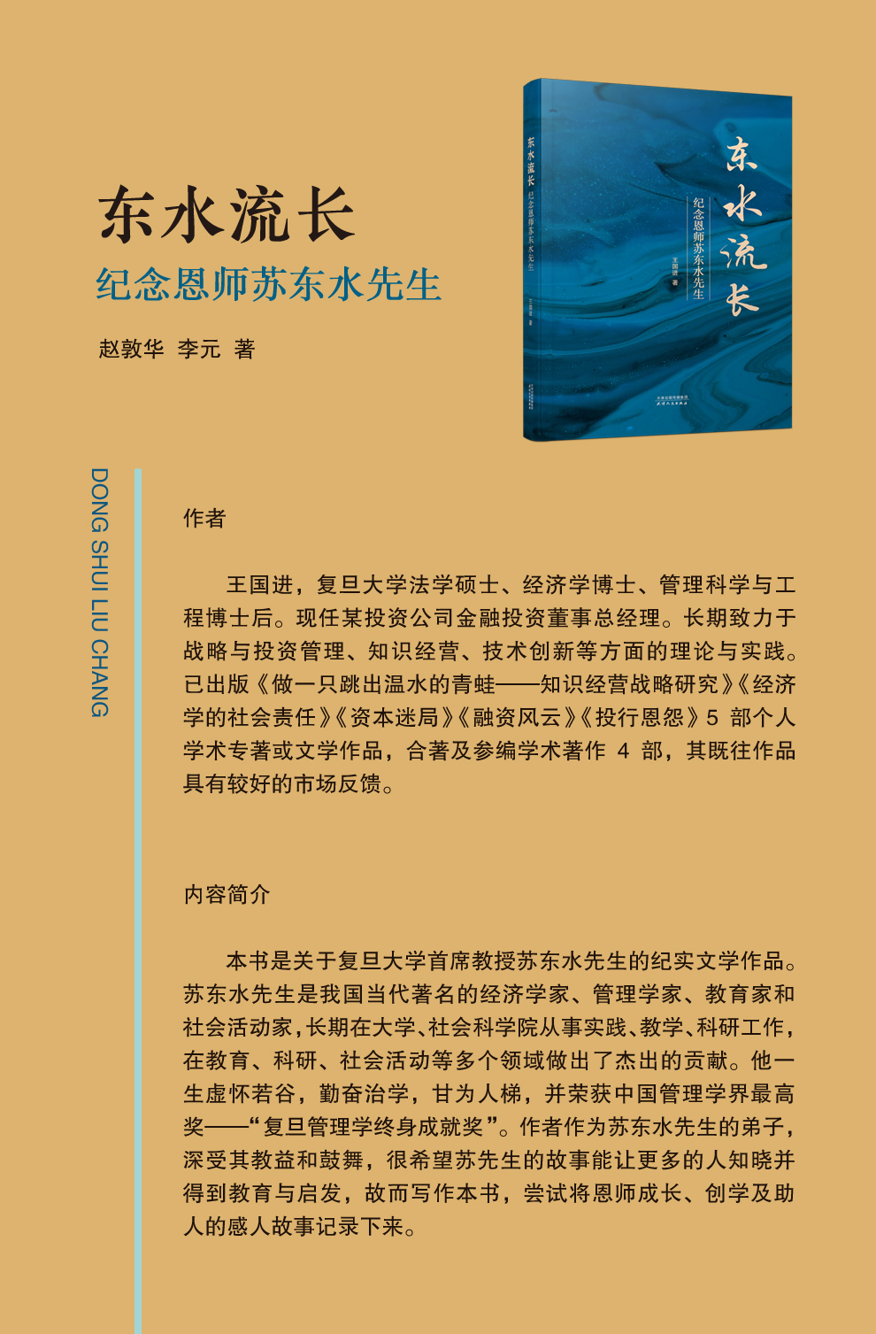 本书是关于复旦大学首席教授苏东水先生的纪实文学作品。苏东水先生是我国当代著名的经济学家、管理学家、教育家和社会活动家,长期在大学、社会科学院从事实践、教学、科研工作,在教育、科研、社会活动等多个领域做出了杰出的贡献。他一生虚怀若谷,勤奋治学,甘为人梯,并荣获中国管理学界最高奖——“复旦管理学终身成就奖”。作者作为苏东水先生的弟子,深受其教益和鼓舞,很希望苏先生的故事能让更多的人知晓并得到教育与启发,故而写作本书,尝试将恩师成长、创学及助人的感人故事记录下来。