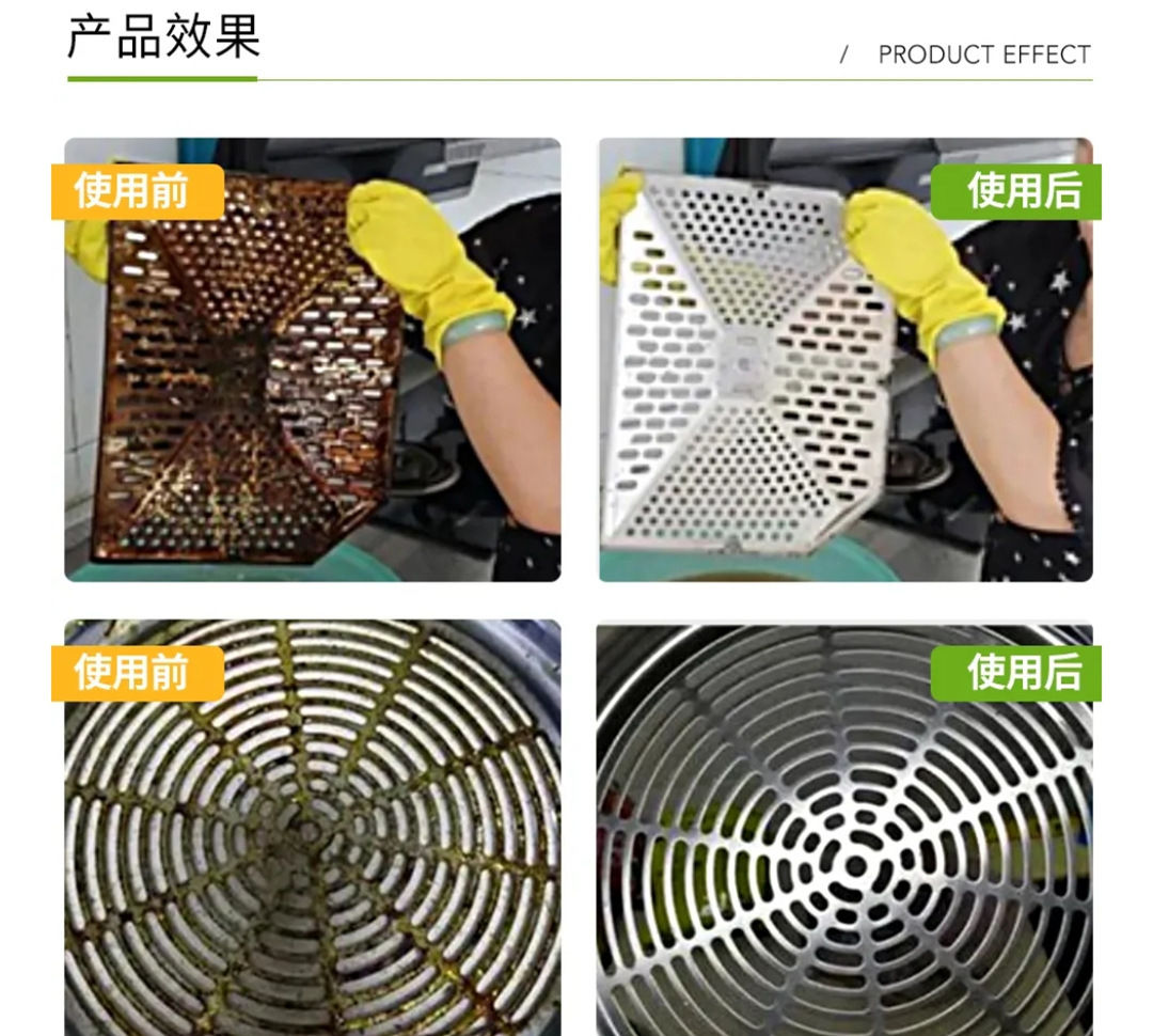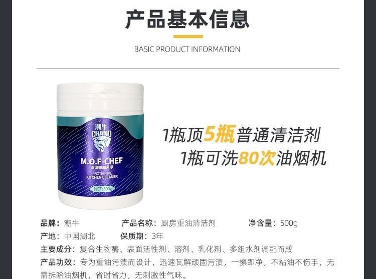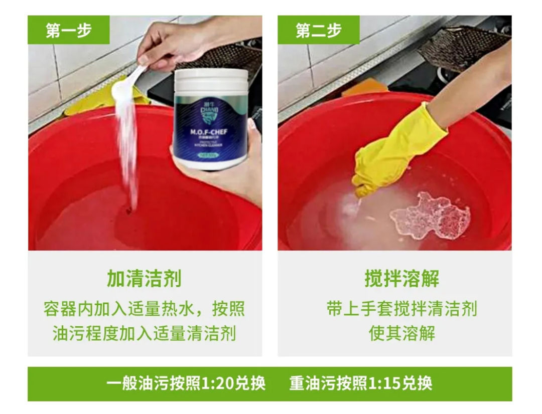 下单48小时浙江发货 厨房重油污净使用方法: 100度开水小盆兑产品1-2勺粉(里面有配勺子)。 趁水热刷洗,对于不能拆下的油烟机排烟囗。定购一个耐高温的喷壶,先油污面全部喷一遍,让它先分解几分钟,分解后直接擦拭,厚重油污多喷几次。水温越热效果越好。 重油污净使用注意事项: 因为重油污净是专门针对老旧厚重油脂的,它的祛油污力度非常的强,所以效果才特别好,那么我们在使用重油污净祛除油垢污渍的过程中,请一定佩戴手套,否则它也会对手部表面的油脂保护层进行处理(毕竟产品不是人,不能做到识别)。 本产品是高浓缩产品,对于涂漆类的不要长时间浸泡,以免掉漆。使用后要过清水。铝合金,铝制品不能用。