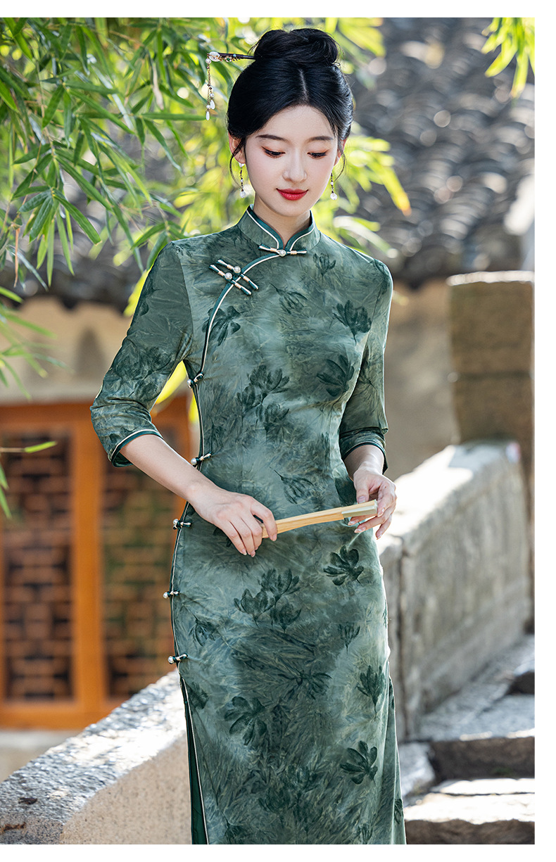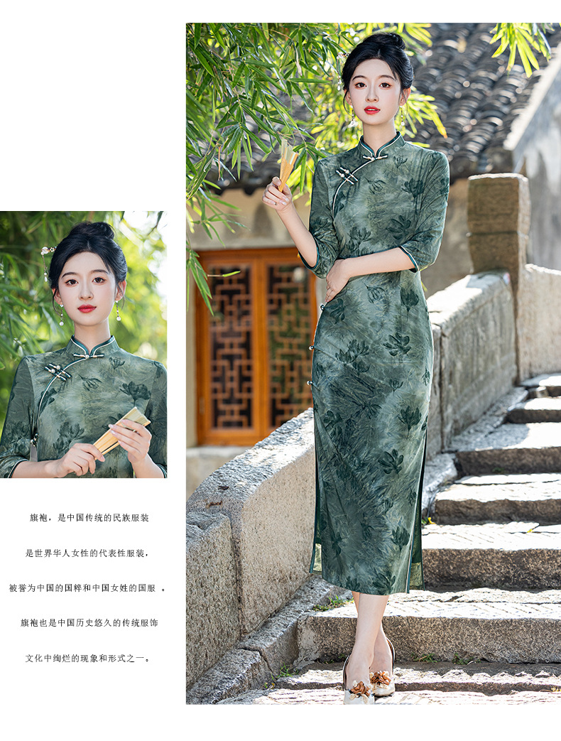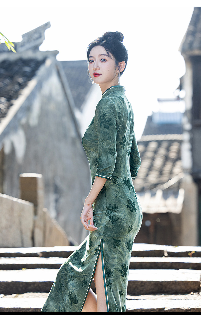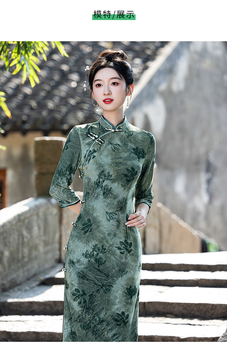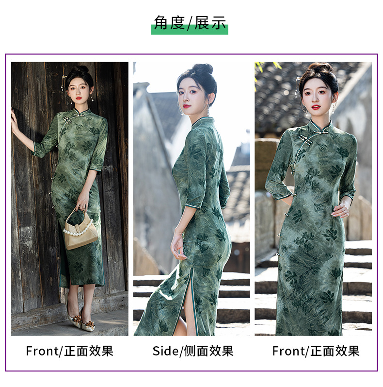 牛奶丝植绒扎染,高级感复古长款七分袖旗袍MLS7002