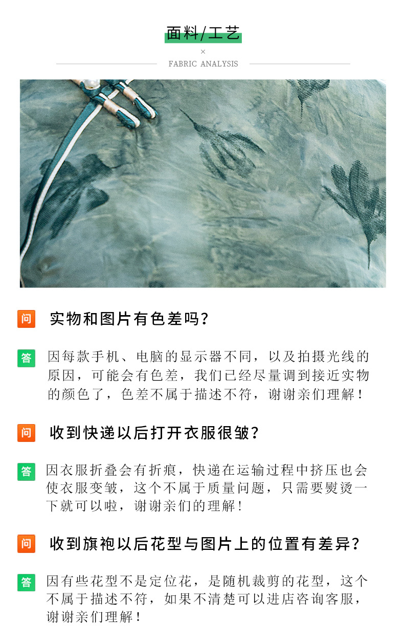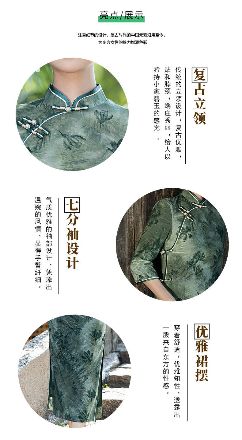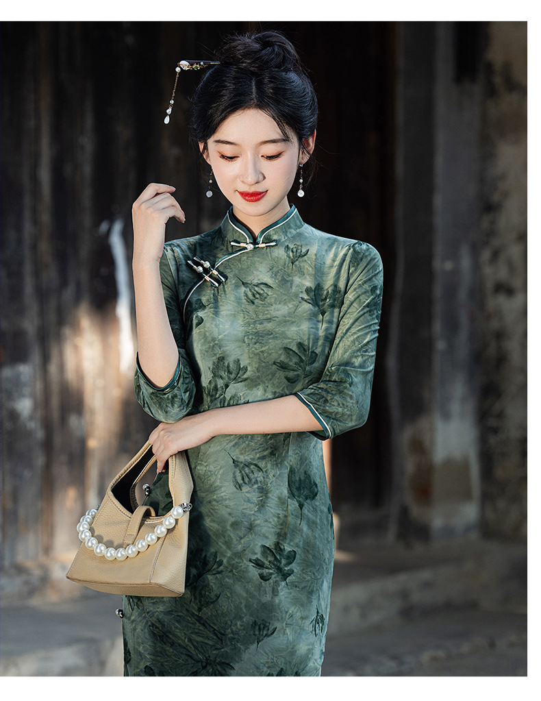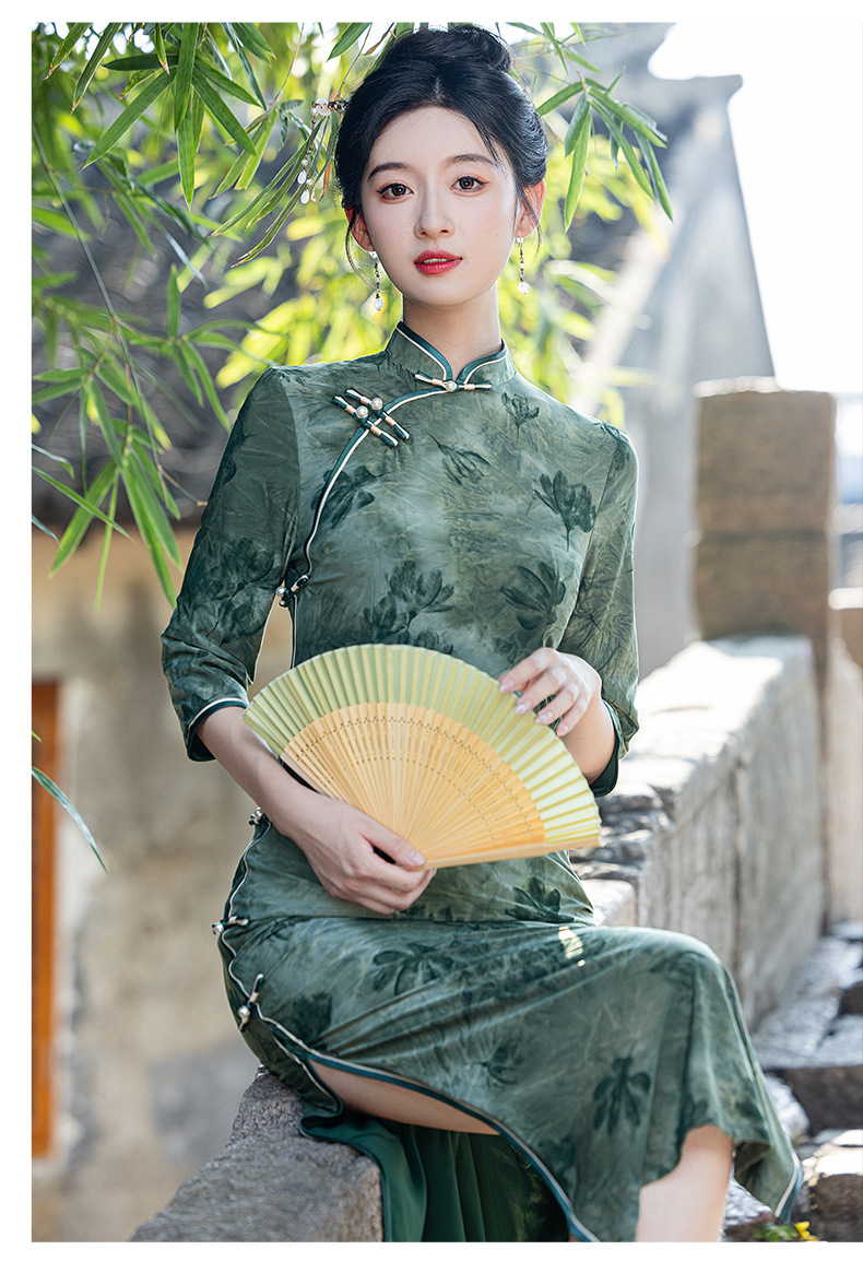 牛奶丝植绒扎染,高级感复古长款七分袖旗袍MLS7002