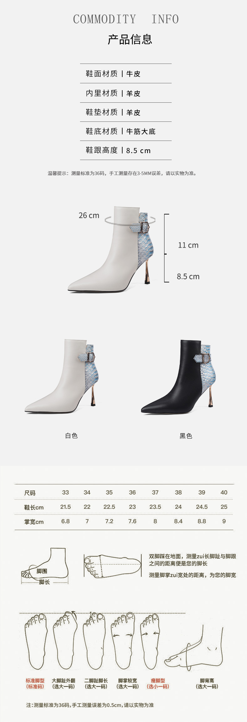 【帮面材质】牛皮【鞋 垫】羊皮垫【内里材质】羊皮里【鞋底材质】牛筋底【跟 高】8.5CM【颜 色】黑色 白色【尺 码】34-39