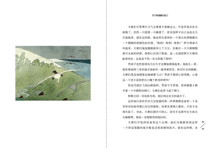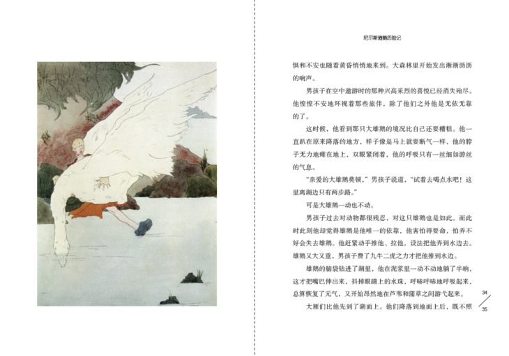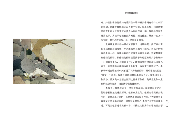 本书是世界文学史上第一部,也是唯一一部获得诺贝尔文学奖的童话作品。主要讲述一位不爱读书、喜欢调皮捣蛋的男孩子尼尔斯,自己在家里的时候因为捉弄一个小精灵,被小精灵变成了一个小人儿,又因为害怕自家雄鹅飞走,抱住鹅的脖子,不料却被雄鹅带上了天空。从此,他骑在鹅背上,跟随一群大雁经历了一次长途旅行。通过这次奇异的旅行,尼尔斯增长了很多见识,结识了许多朋友,经历了种种困难和危险,从中也得到了锻炼。最后尼尔斯回到了家中,恢复原形,变成了一个好孩子。