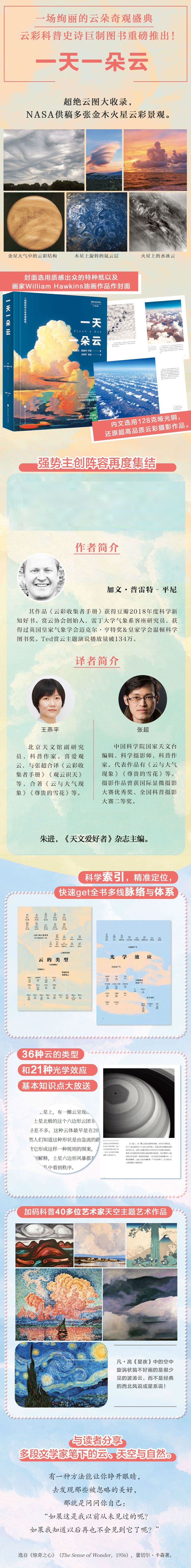 没有哪朵云是不美的。云是我们每天一抬头就能收到的礼物。本书收录几百张云彩高清相片,带来一场绚丽的云朵奇观盛典。(摄于全球各地,如:冰岛|丹麦|美|英|法|比利时|德|西班牙|瑞士|澳大利亚|爱尔兰|南非……,更有从国际空间站和美国国家航空航天局(NASA)的多个探测器、卫星、火星车拍摄到的金/木/火星的云和有关气象照片。)此外还收录了各时代几十位艺术家笔下的云主题艺术作品(米友仁|葛饰北斋|凡·高|爱德华·霍珀……)。为读者图文对照着科普36种云的类型和21种相关光学效应等云彩及相关气象知识和云主题艺术作品,收录多段文学作品中对云、天空与自然的生动描绘。(莎士比亚《暴风雨》、卡尔·桑德堡《雾》、雪莱《麦布女王》、爱伦·坡《埃莱奥诺拉》……)
