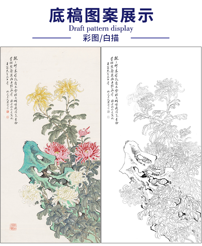 黄山寿工笔画白描底稿《菊石延年图》临摹勾线高清打印稿HS01