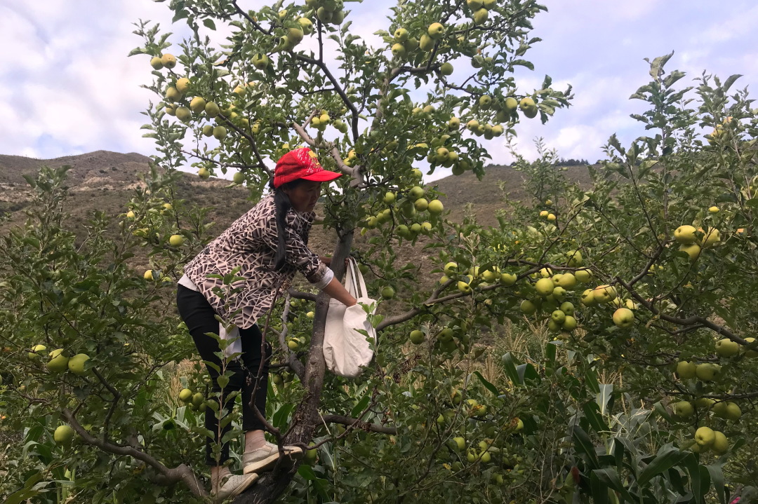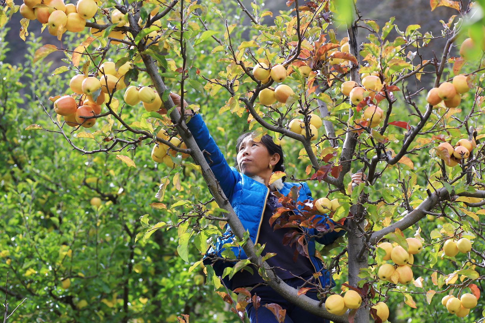 在当地,采摘苹果一般由妇女完成。藏民族传统里认为,妇女的手会带给果树生生不息的力量。她们挎着布袋,一跃上树。一手把着树干,一手摘下苹果,放进随身挎的布袋。眼到手到,动作麻利。