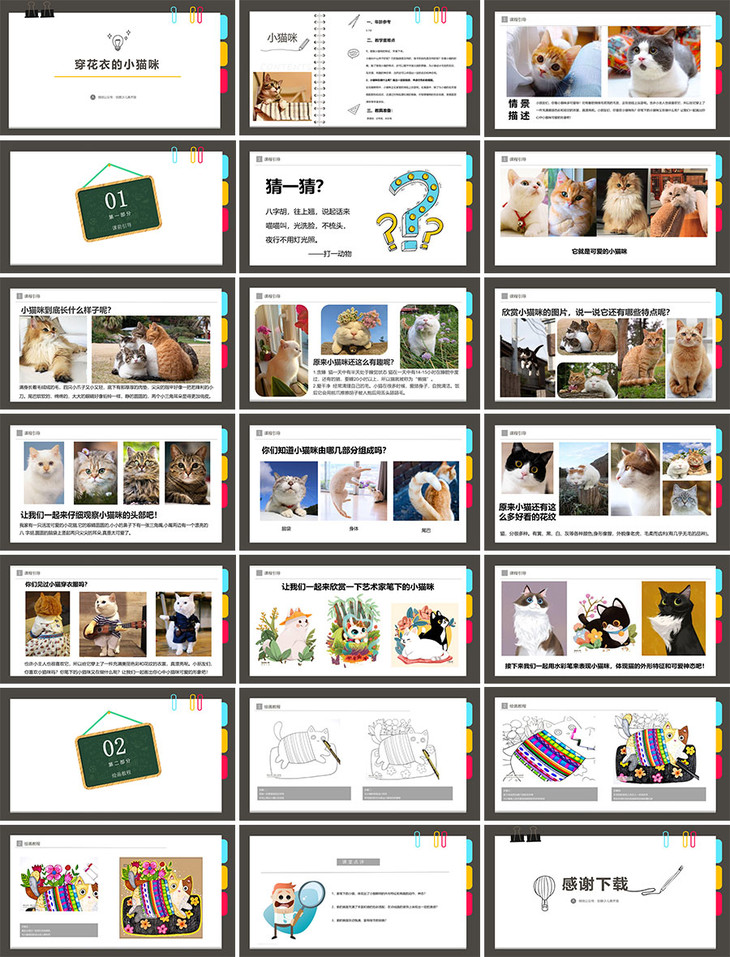 小猫长什么样子的呢?它的脑袋是怎样的,身子的结构是怎样的呢?在画小猫的时候,除了表现小猫的特点,还可以展开丰富大胆的想象,为小猫设计毛发的花纹、花衣裳、有趣的神态等,当然还可以体现出一定的动态和神态呢。