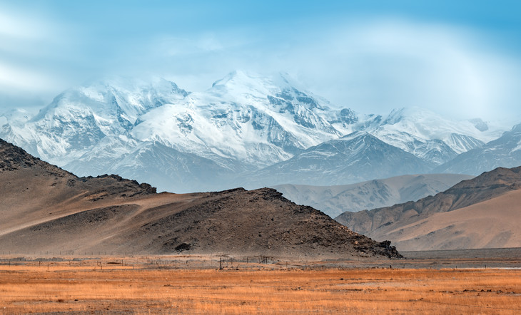 慕士塔格峰,海拔7509米。周边慕士塔格峰、公格尔峰及公格尔九别峰,三山耸立,如同擎天玉柱,屹立在美丽的帕米尔高原上,终年积雪覆盖,被称为"冰山之父"。