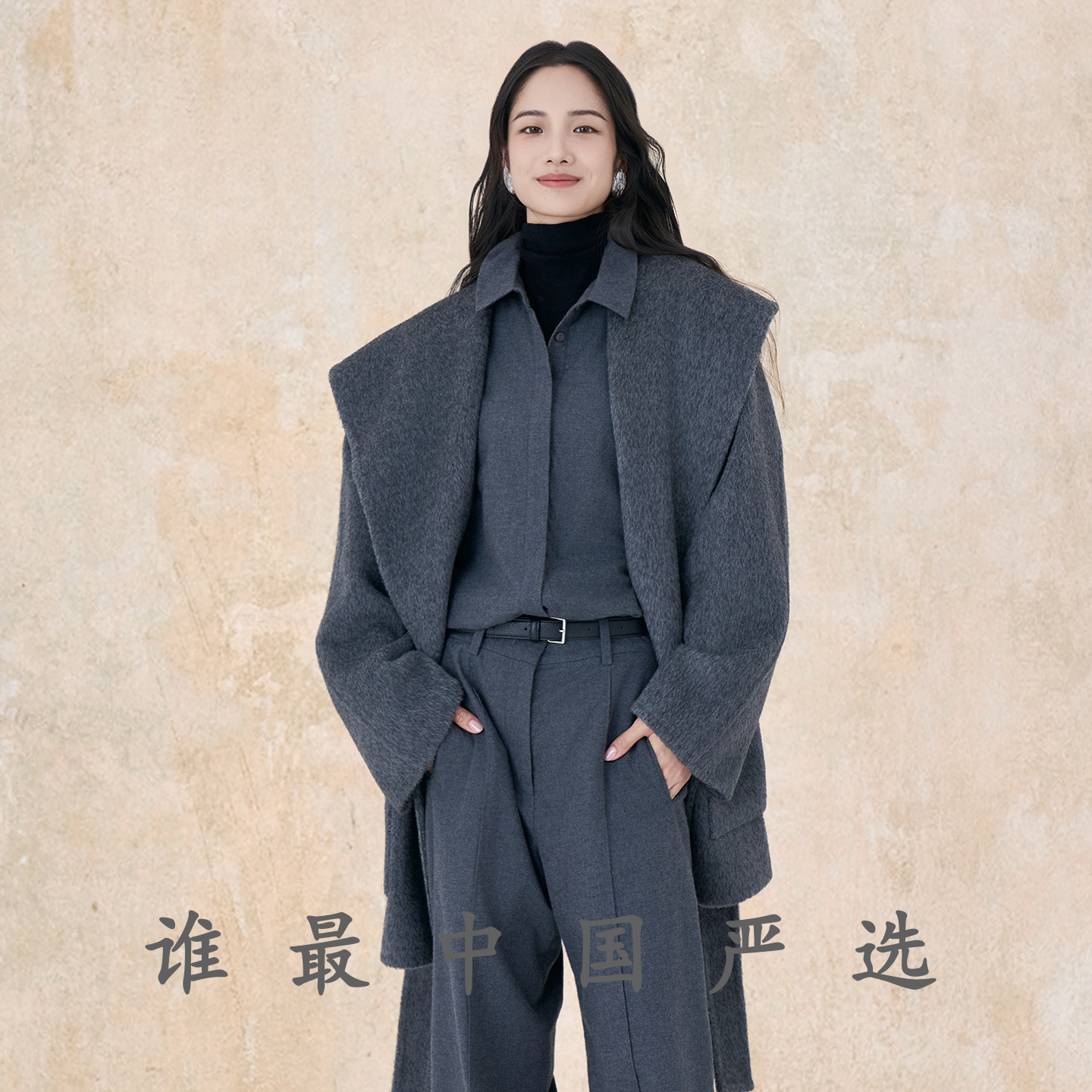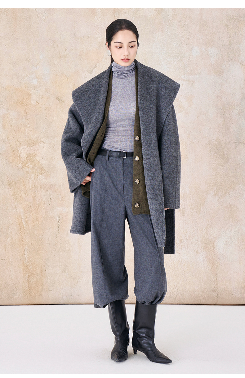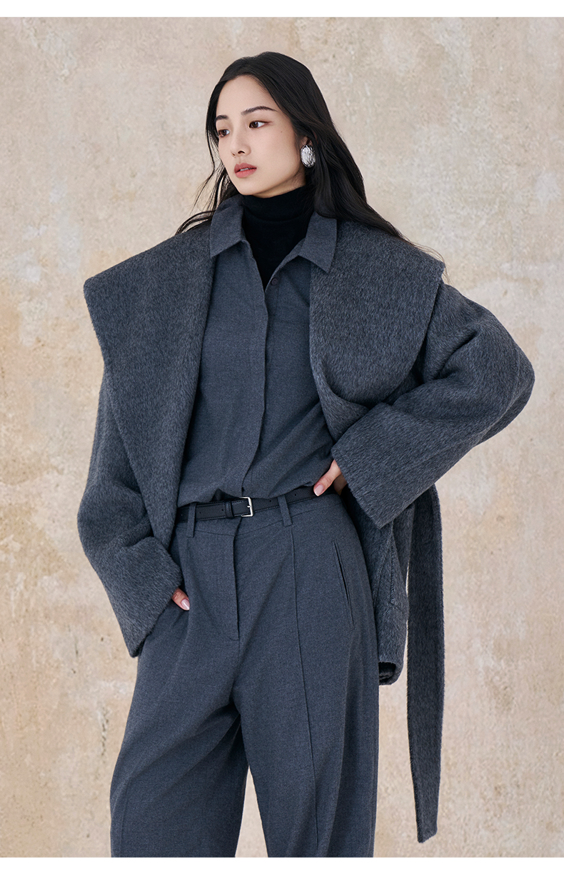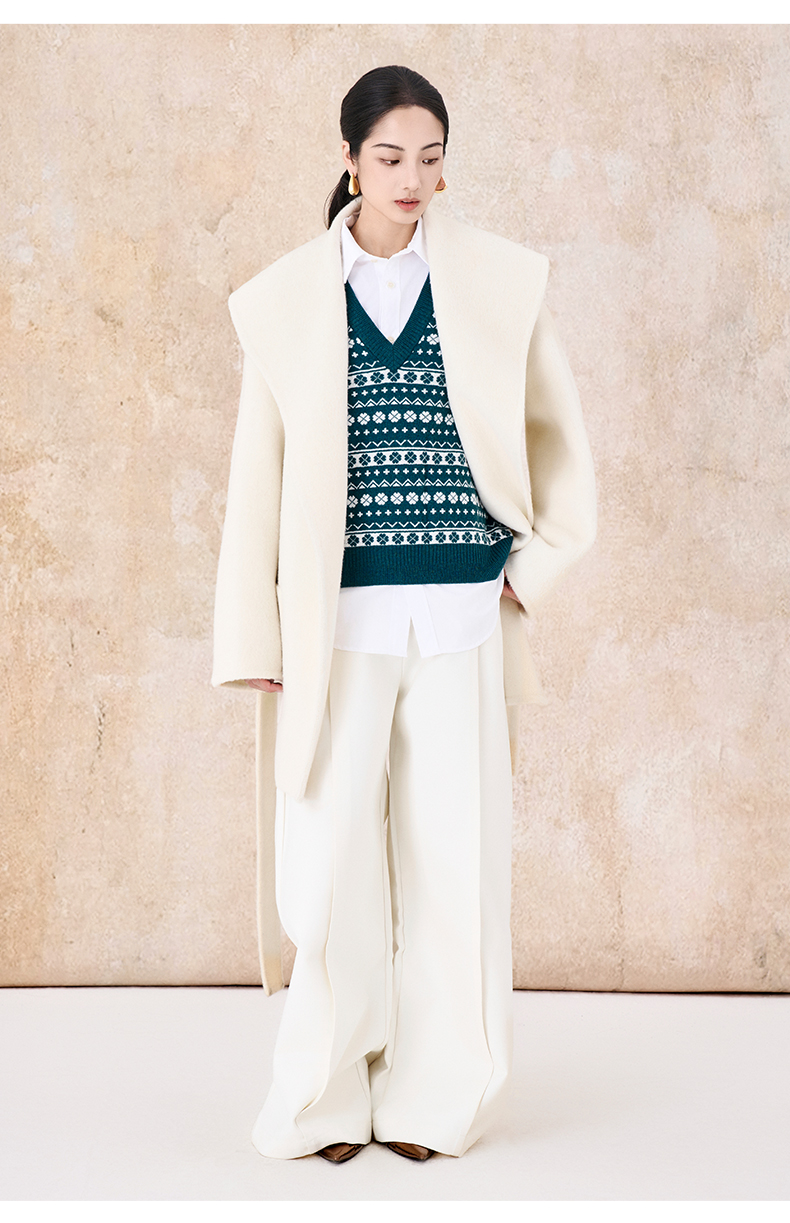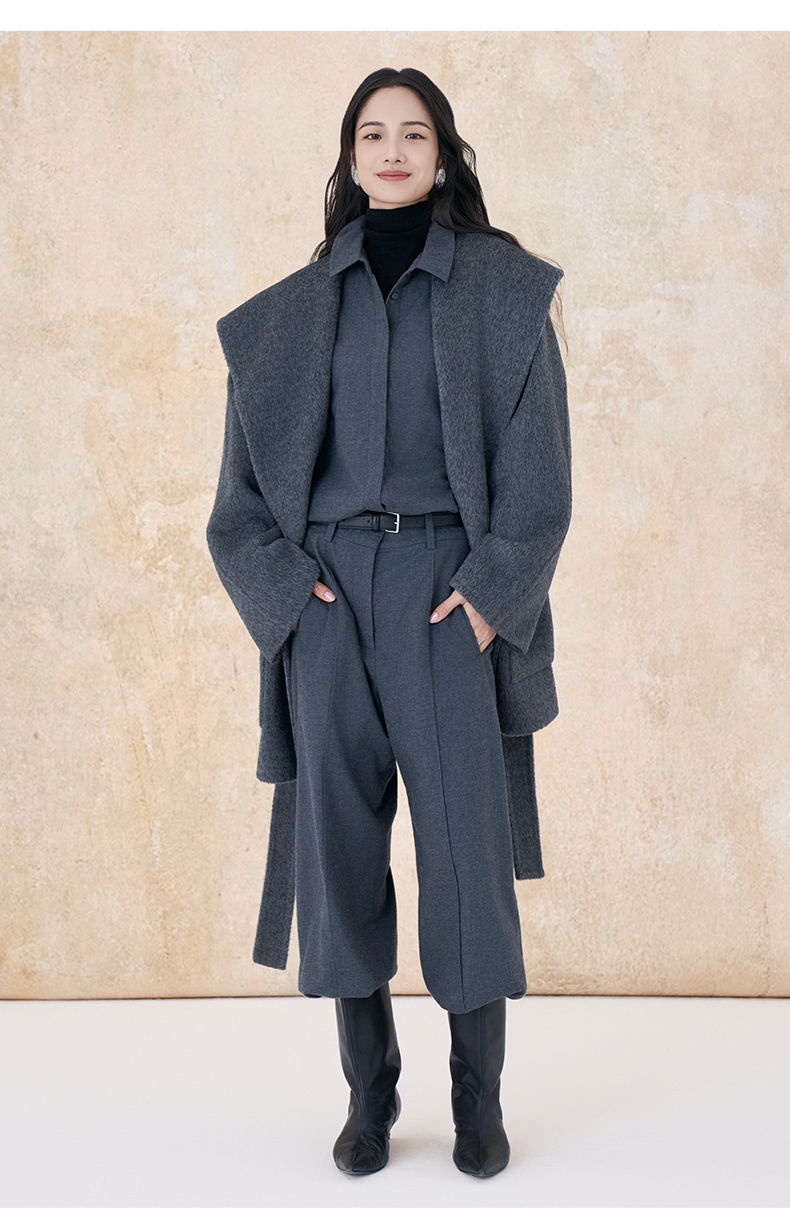 【市野织间】女士大翻领长毛双面呢大衣 绵羊毛与牦牛绒混纺