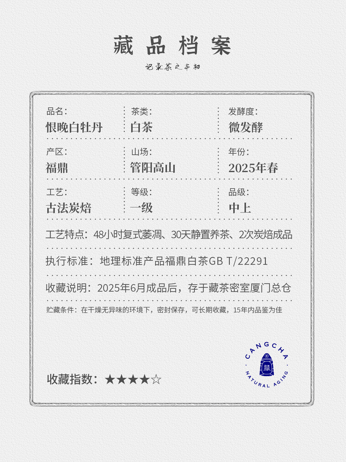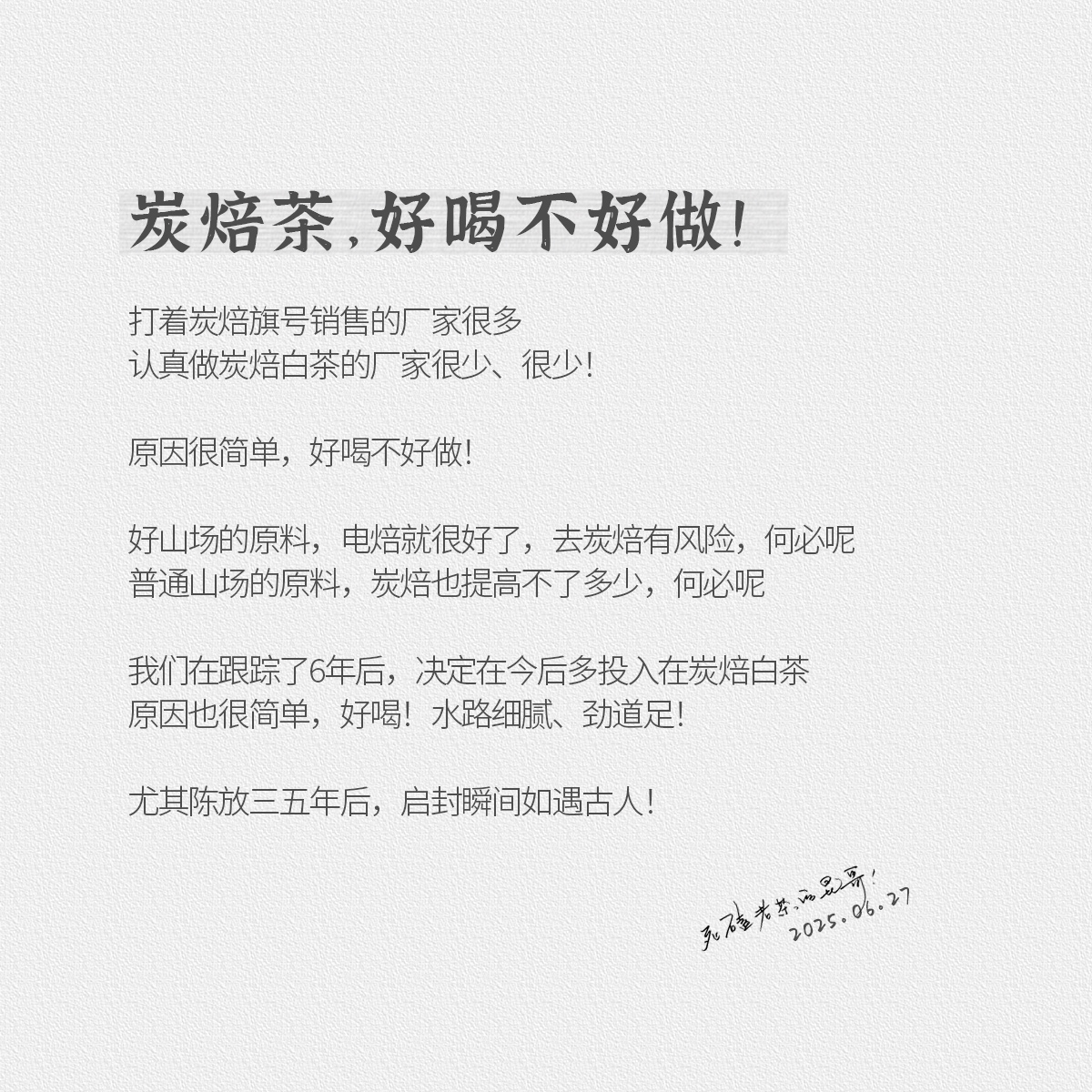- 2021年,嘉木会创办了“藏茶密室”,开启了全新的藏茶模式,秉持“不将就,不迎合”的理念,通过“选、藏、养、醒”的方式,再度诠释藏茶的深意,沉醉杯汤,苦乐自知,茗透于心,迷之不悔!