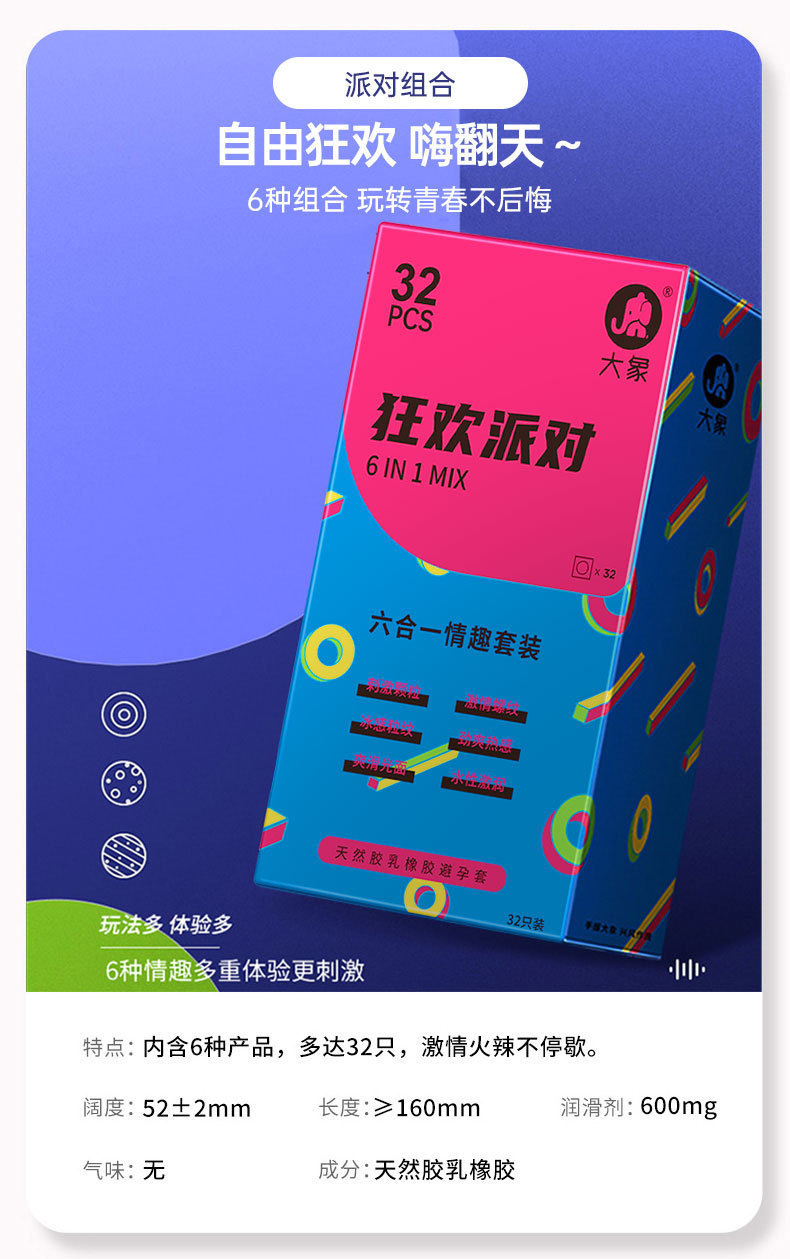 【年末亏本清仓】大象情趣系列狂欢派对款避孕他安全套 6合1 32只装