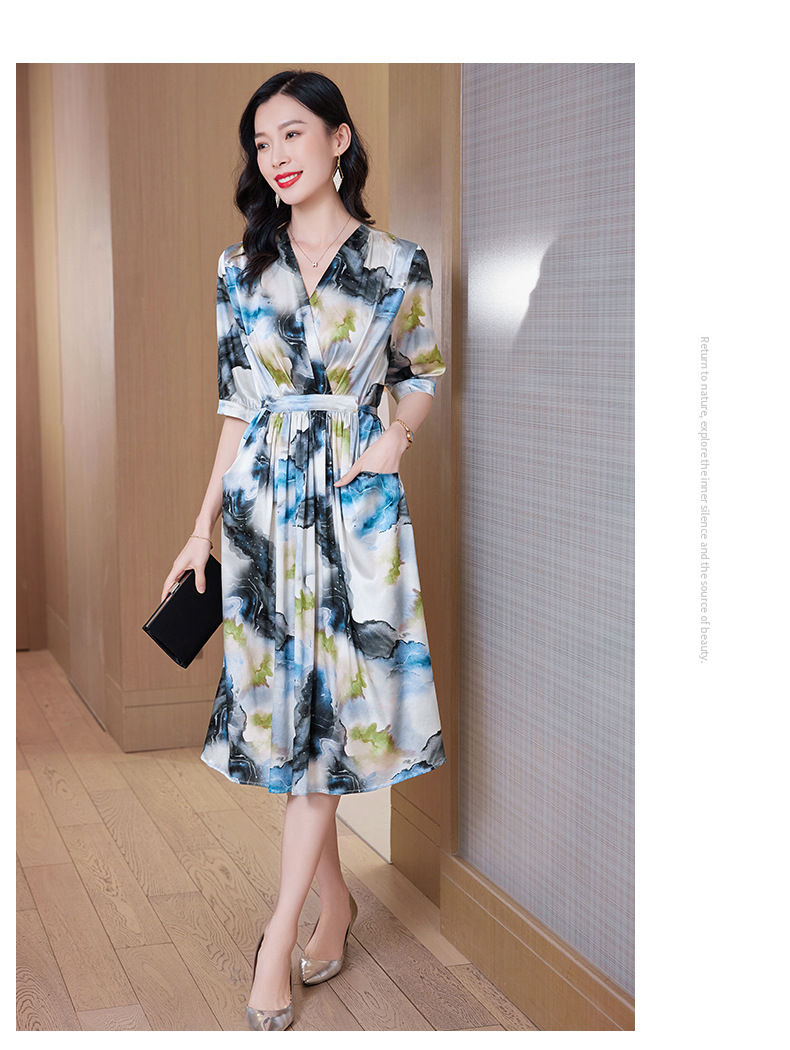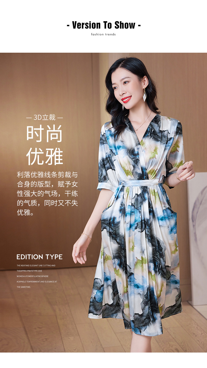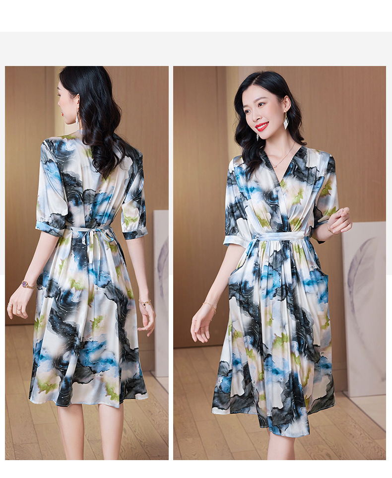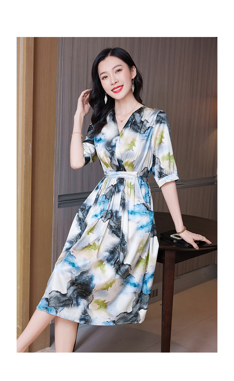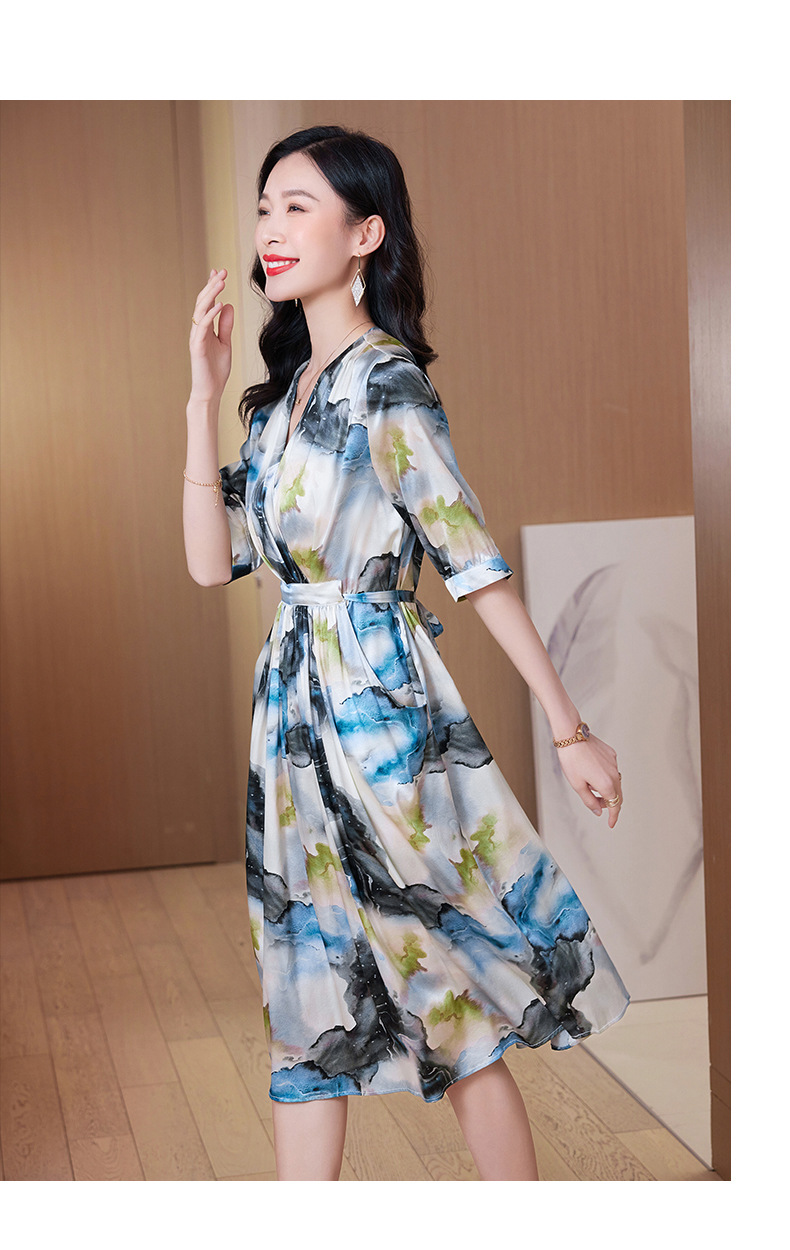 ASE-23001 复古国墨画元素桑蚕丝连衣裙夏季新款心形收腰显瘦裙子