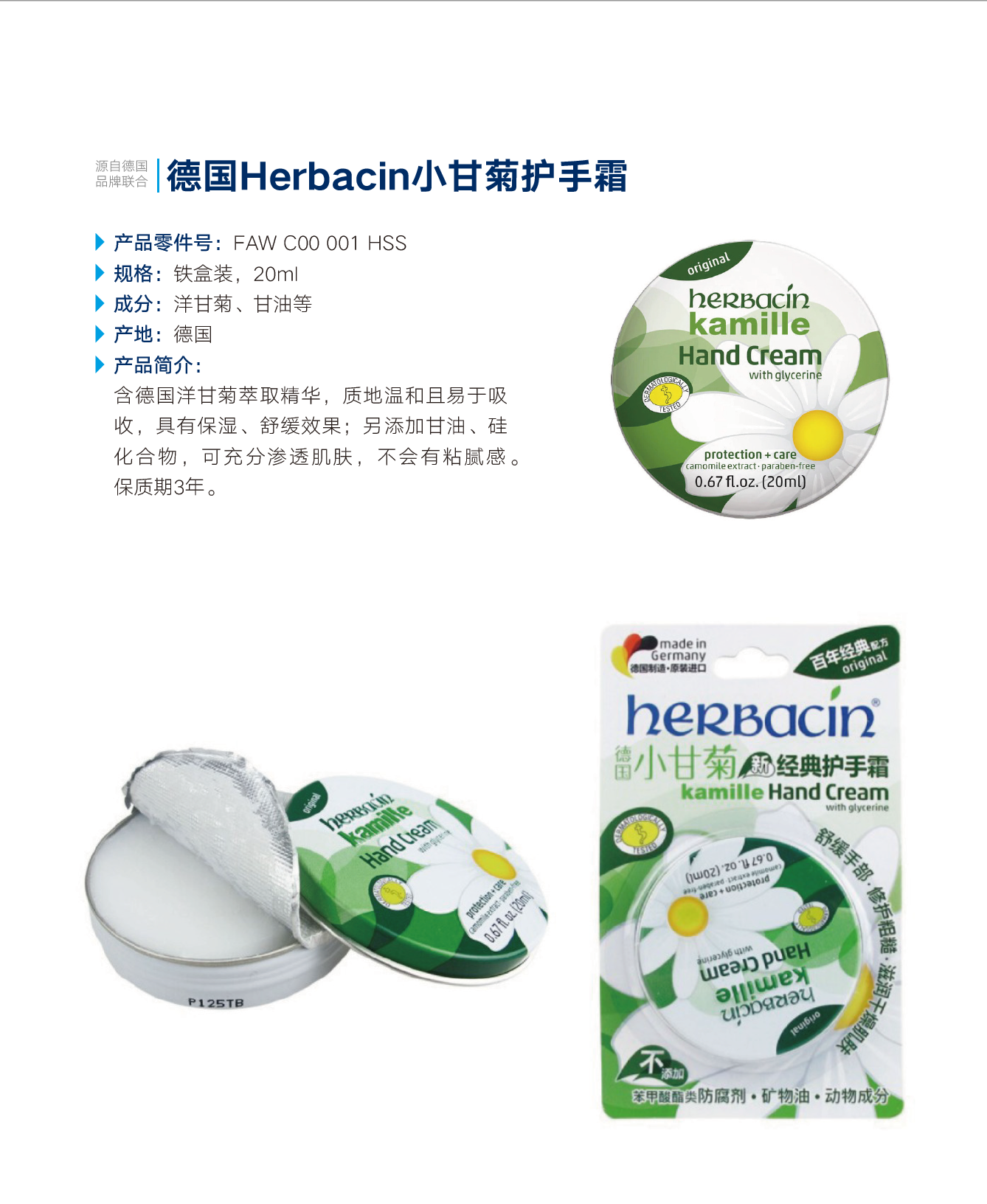 德国Herbacin小甘菊护手霜20ml(一定要备注工号,姓名,电话否则无法发货)