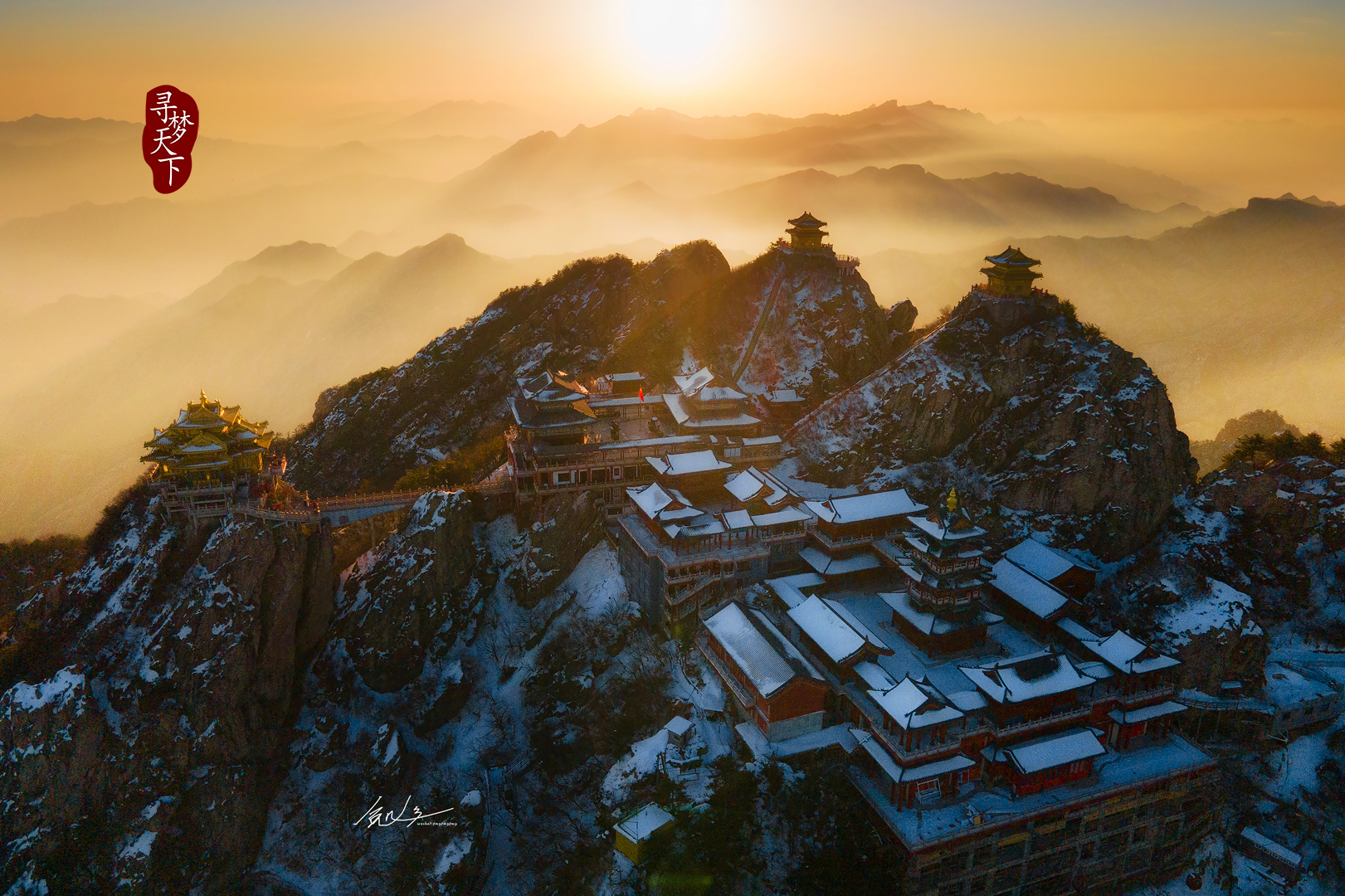 行程安排:航拍老君山峰林与日出云海,金殿犹如云上仙宫一般,让人流连忘返;下午乘车前往运城。航拍运城七彩盐湖日落;
