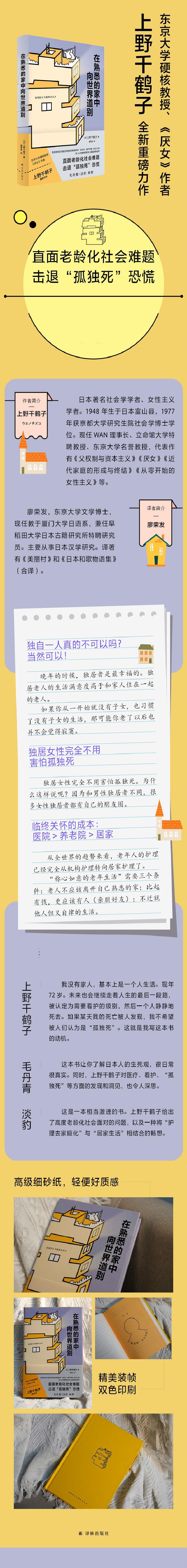 在《在熟悉的家中向世界道别》中,上野千鹤子通过对医疗、看护、护理等*新情况的全面调研,分享自己为晚年生活所做的准备,带给读者“一个人在家带着尊严离世可以实现”的信心。在老龄化社会日益临近、独居人口逐渐增多的当下,上野千鹤子的观察和心得能给我们提供一些有益借鉴。