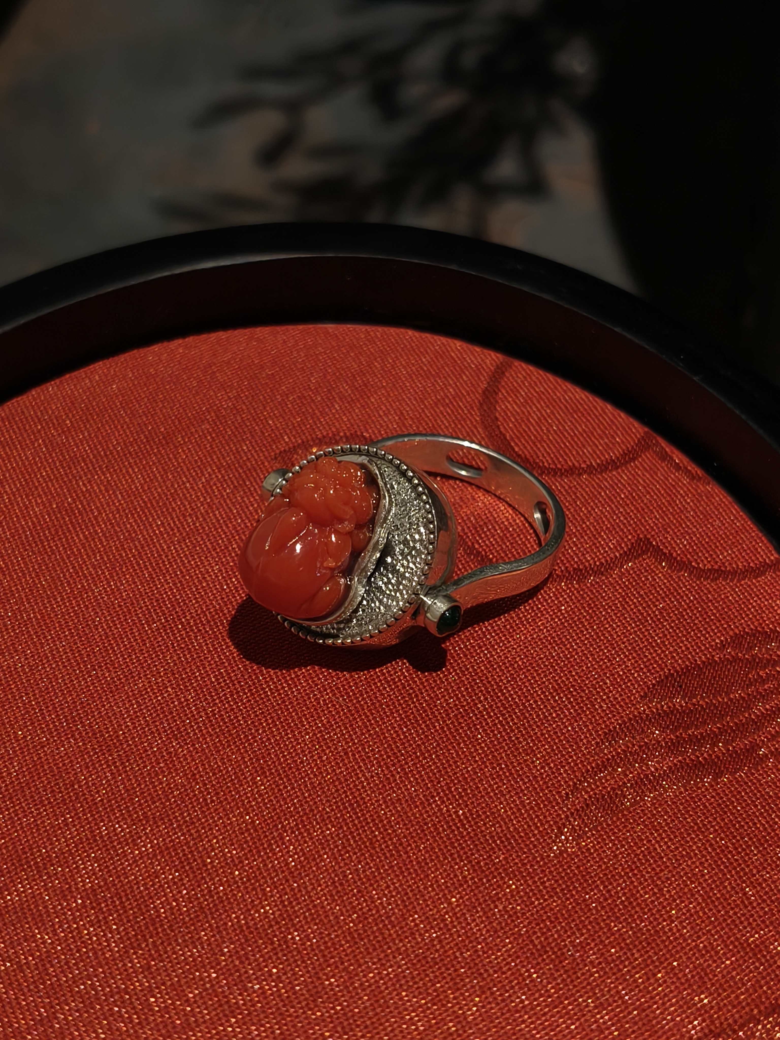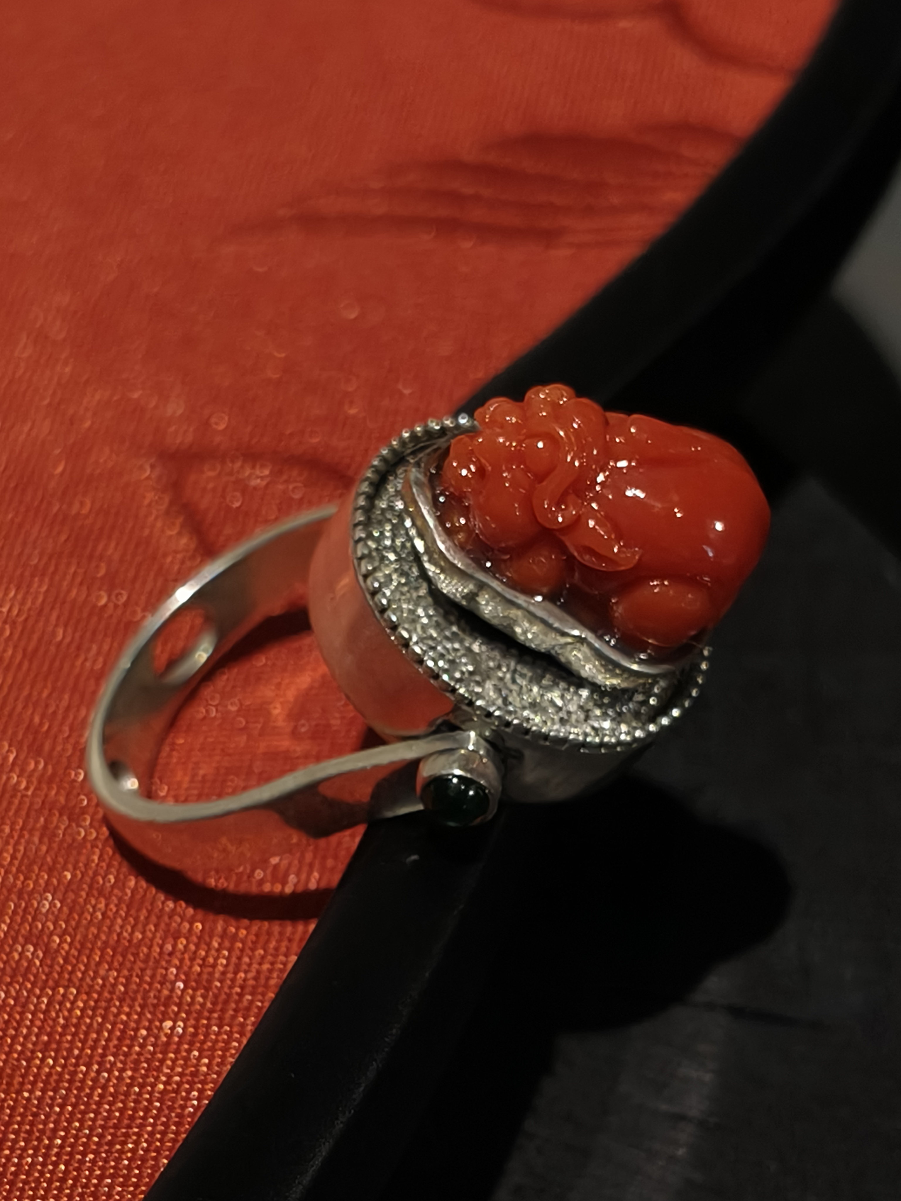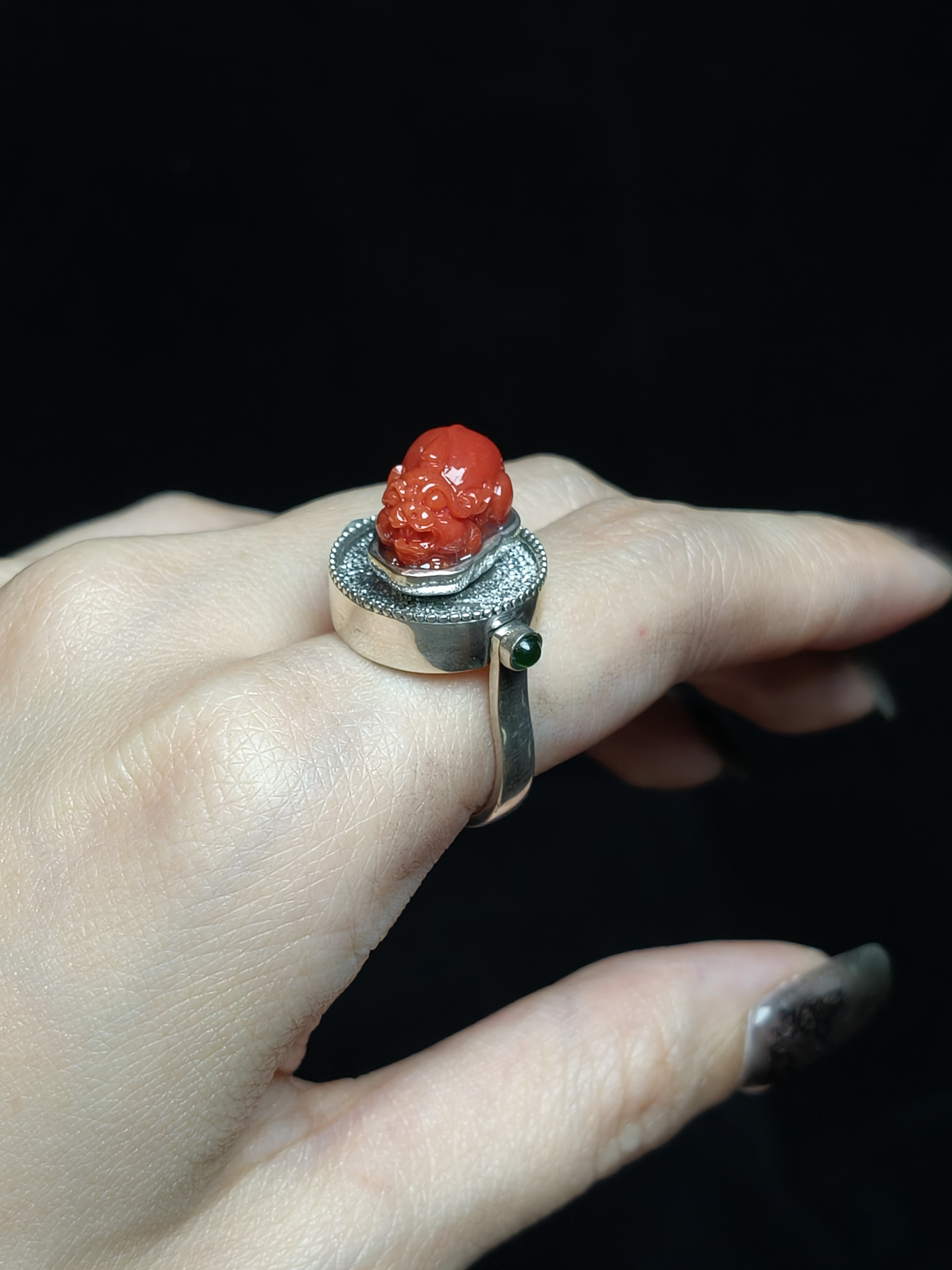 珊瑚镶嵌银饰戒指