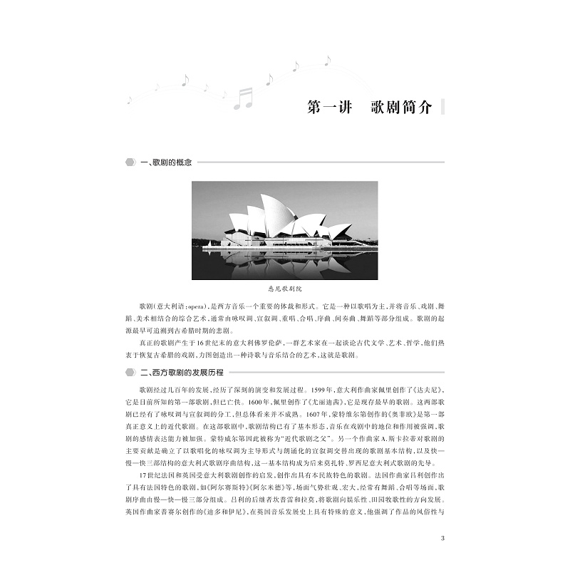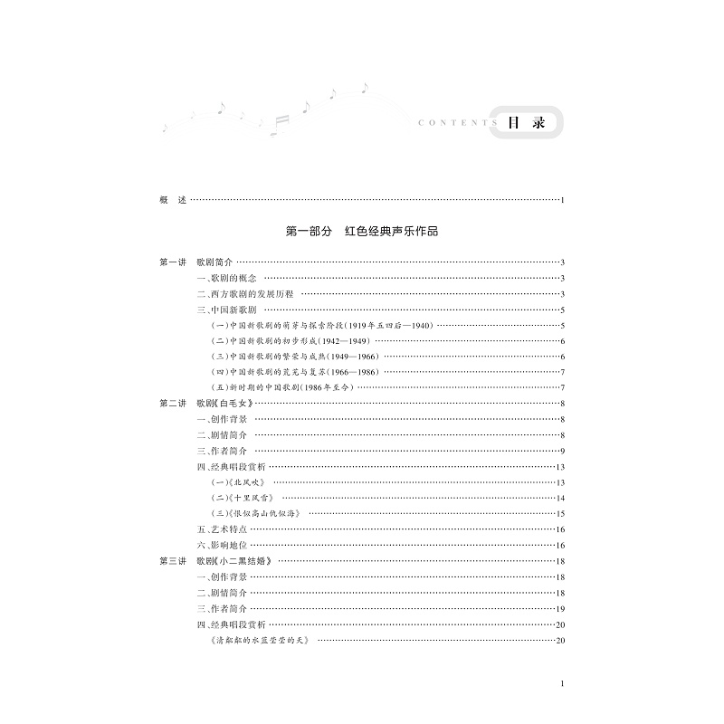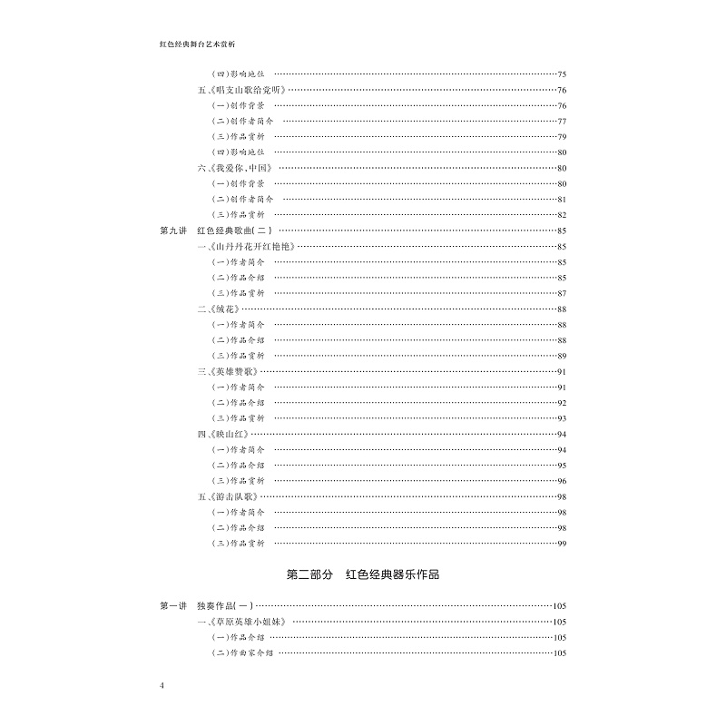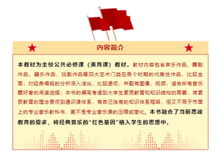 本教材为全校公共必修课(美育课)教材。教材内容包含声乐作品、舞剧作品、器乐作品、戏剧作品等四大艺术门类在各个时期的代表性作品,比较全面;对经典唱段的分析深入浅出、比较透彻,并配有图像、视频,适合所有音乐爱好者的阅读选择;本书的编写考虑到大学生素质教育和知识结构的需要,将素质教育的理念贯彻到通识课体系,有自己独有的知识体系框架,但又不同于市面上的专业音乐教科书,更不是专业音乐课的压缩或简化。本书融合了当前思政教育的需求,将经典音乐的“红色基因”植入学生的思想中。