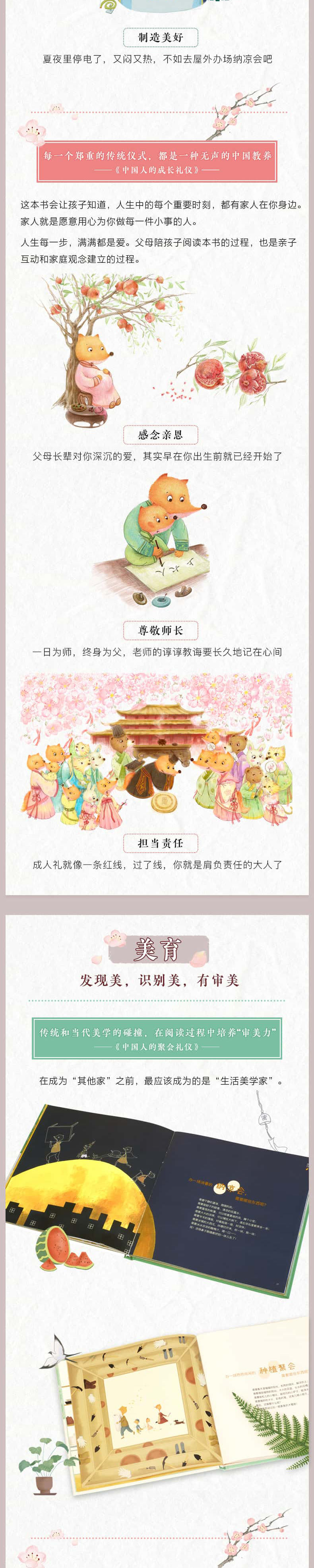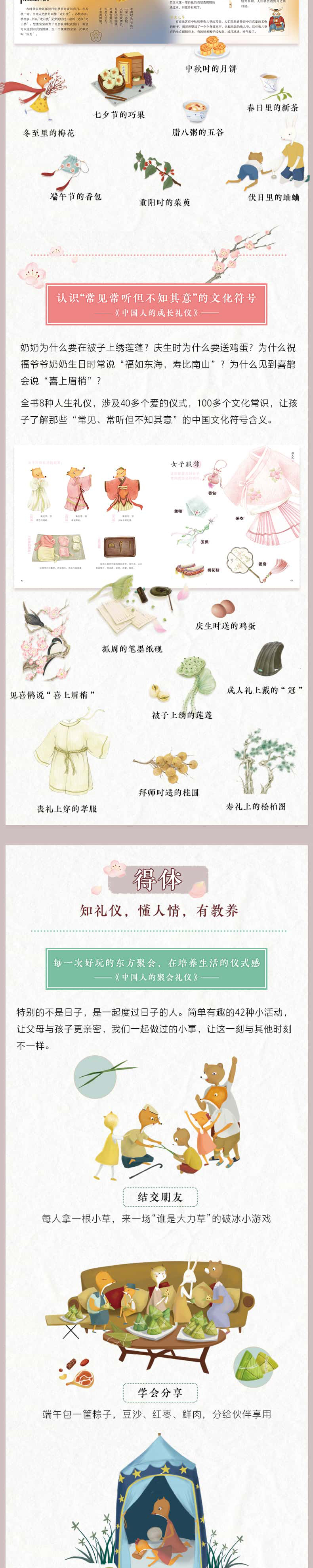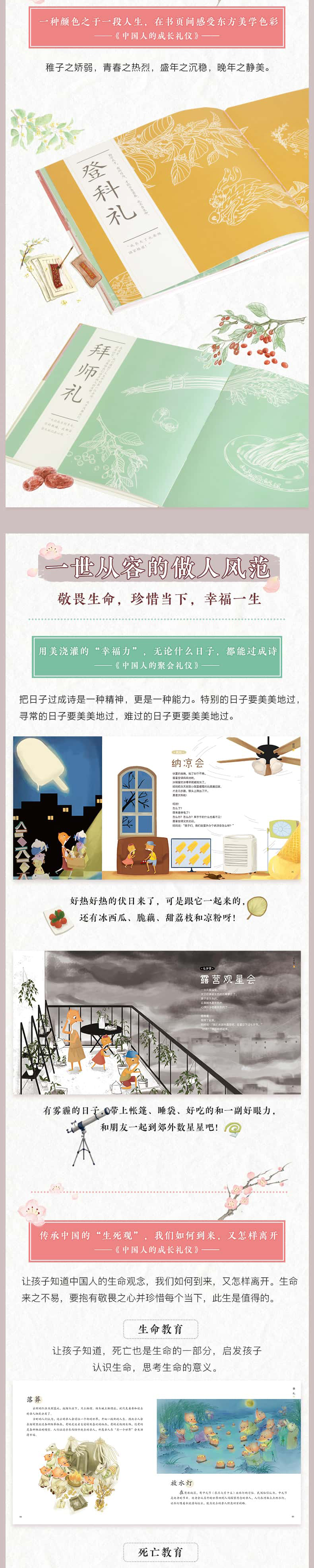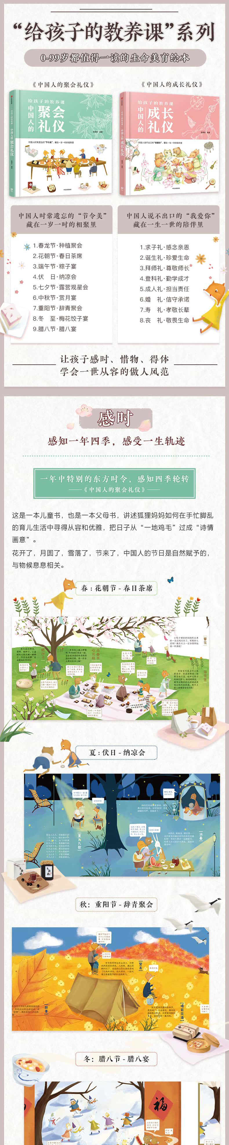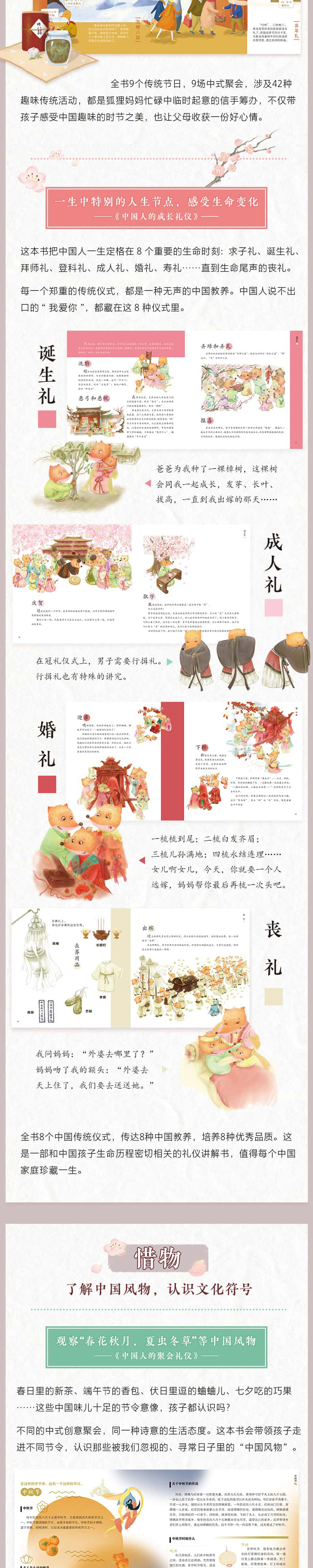 这是一套为3~9岁小朋友创作的传统文化类绘本,共2册,分别为《中国人的成长礼仪》《中国人的聚会礼仪》。图书通过中国人一生中的8个重要的成长礼仪和中国人一年中度过的9个重要节日,向孩子传达了中国人的礼仪教养、文化文明、审美情趣和生命哲学,让孩子知道生命的宝贵和生活的美好,知道应该怎样以中国人的生命精神和生活方式,更好地成长,更幸福地生活。