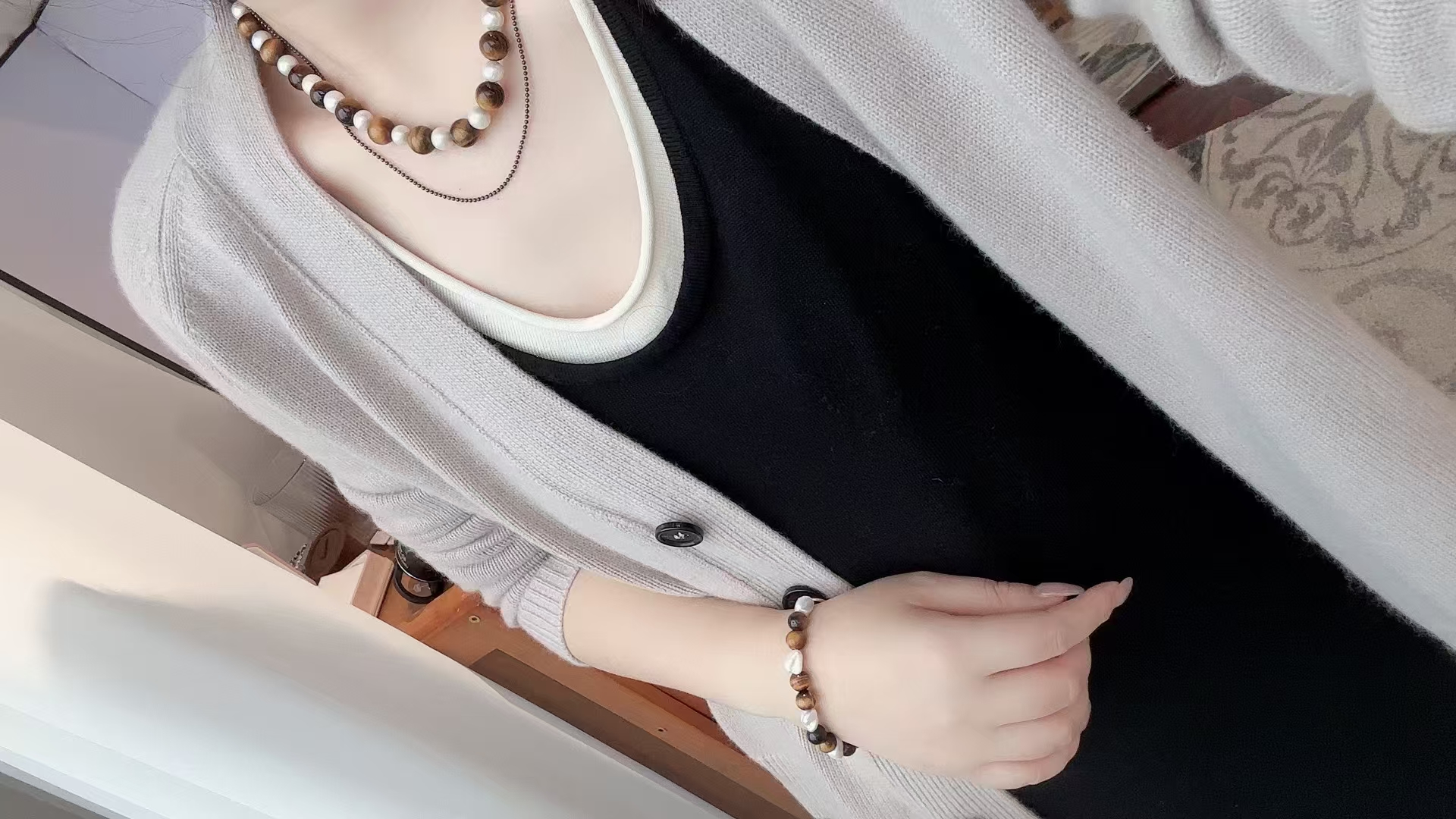 这款配的是圆珠,让我们的心情更稳,深色系珠宝,让我们内在有能量。