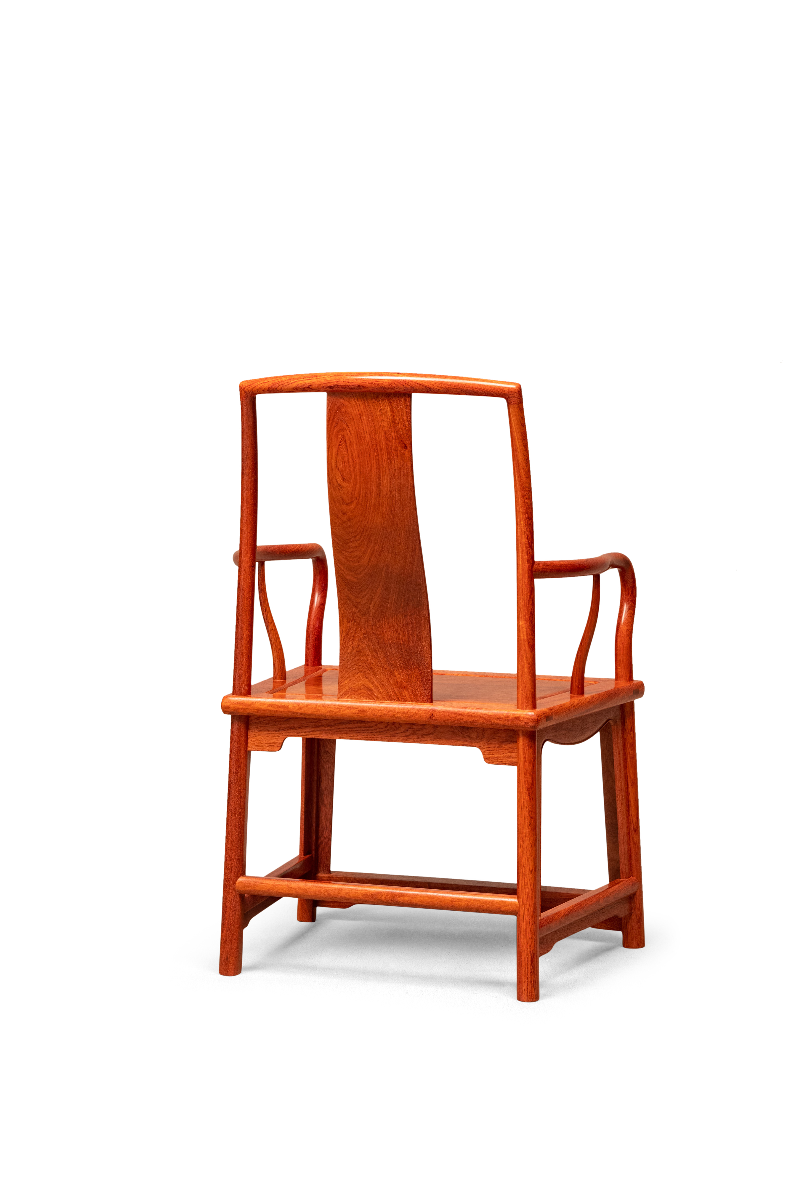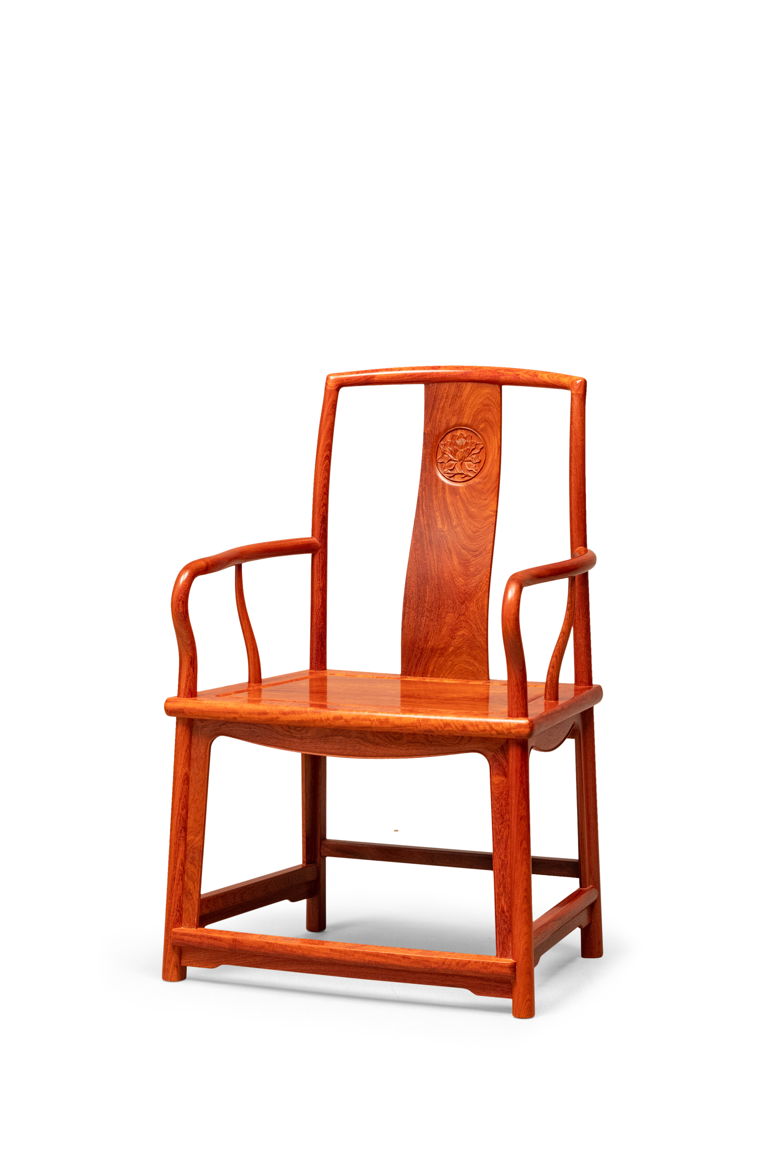 此官帽椅全身一律为素混面,只在靠背板上浮雕牡丹纹团花一窼,亦见匠心,背板宽厚有力,曲线唯美有致,纹理如水中涟漪,线条优美动感,令其娟秀雅致,妩媚多姿,纤柔其表而内含劲骨,风采与气概兼而有之,非常难得。大边弧度向前凸出,平面作扇面形,搭脑的弧度则向后凸,与大边的方向相反。座面前宽后窄,足够宽大,盘腿而坐也可,椅盘下三面安“洼膛肚”券口牙子,沿边起肥满的“灯草线”,这种回婉的曲线,使上下和谐一致,四足外挓,侧脚显著,管脚枨下安素牙子,整体造型舒展大气,气质俊朗、洒脱。