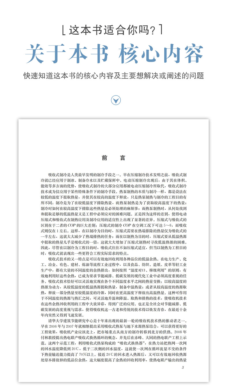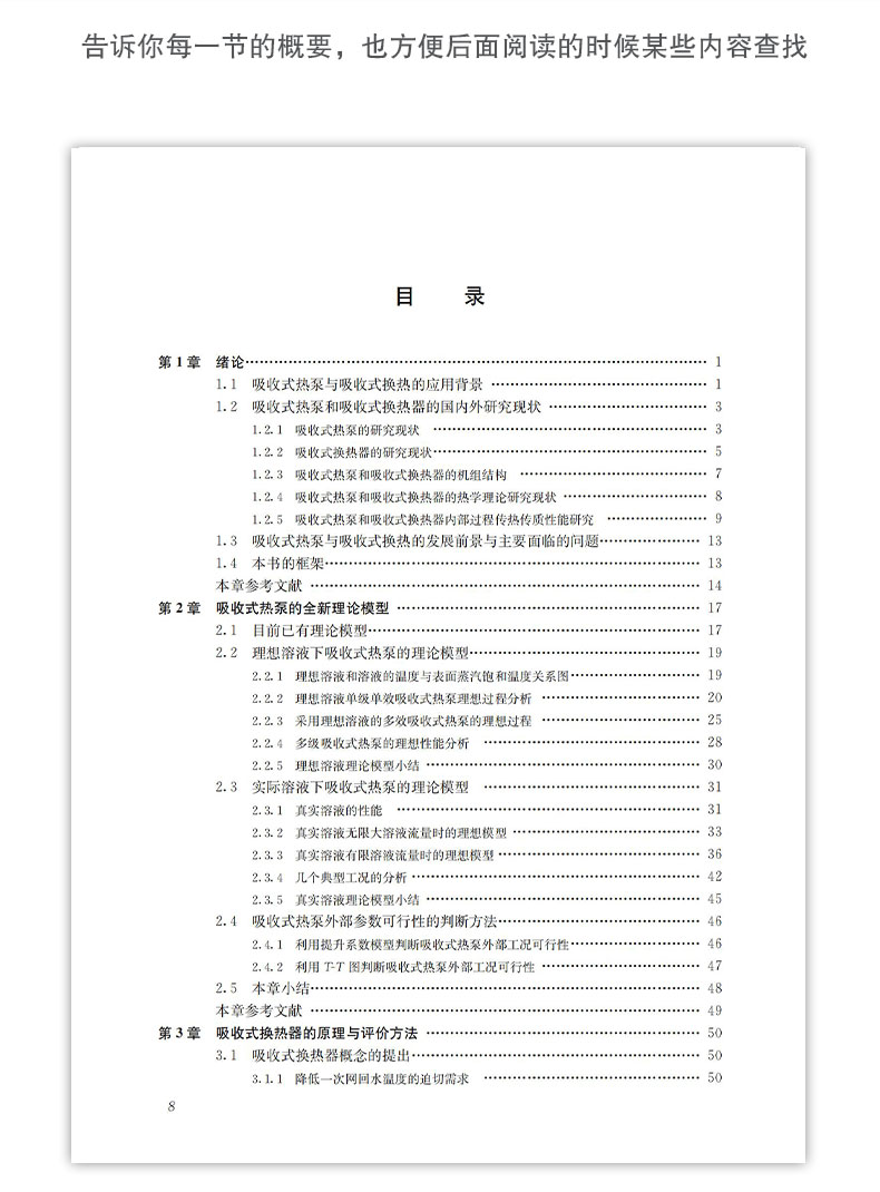 吸收式换热的理论体系建立、新流程研究、新结构研发、内部传热传质过程的深入认识与强化成为理论研究进而指导工程应用的迫切需要。目前吸收式换热技术在理论研究、设备研发和工程应用上都取得了较大的进展和成果,应向外界报道最新的成果,从而使相关领域的工程师和学者深入了解这项新技术,并指导其做相关的系统设计,从而推进这一项新技术的正确推广和应用。 本书主要内容包括:吸收式热泵的应用背景、国内外研究现状以及所面临的问题;吸收式热泵的理论模型;吸收式换热器的原理与评价方法;真空环境下吸收式热泵的传热传质和流动过程;吸收式换热的设备研发与基本性能;吸收式换热的运行调节与控制。